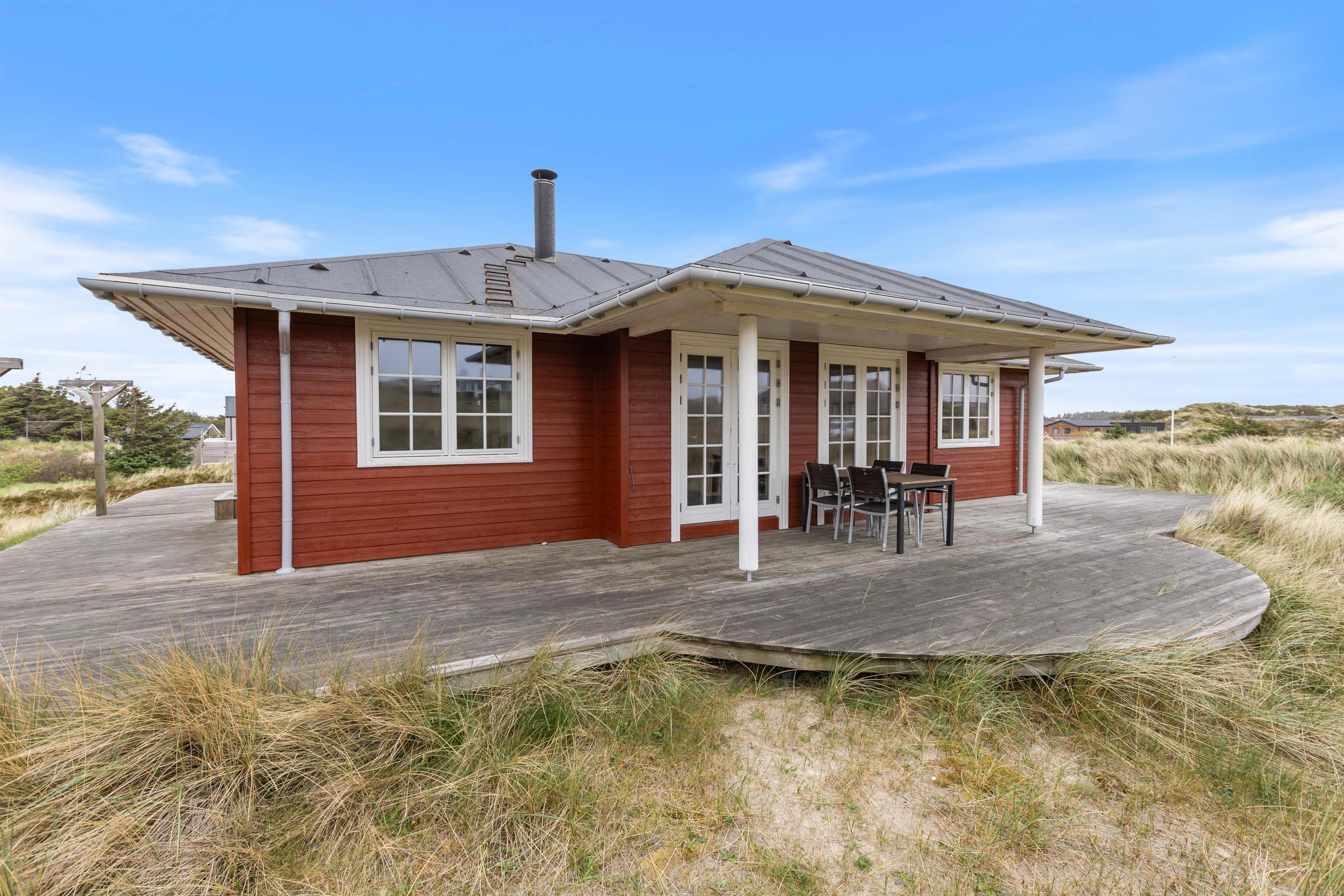 The house stands close to the North Sea on stunning natural grounds, offering excellent views of the surrounding area. A beautiful terrace wraps around this attractive red house.