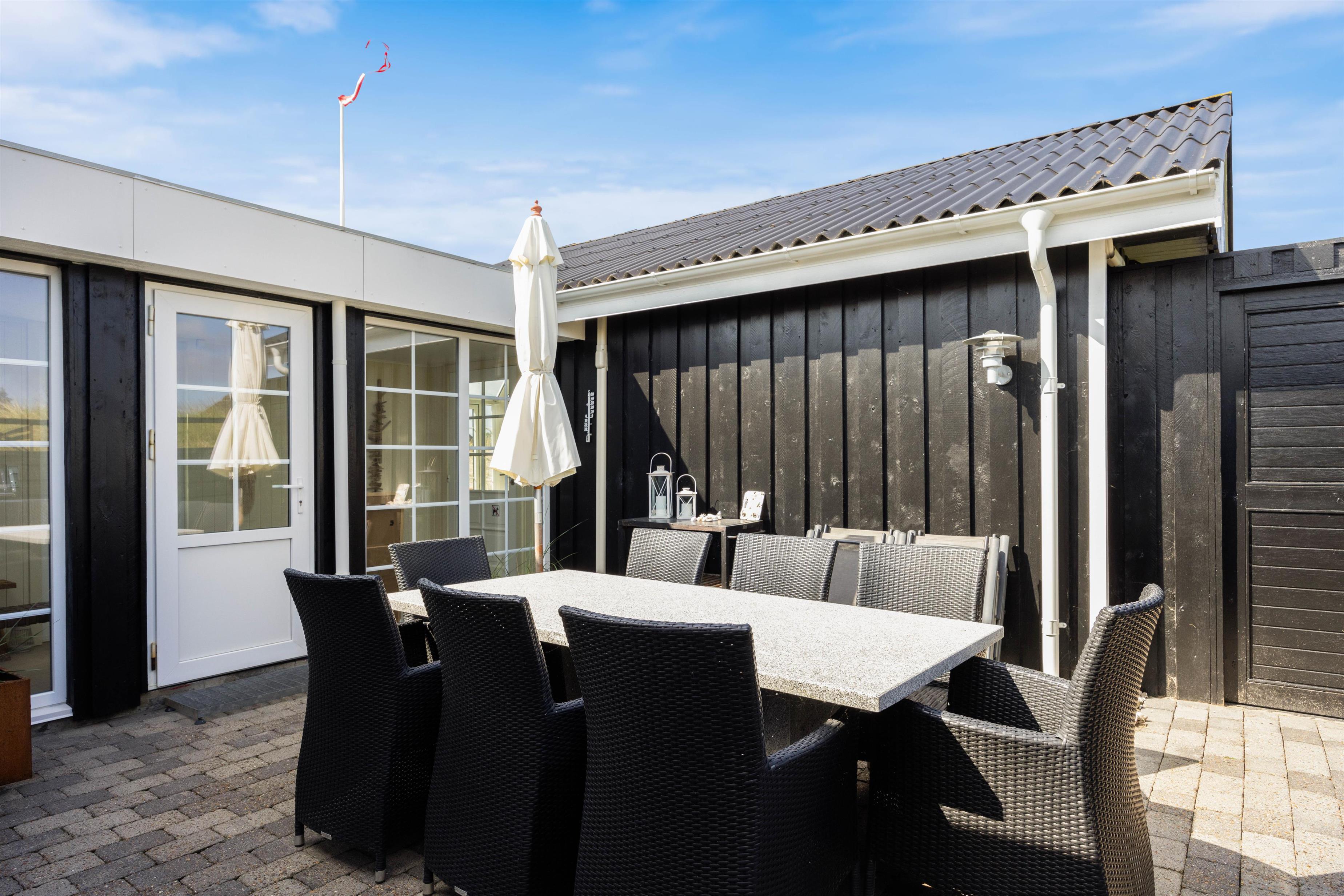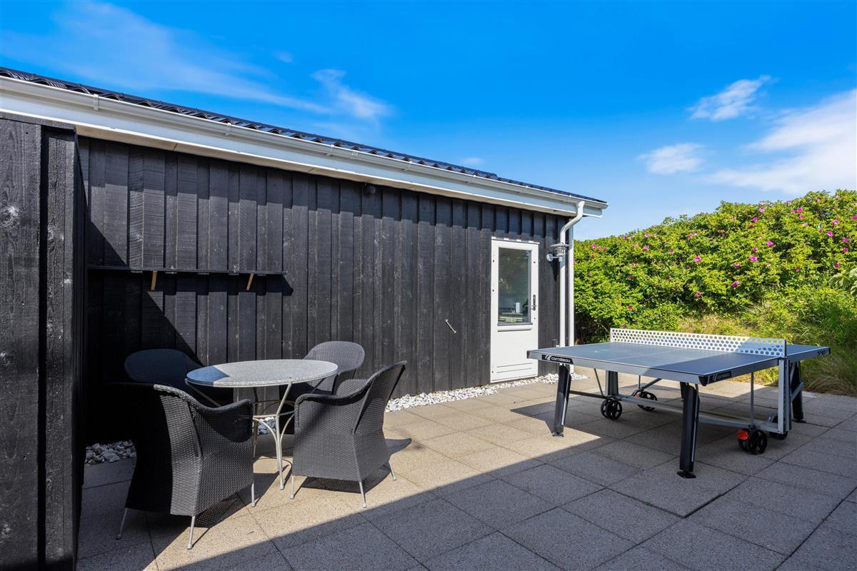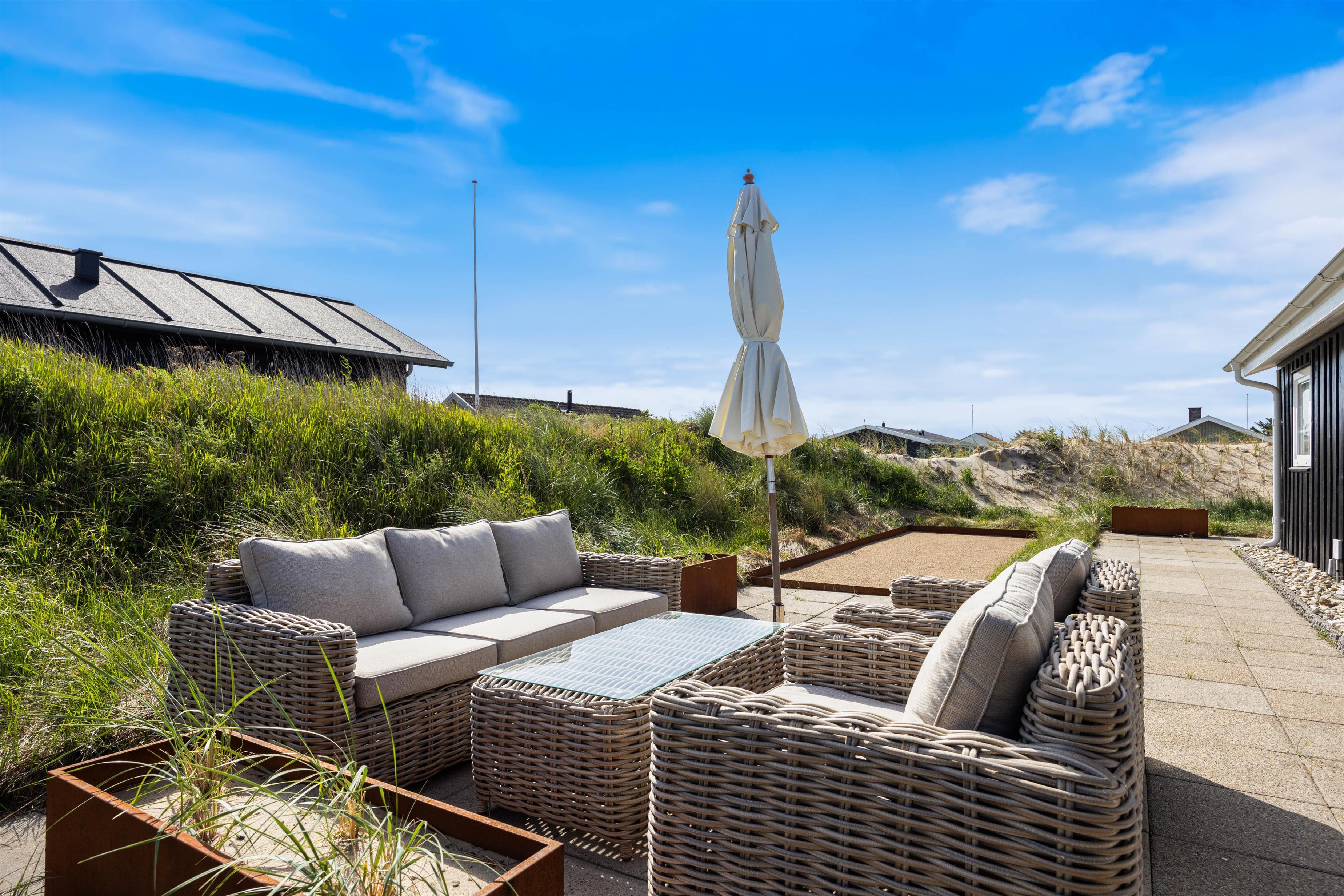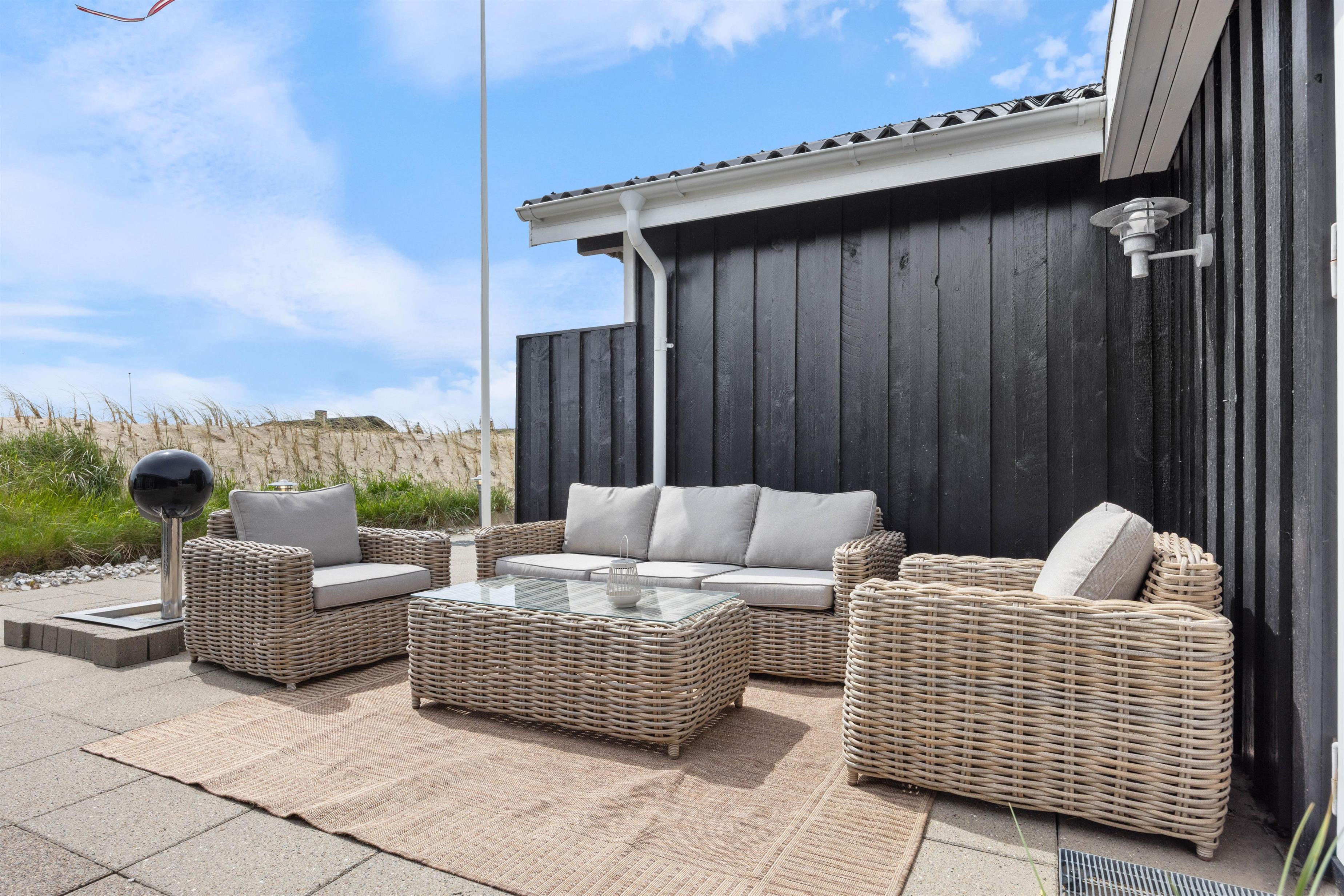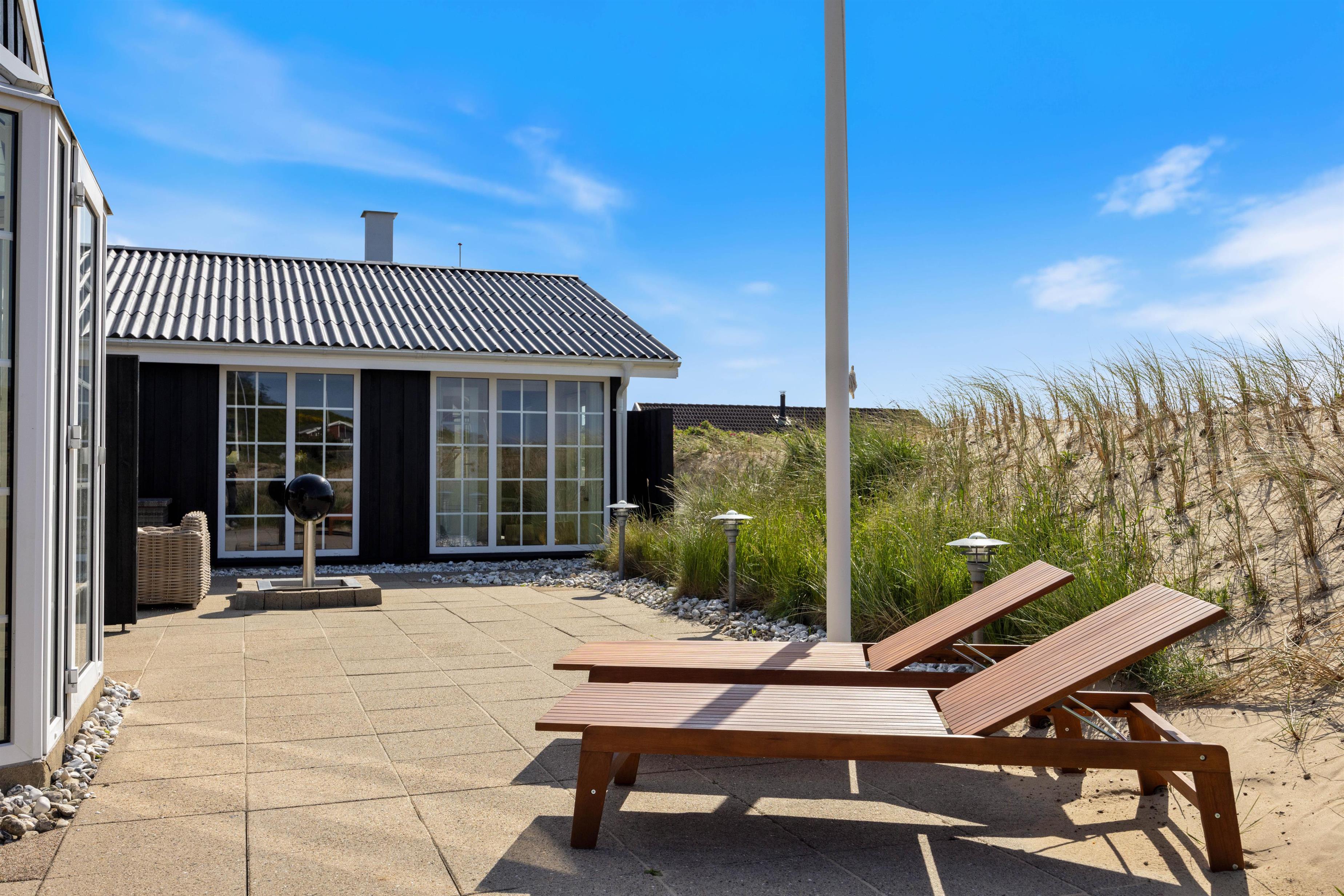 Es gibt mehrere Terrassenbereiche und Loungemöbel um an sonnigen Tagen, unabhängig von der Windrichtung und Tageszeit ein Plätzchen finden, um Vitamin D zu tanken. Außerdem verfügt das Ferienhaus über eine Außendusche, die von Mai bis Oktober genutzt werden kann, ideal um sich nach dem Strandspaziergang den Sand abzuspülen. Damit das Wellnessgefühl auch im Freien bestehen bleibt, hat die Außenduschee warmes und kaltes Wasser.