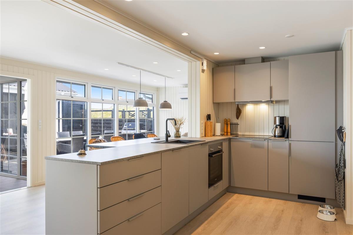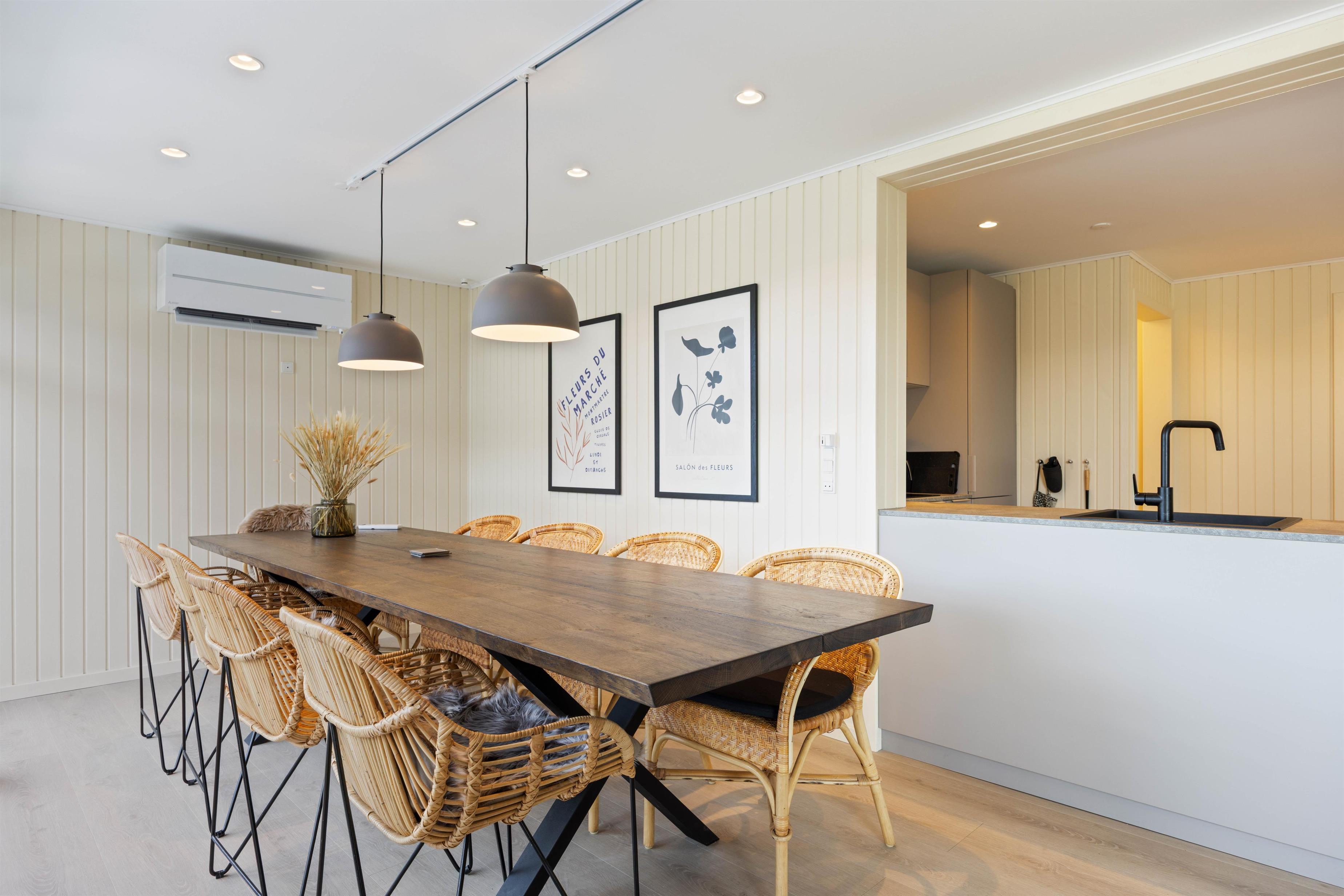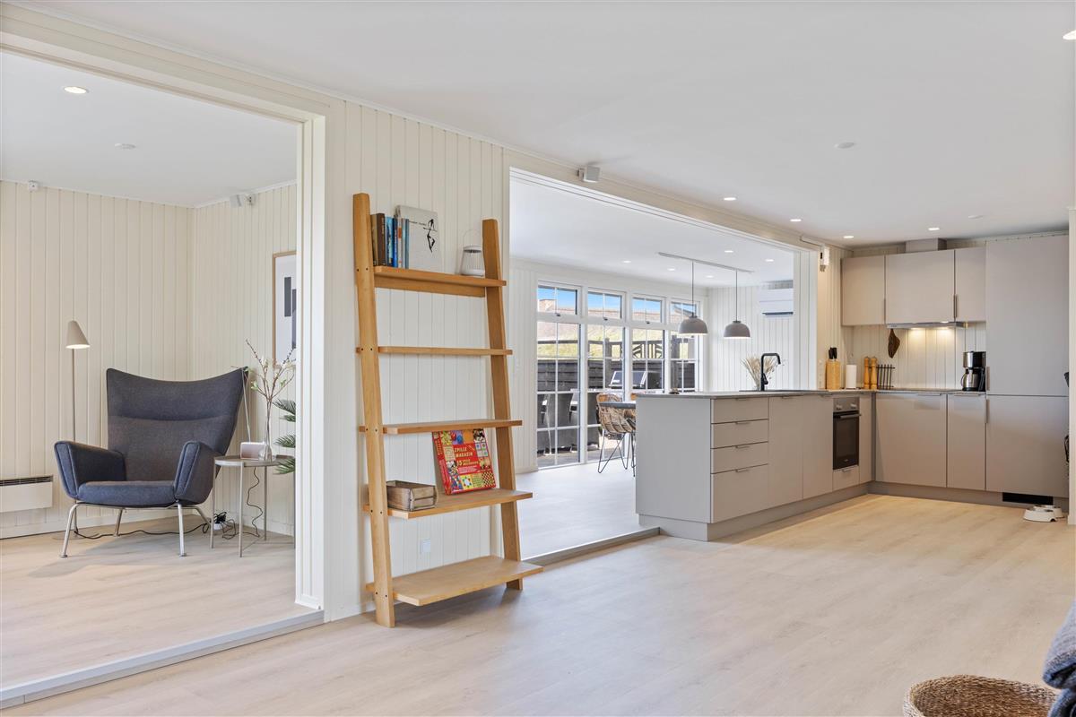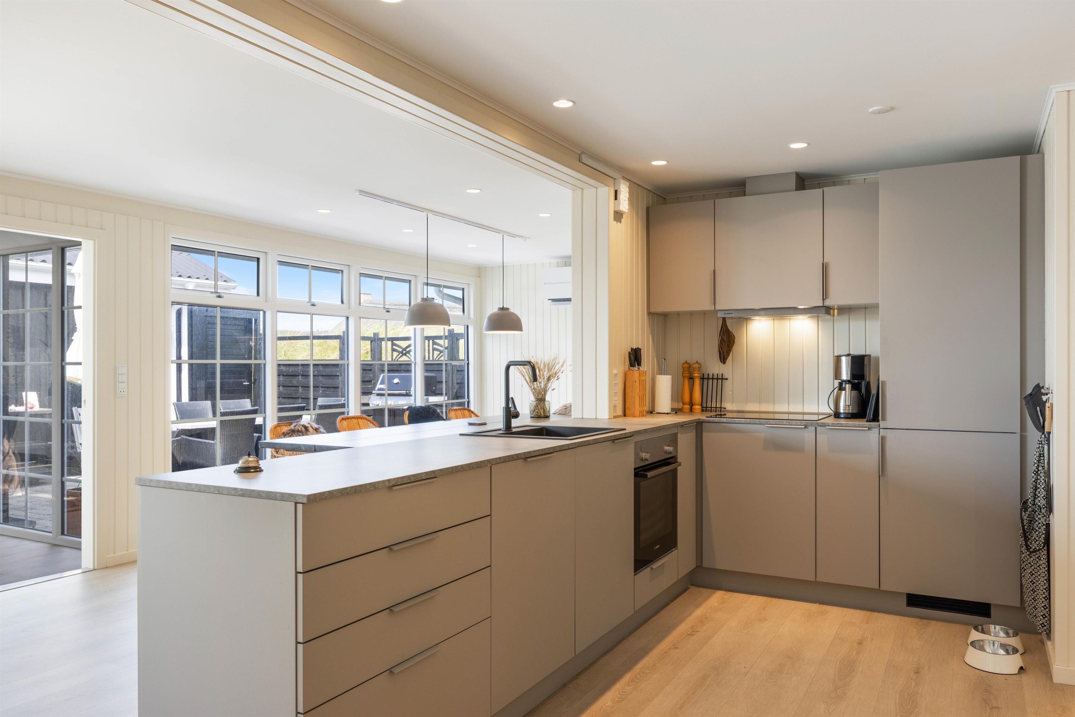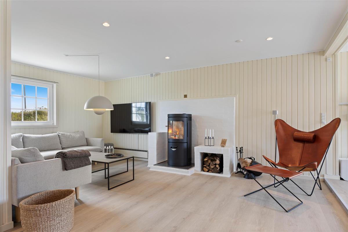 Das Ferienhaus wurde mit viel Liebe zum Detail eingerichtet und spiegelt dennoch den skandinavischen Stil wider. Die vielen modernen Elemente runden das Ganze ab. Der große Wohnbereich bietet Platz für alle Gäste. Hier könnt ihr viel gemeinsame Zeit miteinander verbringen. Sei es am Esstisch, in der Küche, in der ihr gemeinsam kochen könnt oder das große Sofa, auf dem ihr es euch am Abend vor dem Fernseher gemütlich machen könnt. Die Küche ist nicht nur neu und gut ausgestattet, sondern verfügt auch über einen Geschirrspüler. Um die Gemütlichkeit noch zu steigern, lohnt es sich an kühleren Tagen den Holzofen anzuzünden und sich bei einem guten Buch von der Atmosphäre und der Wärme einfangen zu lassen. Um den Geldbeutel zu schonen, wurde gibt es eine Luft-zu- Luft Wärmepumpe