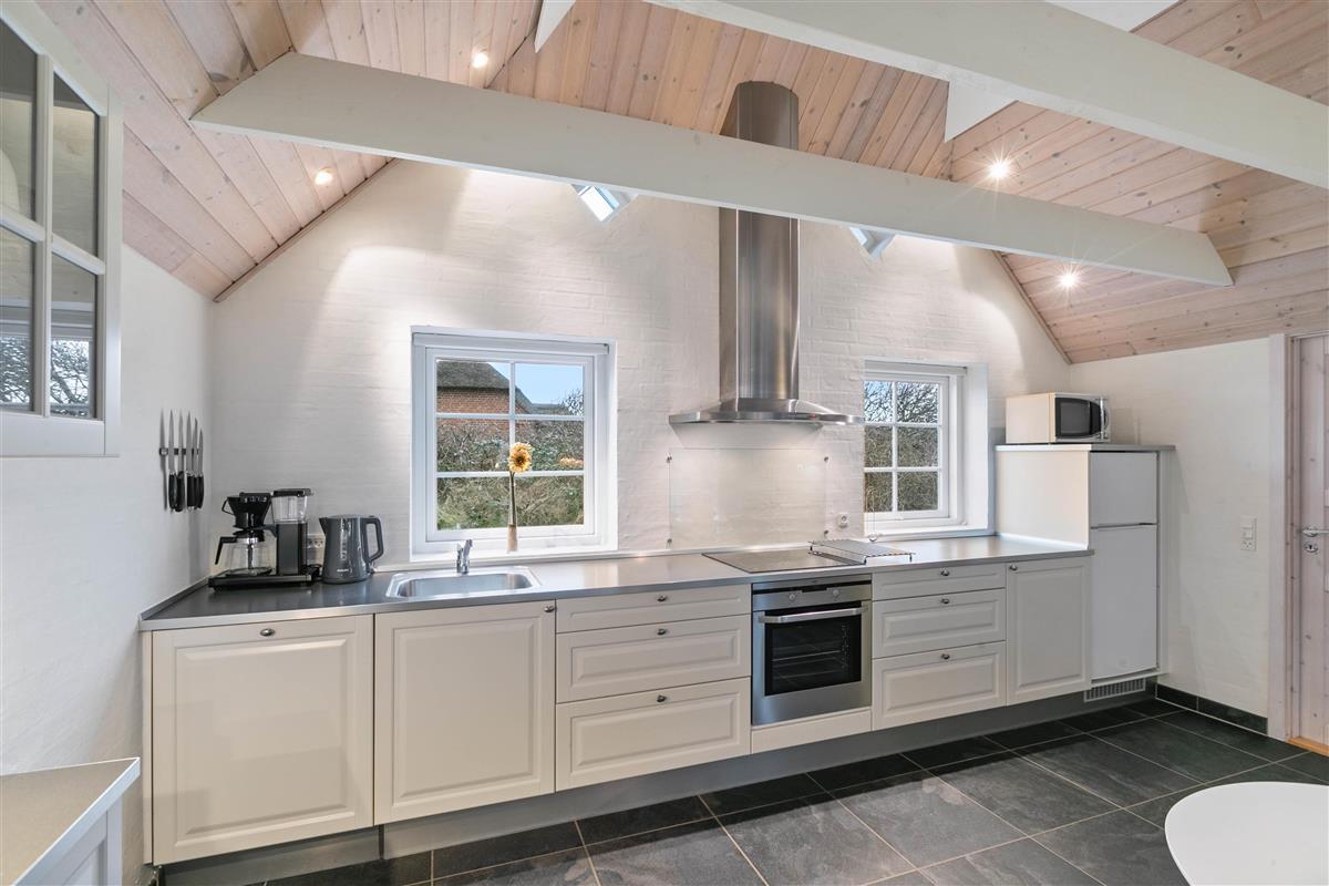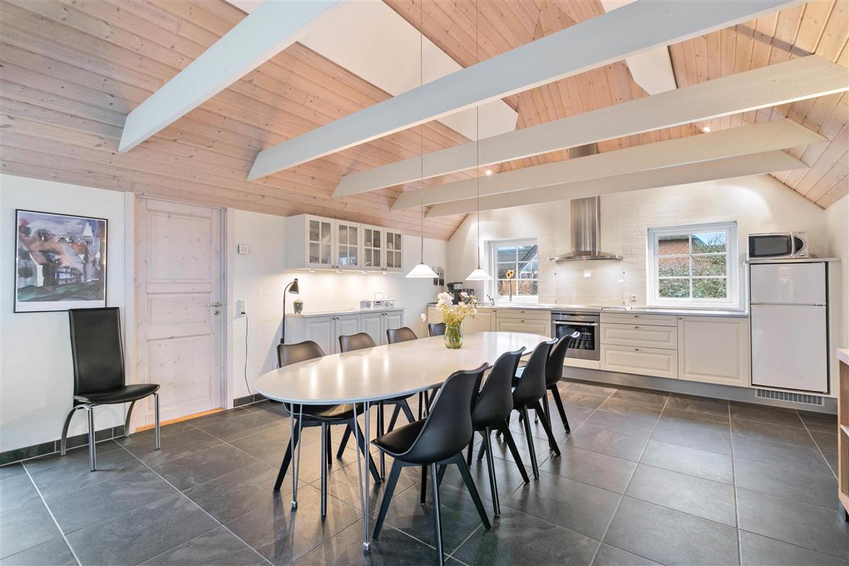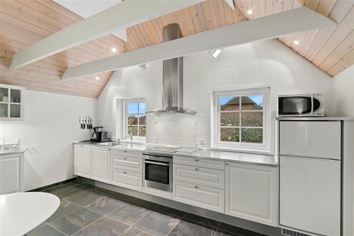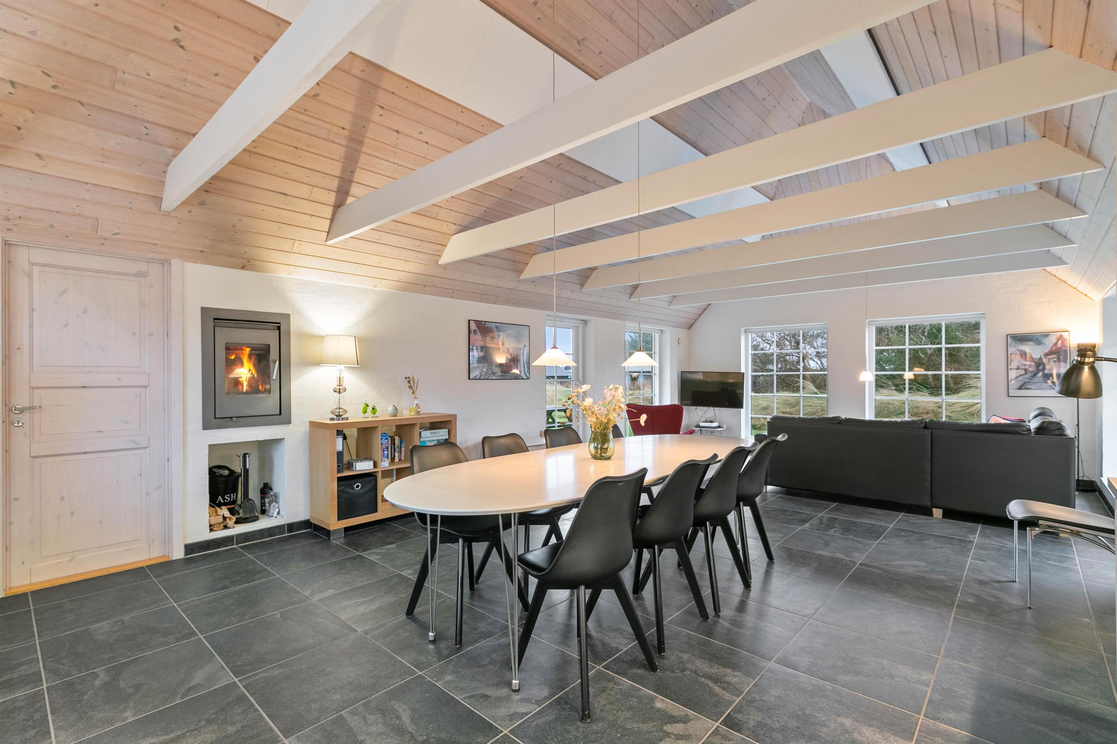 The house is perfectly divided into two areas. The kitchen is large and spacious, featuring a fridge-freezer, microwave and dishwasher. The dining area is centrally located, where you can also enjoy the stylish built-in wood-burning stove, providing a cosy atmosphere and comfortable temperatures throughout the space.