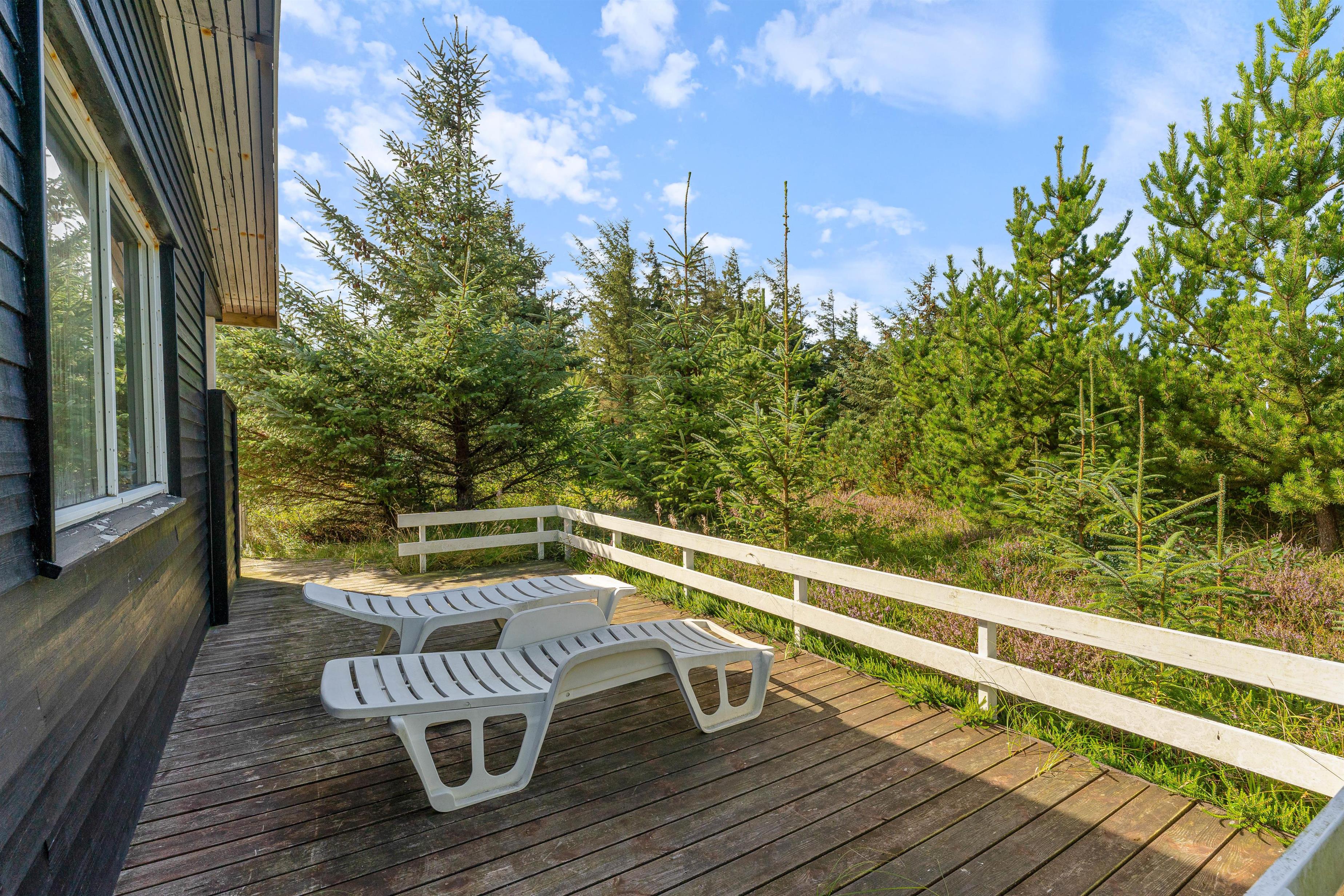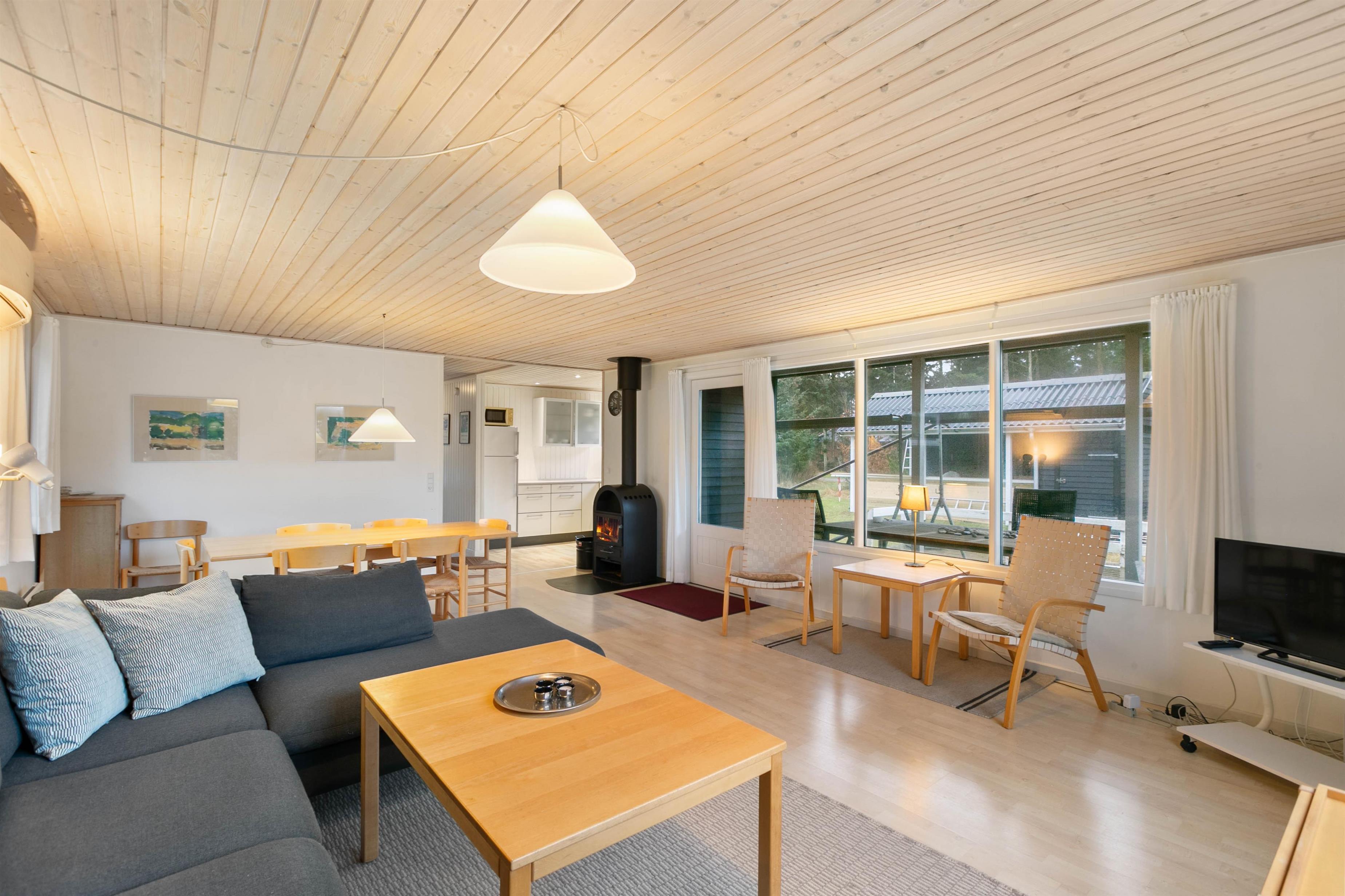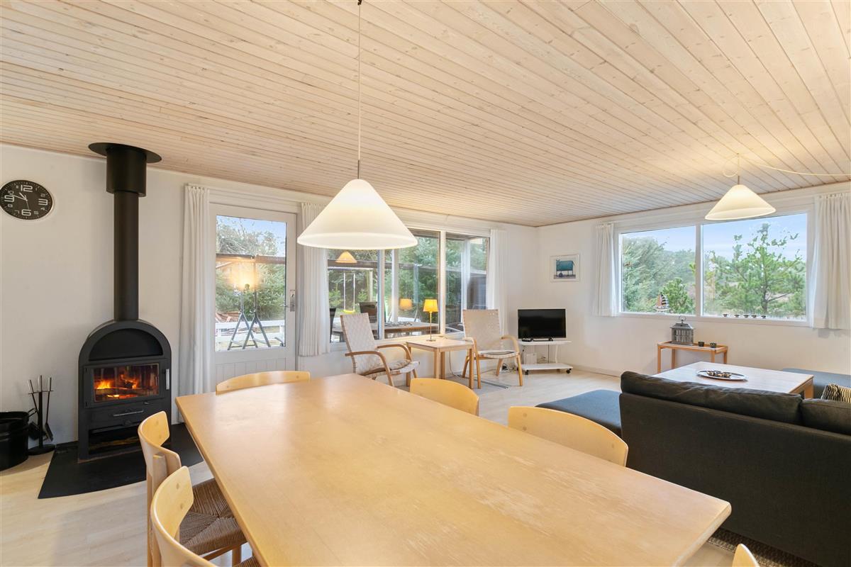 At the heart of the holiday home, the living room features a wood-burning stove and comfortable seating. Large windows flood the room with natural light and offer lovely views over the 2,286-square-metre natural plot. An open terrace and partially covered terrace provide ample space to enjoy the fresh air and beautiful surroundings - whether for breakfast or evening barbecues.