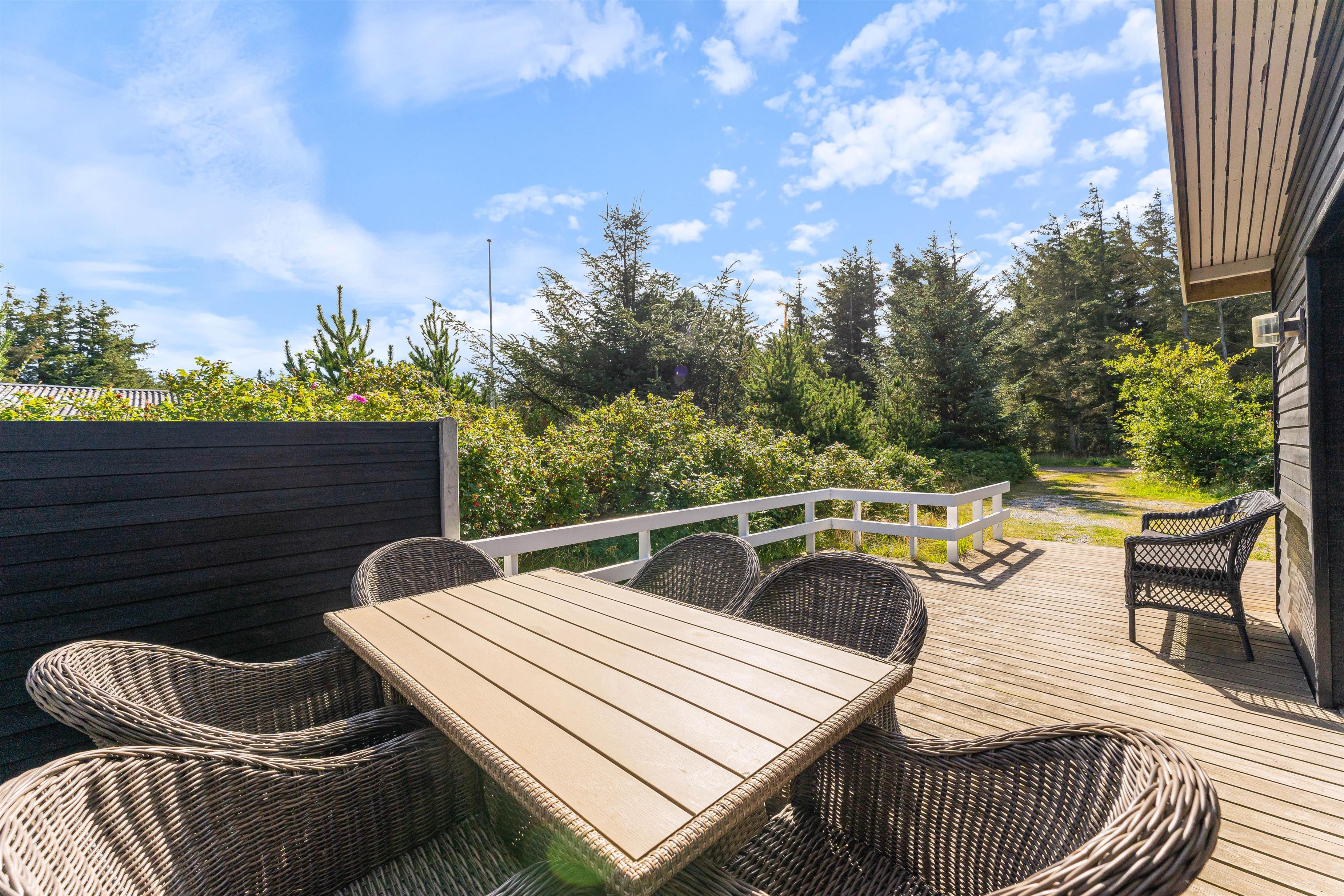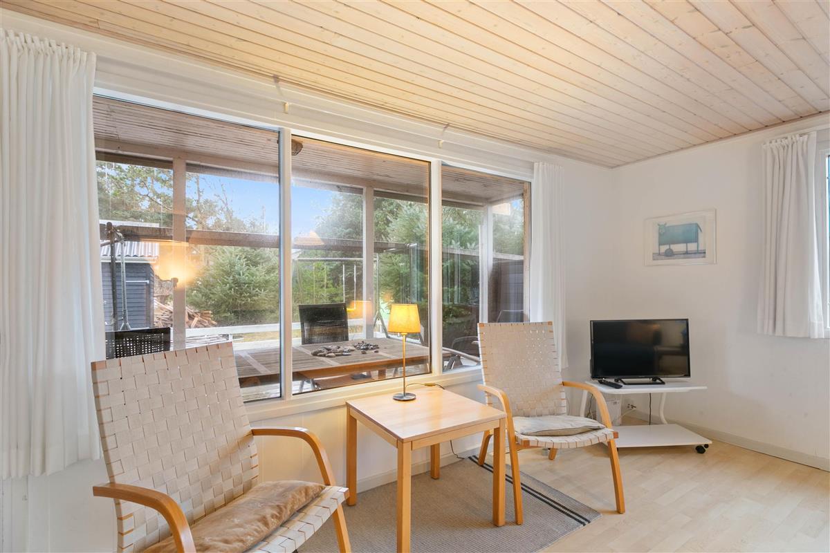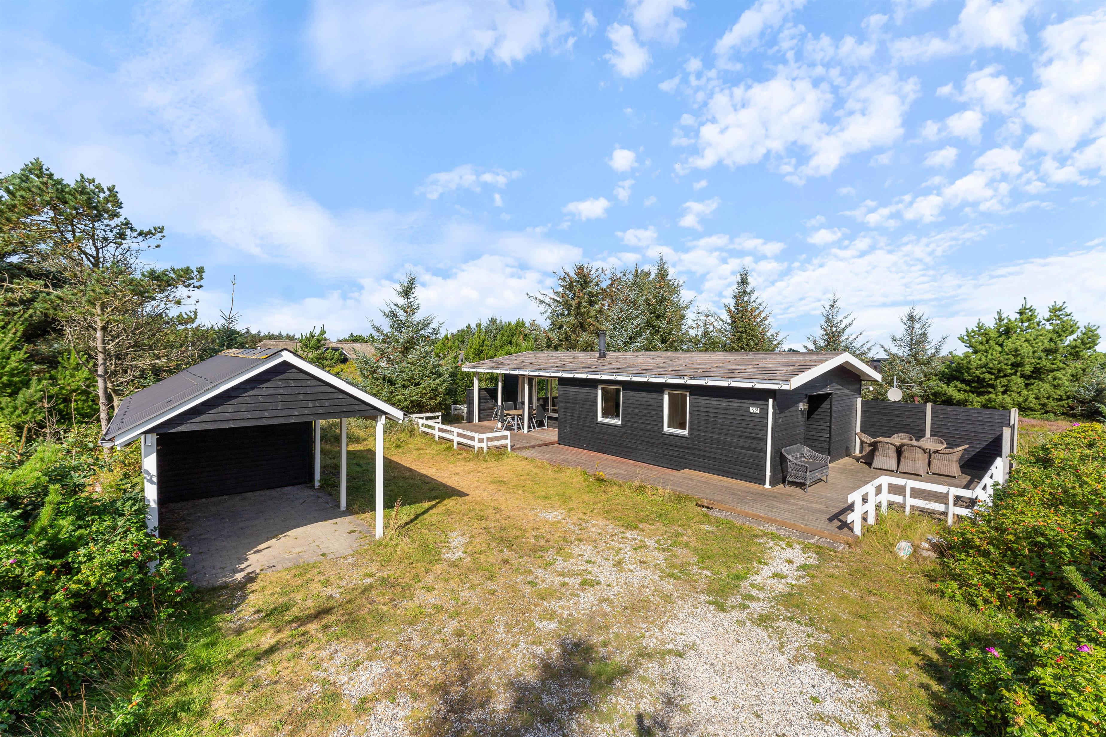 At the heart of the holiday home, the living room features a wood-burning stove and comfortable seating. Large windows flood the room with natural light and offer lovely views over the 2,286-square-metre natural plot. An open terrace and partially covered terrace provide ample space to enjoy the fresh air and beautiful surroundings - whether for breakfast or evening barbecues.