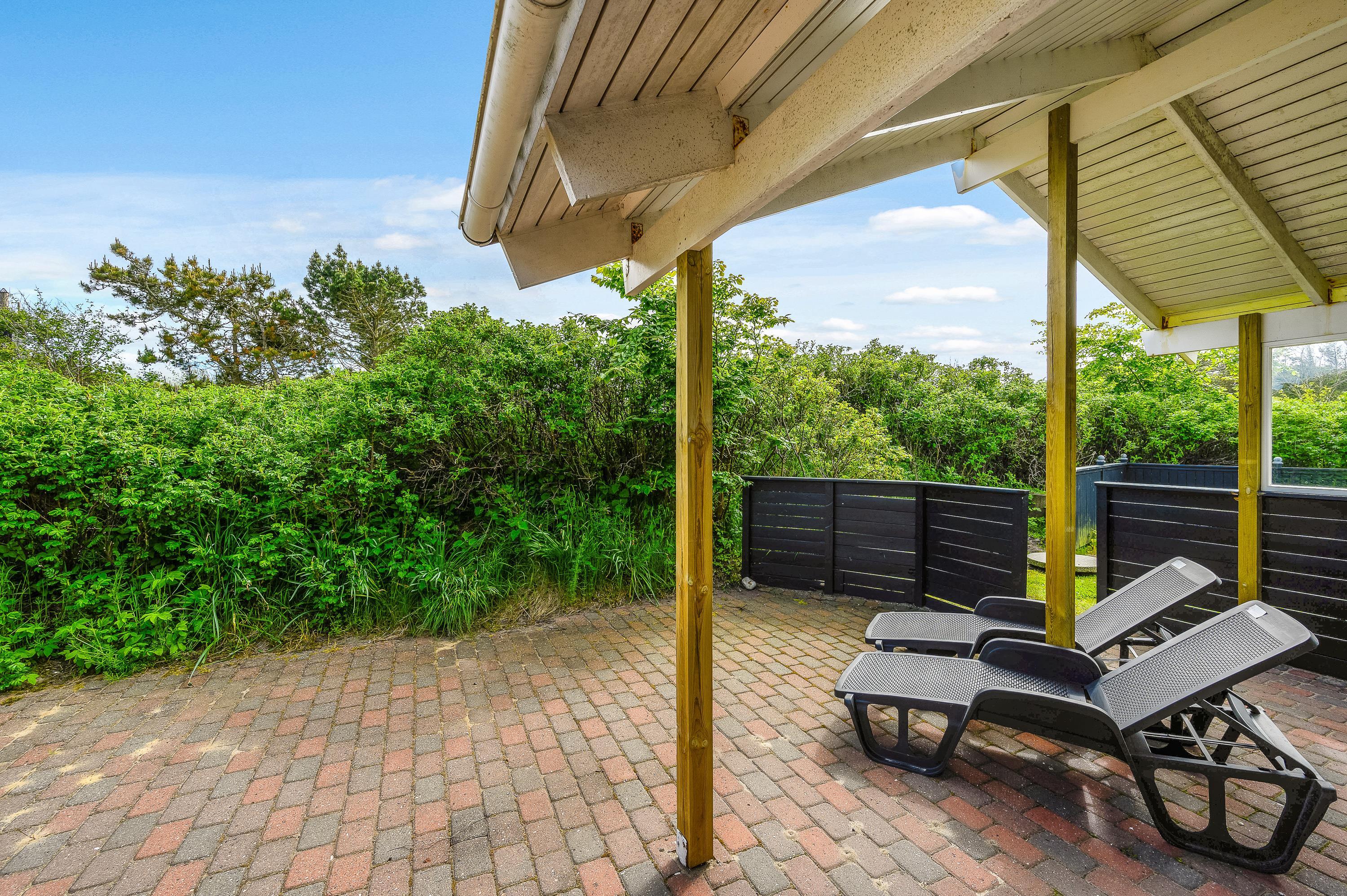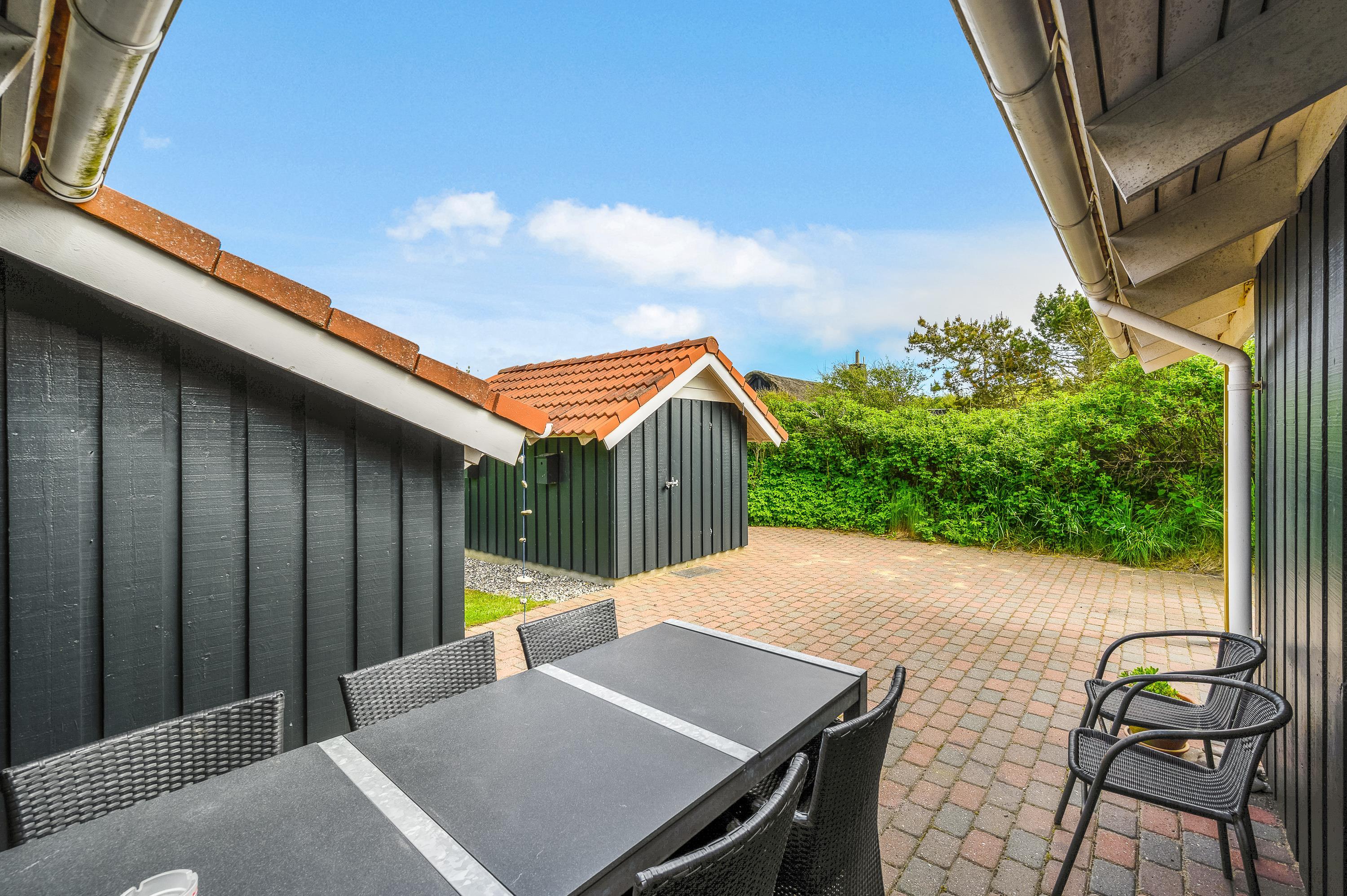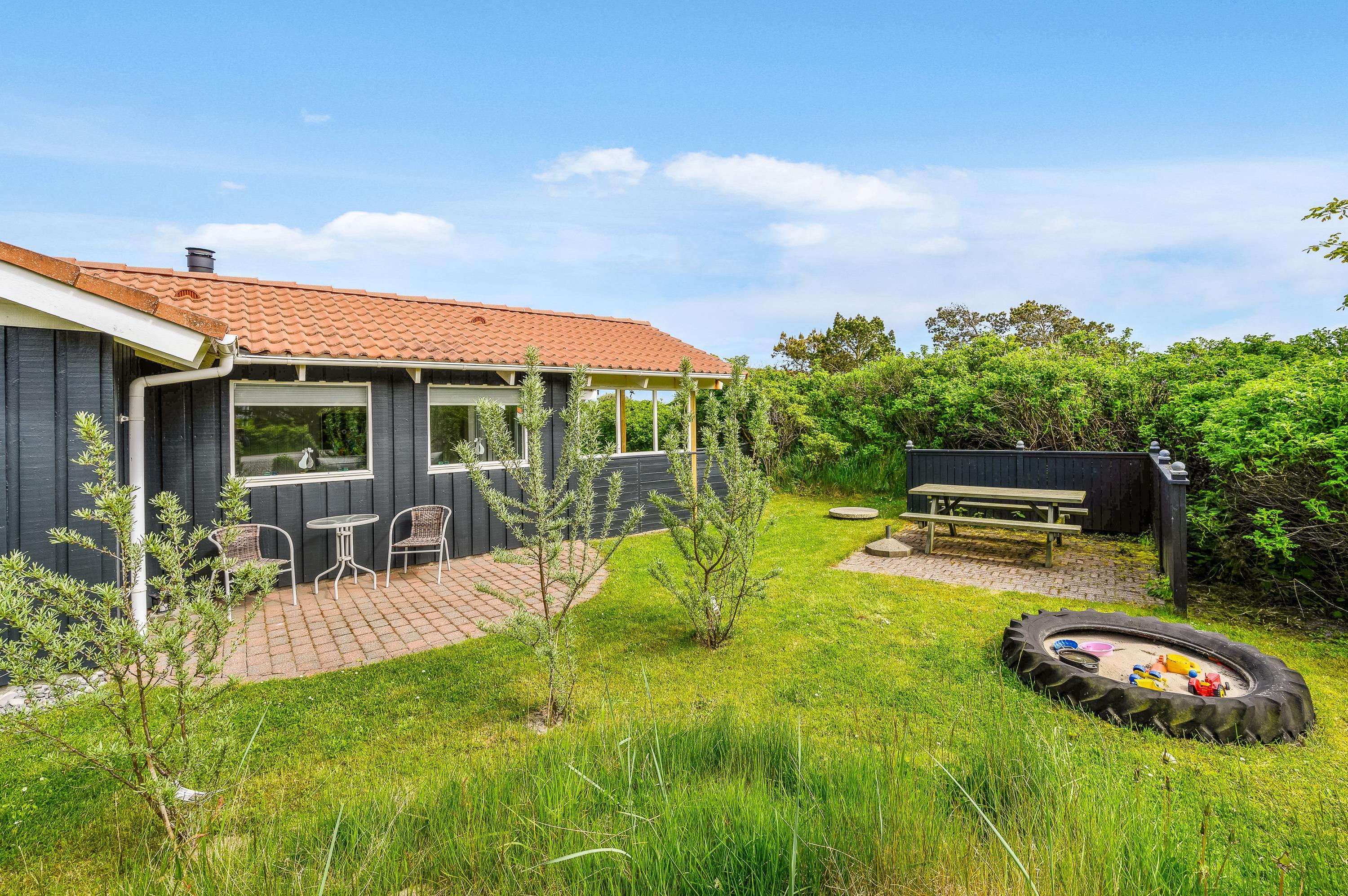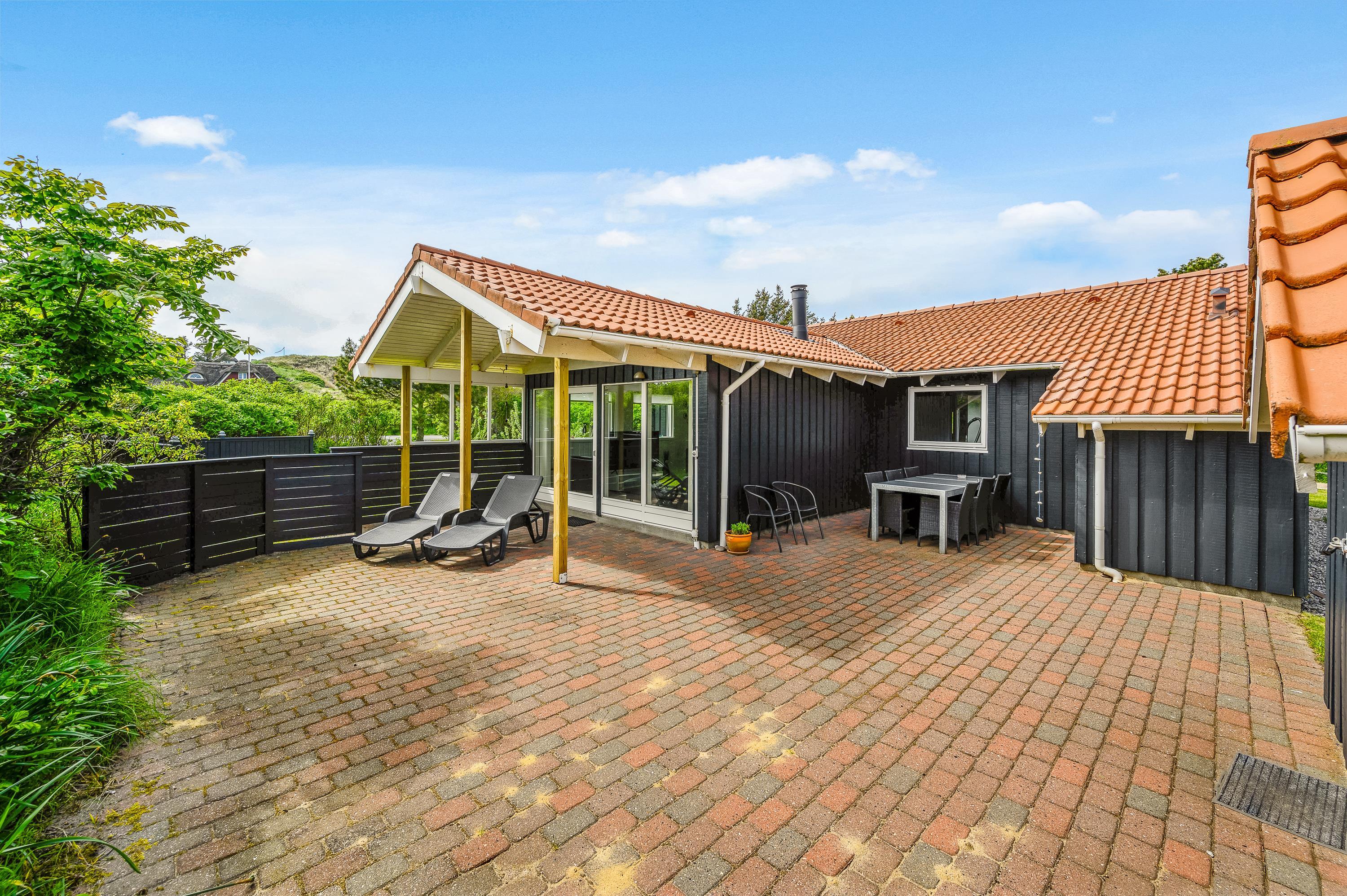 The holiday home offers beautiful terraces with many cosy corners where you can enjoy a delicious cup of coffee while breathing in the fresh West Jutland air. The large terrace is sheltered and partially covered, allowing you to relax outdoors comfortably in any weather.