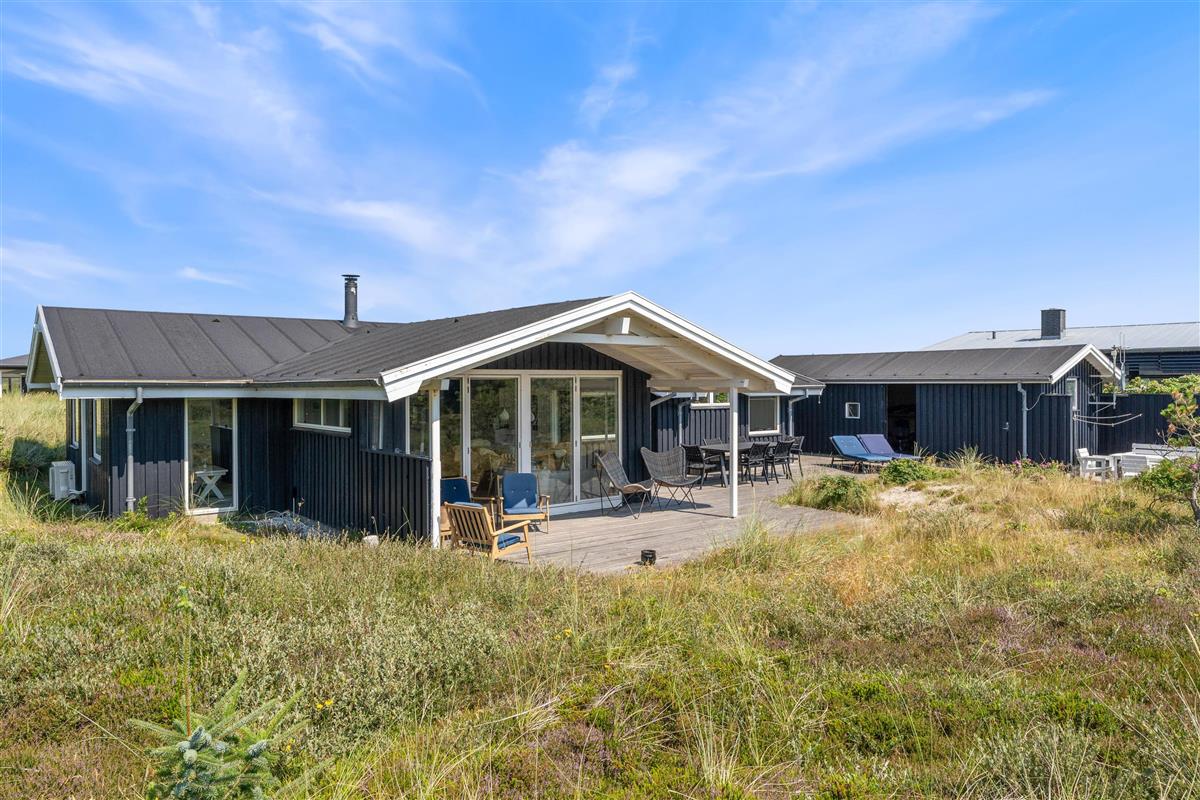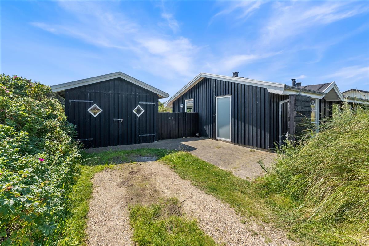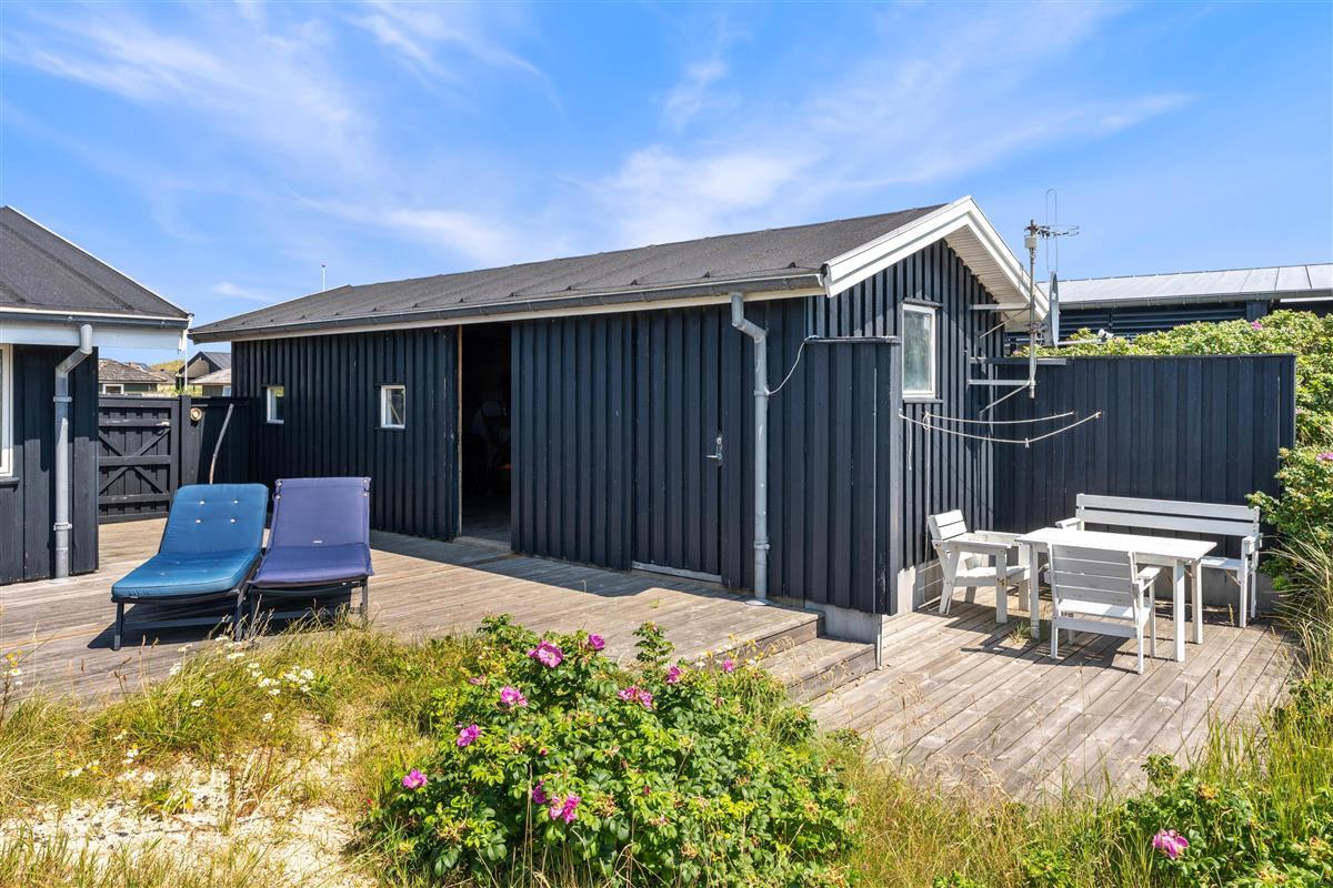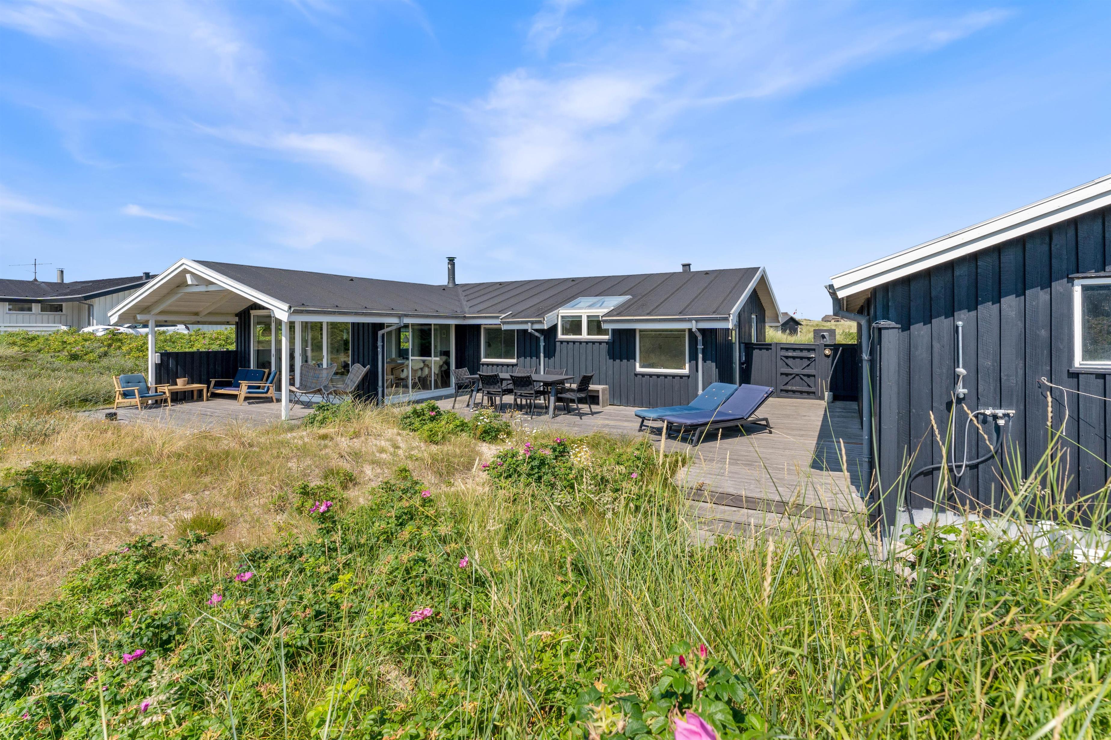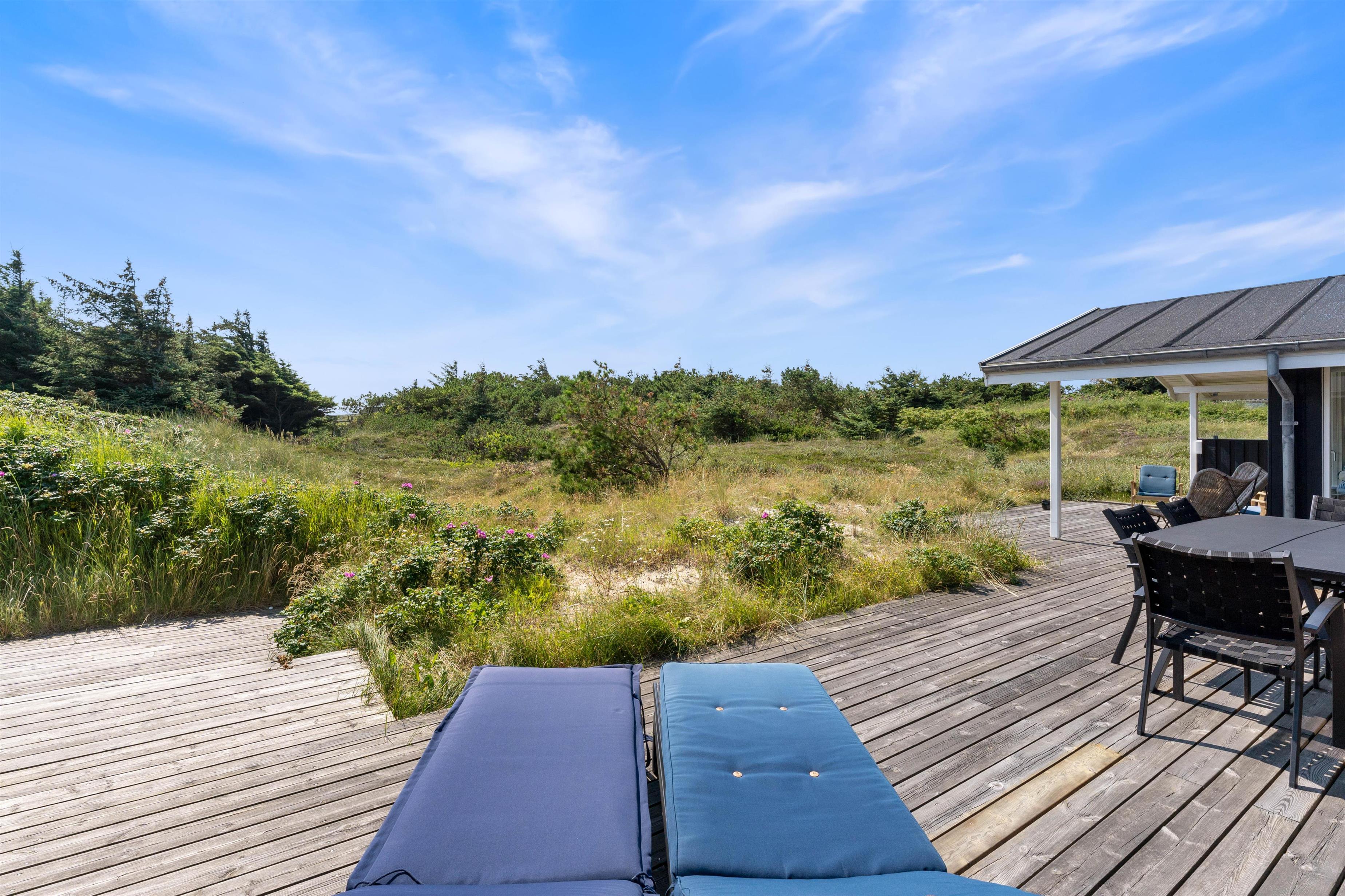 The holiday home enjoys a beautiful position on a natural plot in the heart of Søndervig's holiday region. From the secluded south-facing terrace, you can enjoy views across the dune landscape. The partially covered terrace ensures you'll always find a sheltered sunny spot on fine summer days. Garden furniture, sun loungers, an outdoor shower, and a barbecue are provided to help you make the most of outdoor living. Please note: the outdoor shower is only available from April to November due to frost risk.
