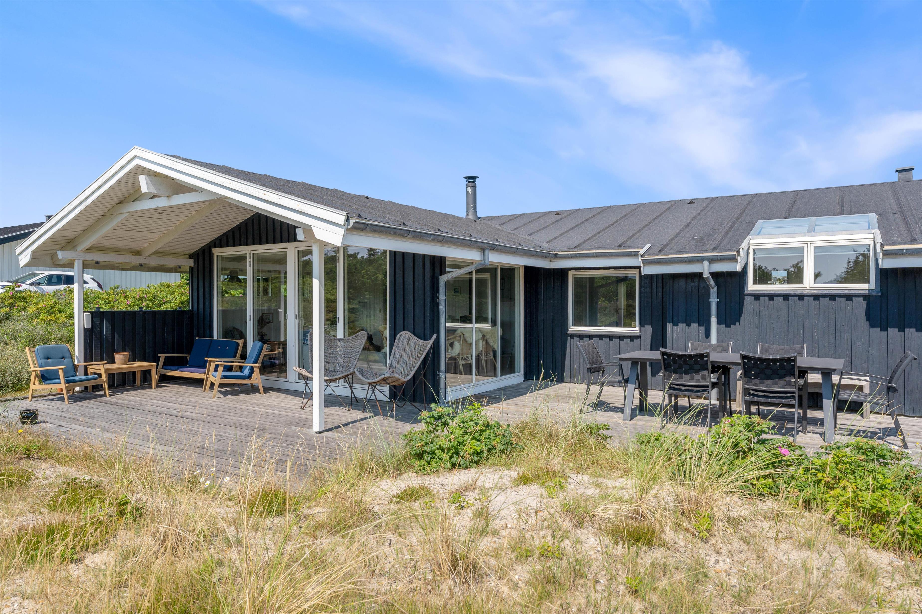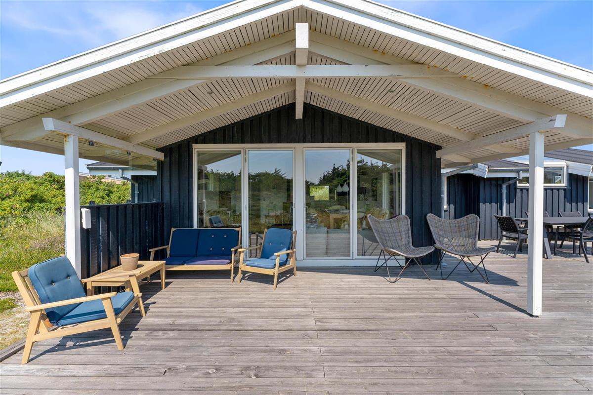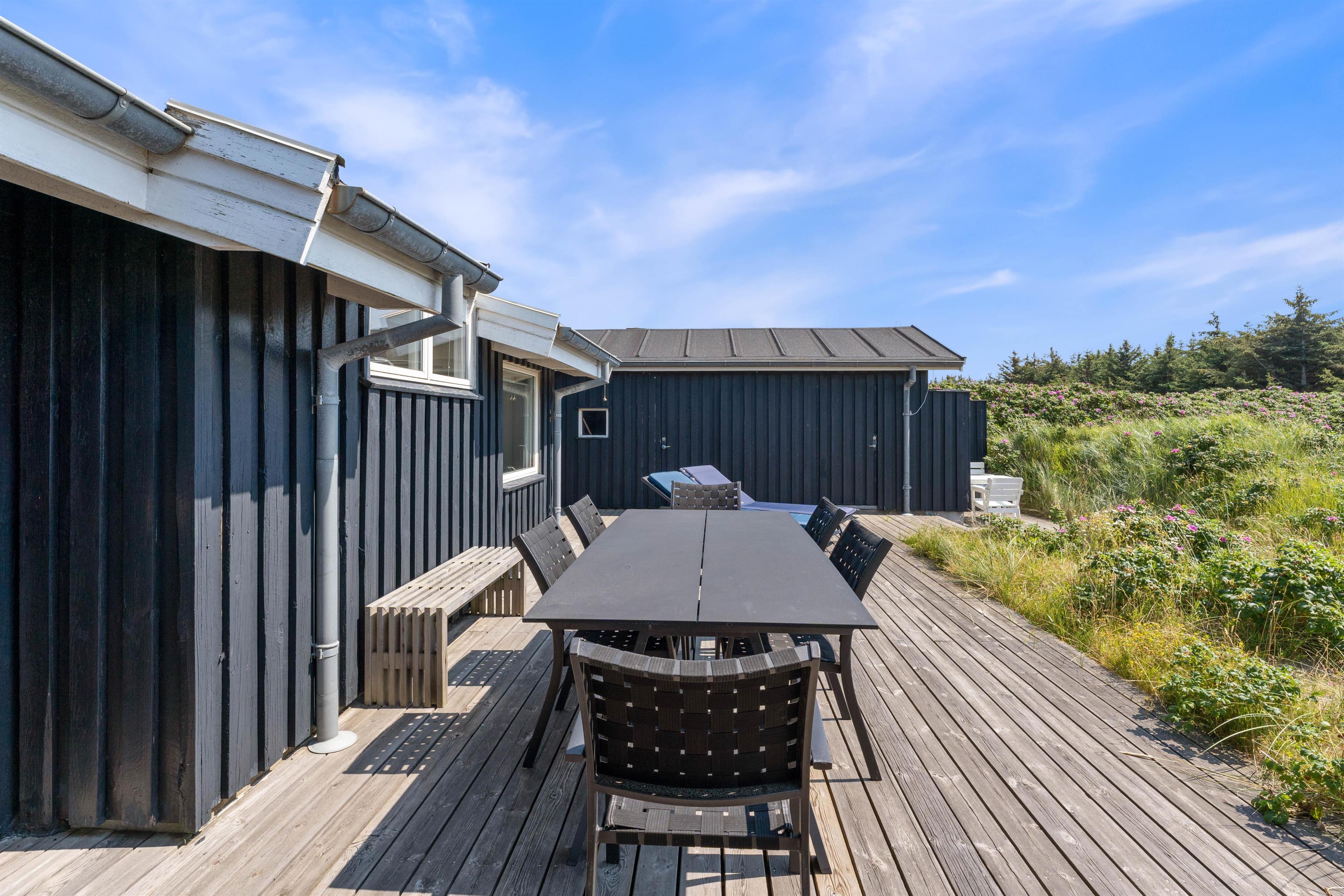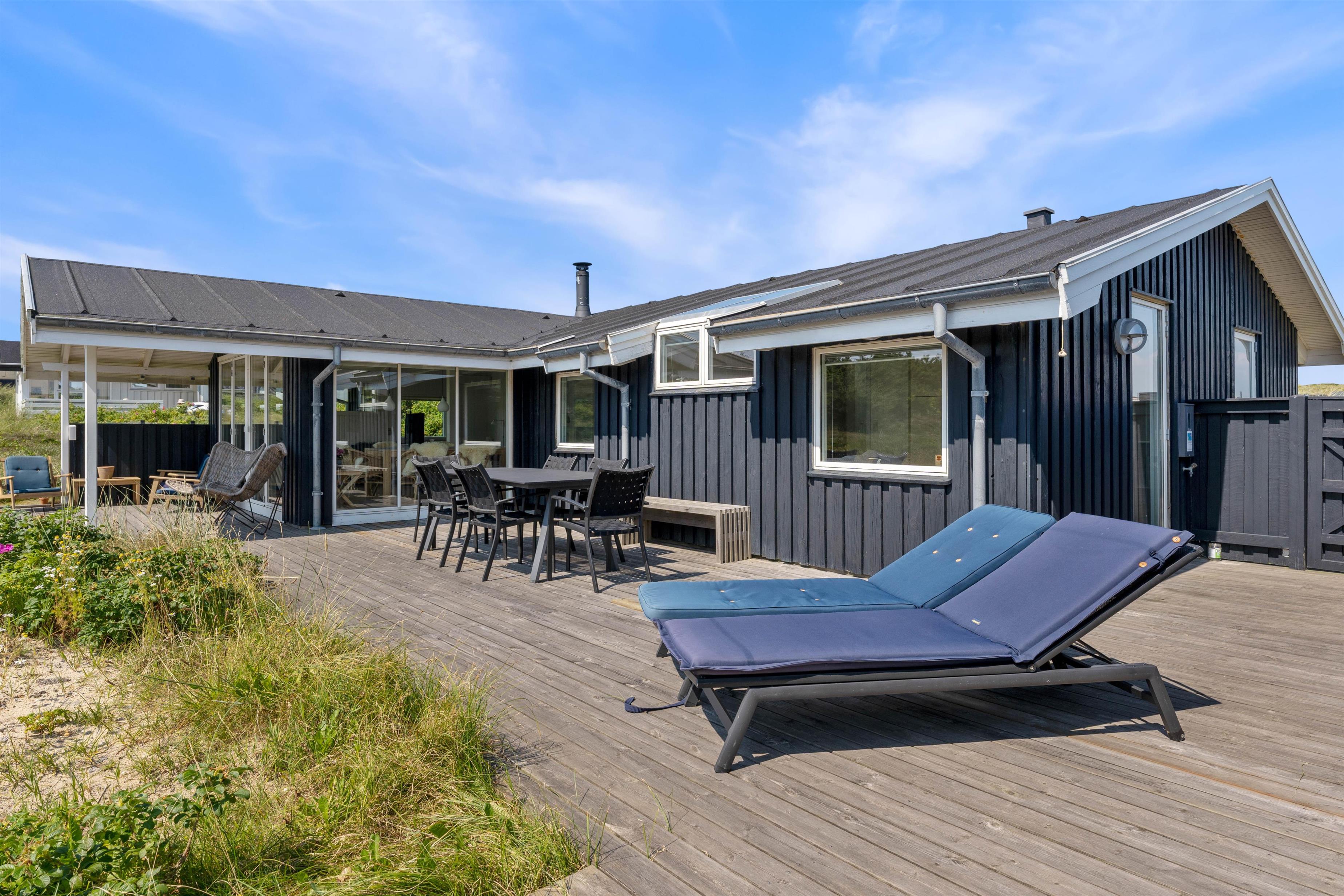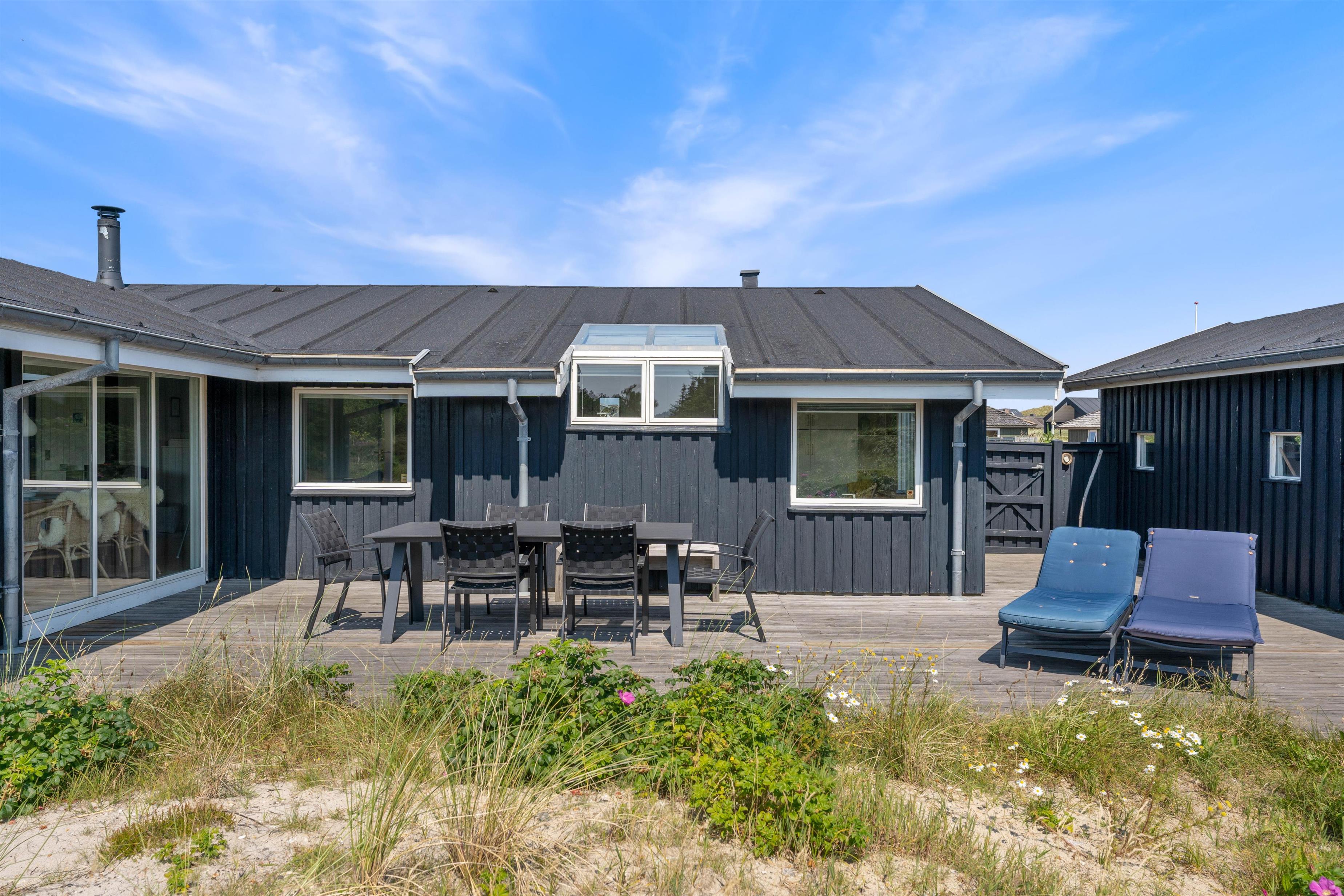 The holiday home enjoys a beautiful position on a natural plot in the heart of Søndervig's holiday region. From the secluded south-facing terrace, you can enjoy views across the dune landscape. The partially covered terrace ensures you'll always find a sheltered sunny spot on fine summer days. Garden furniture, sun loungers, an outdoor shower, and a barbecue are provided to help you make the most of outdoor living. Please note: the outdoor shower is only available from April to November due to frost risk.