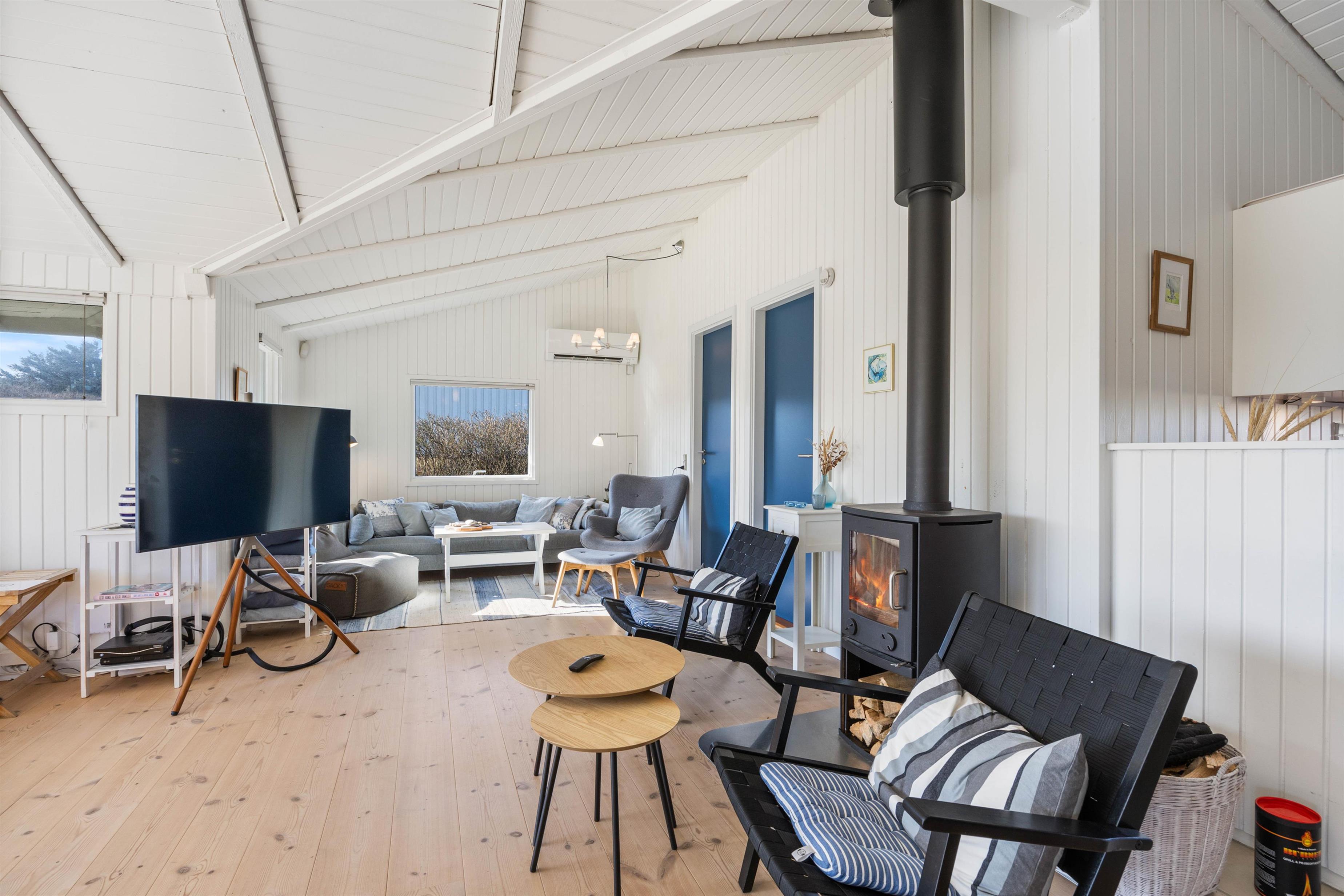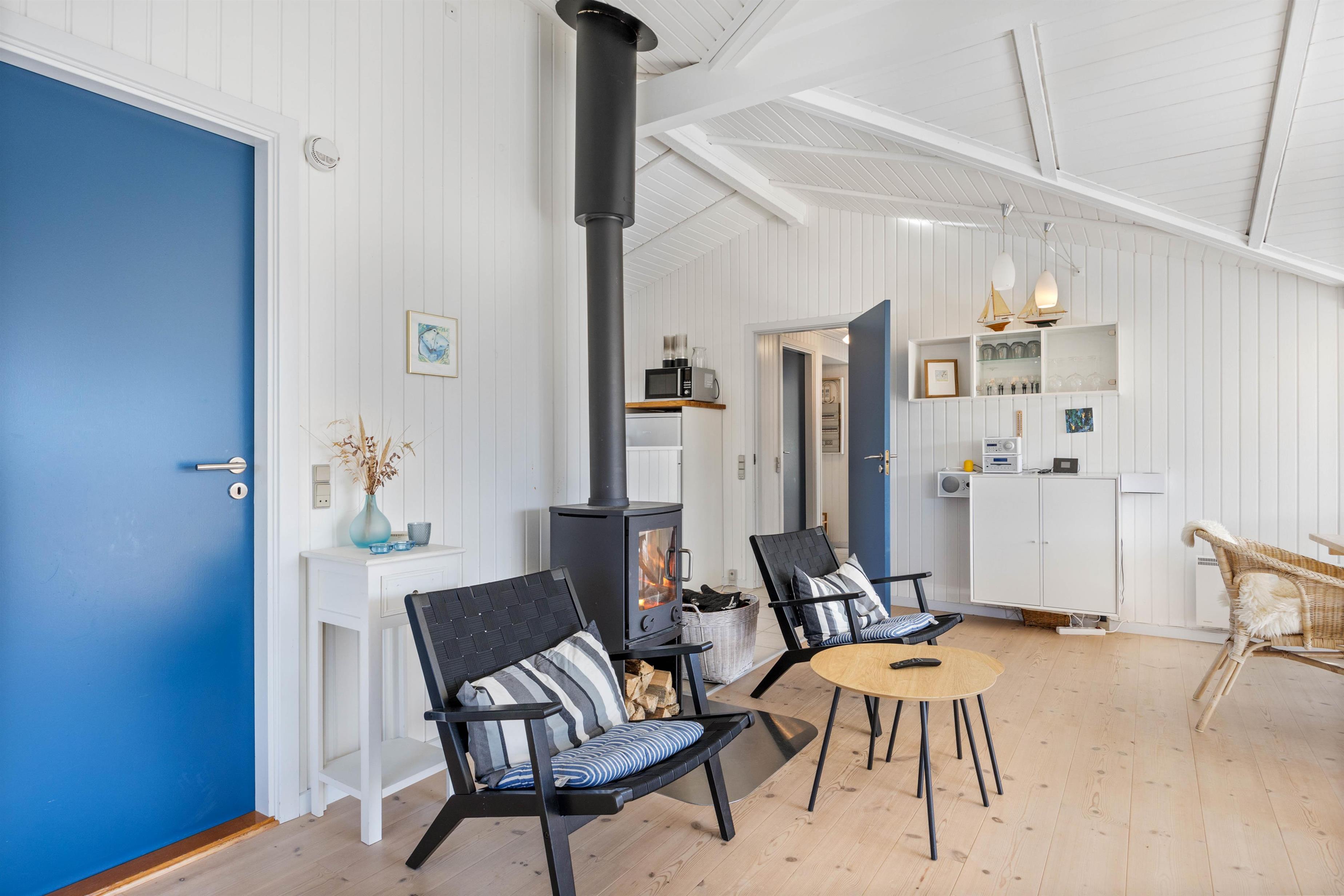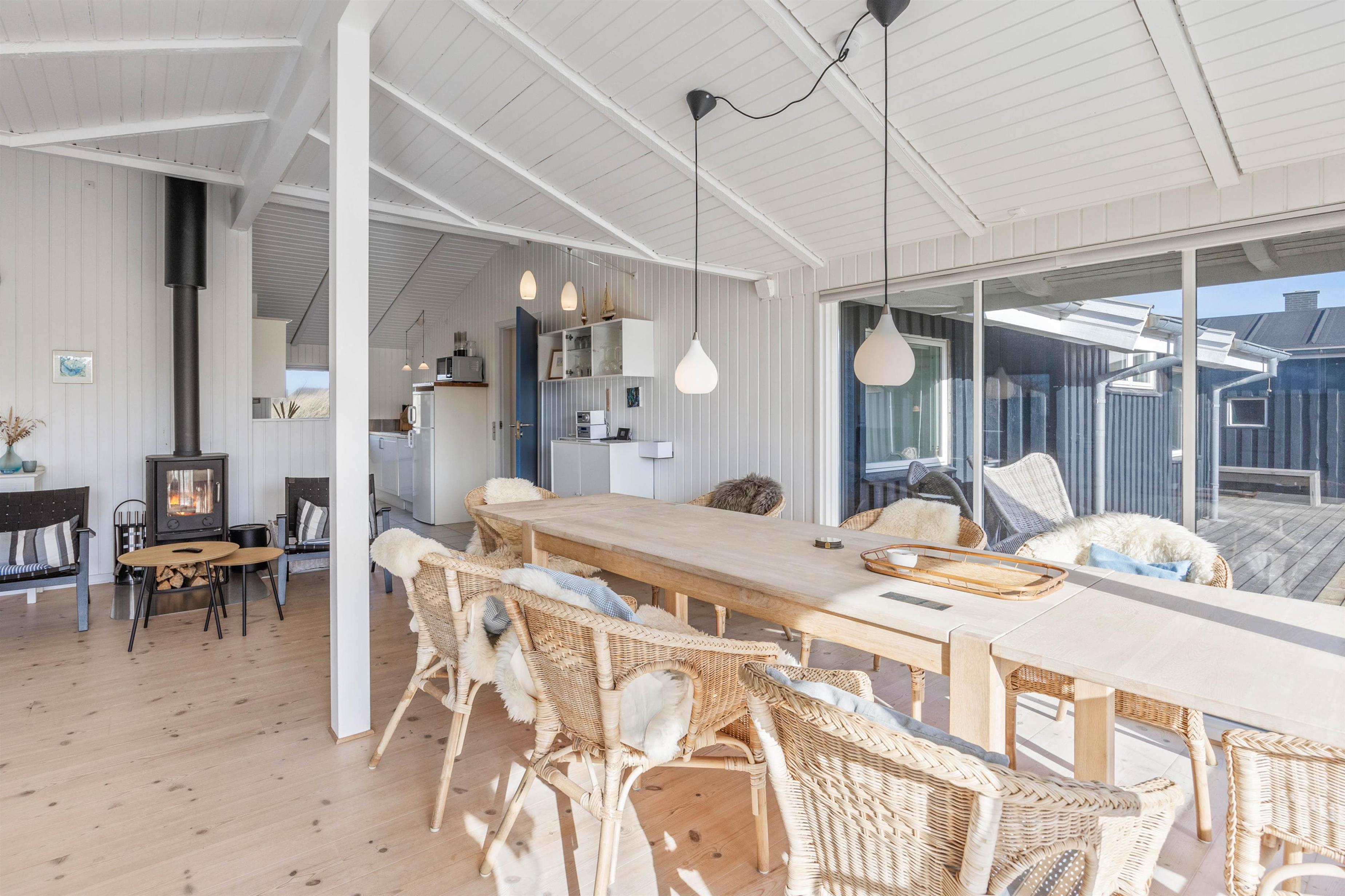 The heart of the holiday home is the cosy living room, which connects to the well-equipped kitchen. The large windows not only provide beautiful natural light but also offer lovely views of the surrounding nature. The living room offers plenty of space for gathering the whole family for memorable holiday moments. In the morning, plan your day's activities over coffee, and as evening falls, light the wood-burning stove and settle into the corner of the sofa to enjoy a good film.