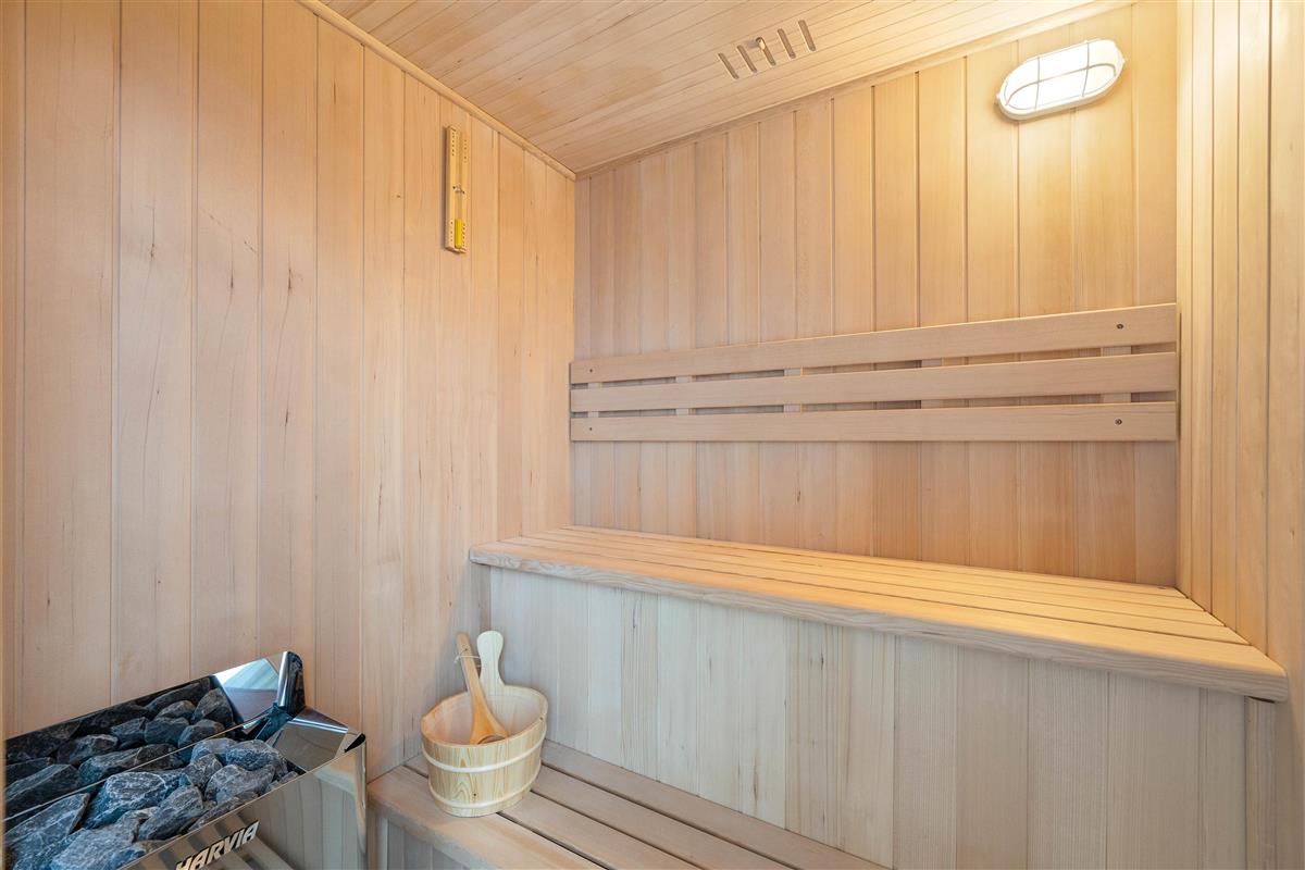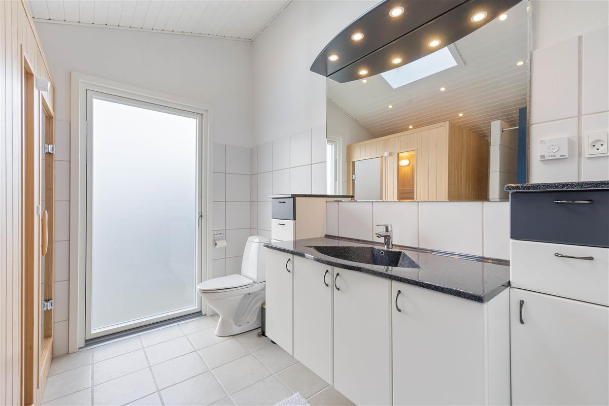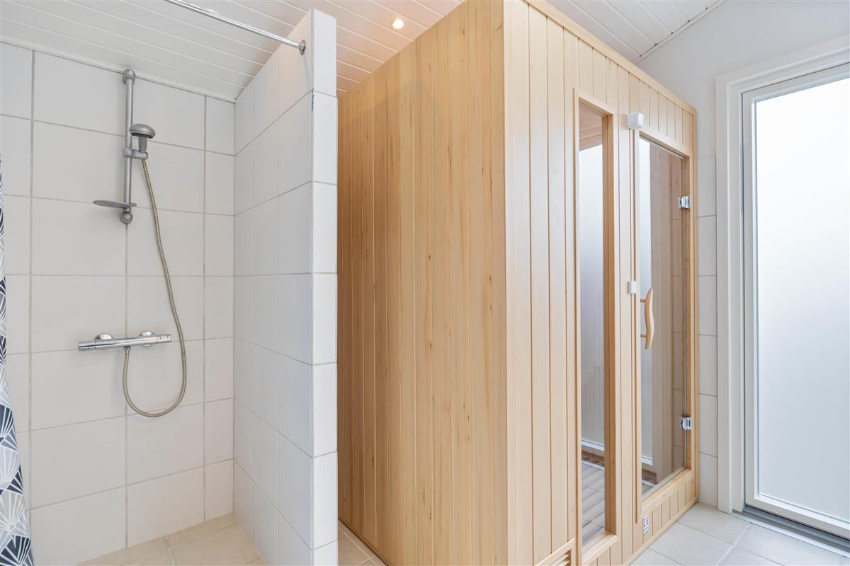 Along with the kitchen's dishwasher, the house features a washing machine and tumble dryer. Two bathrooms, both with underfloor heating, ensure no morning queues, while an energy-efficient heat pump maintains comfortable temperatures year-round. The larger bathroom includes patio doors, skylights and a sauna.