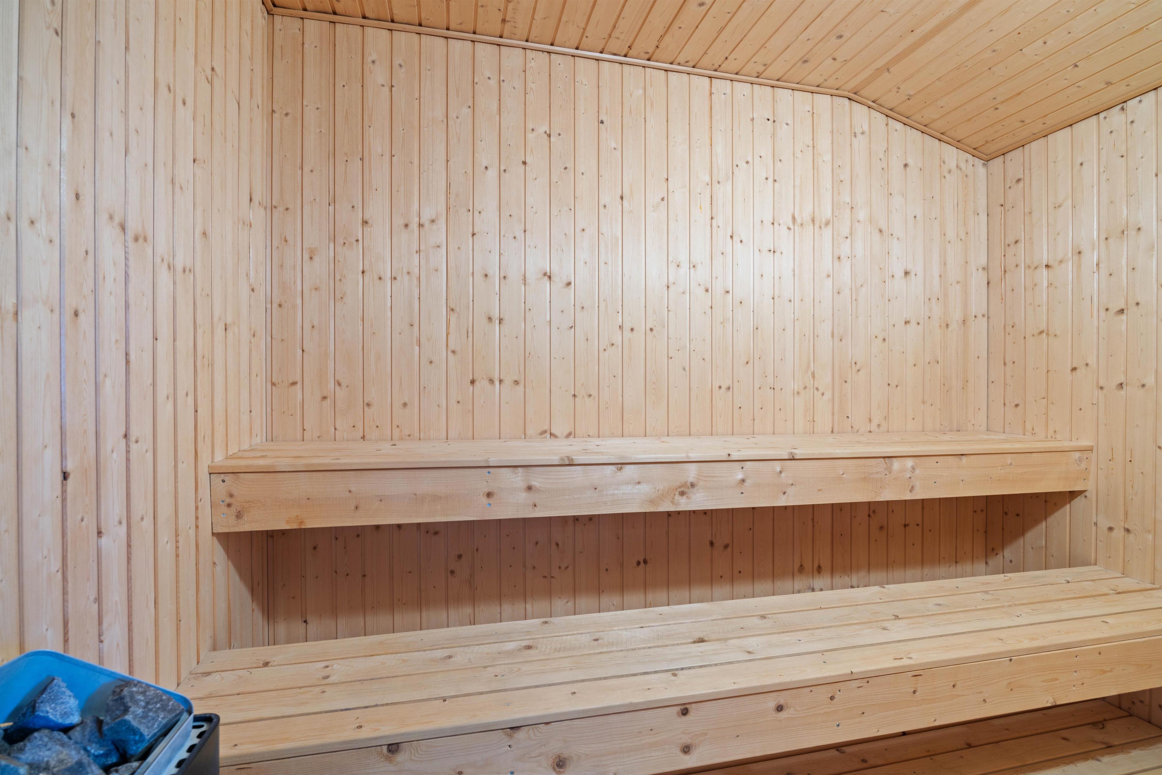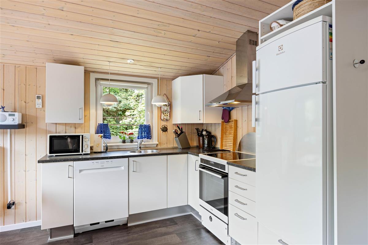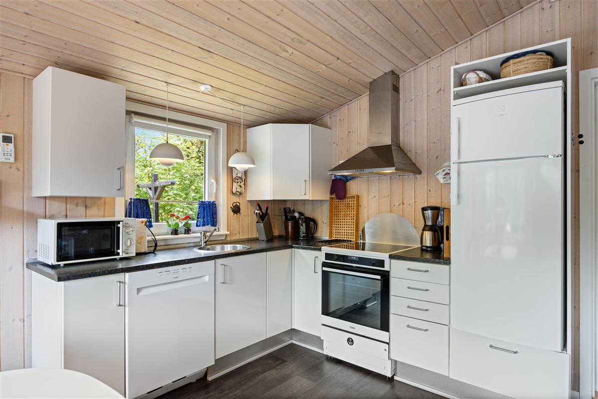 The living and dining areas flow seamlessly into the kitchen, creating a space where you'll spend many enjoyable hours. Light the wood-burning stove and enjoy its warmth and cosy atmosphere. The protective guard around the stove ensures peace of mind for families with children or pets. You'll find everything here needed for a successful holiday.