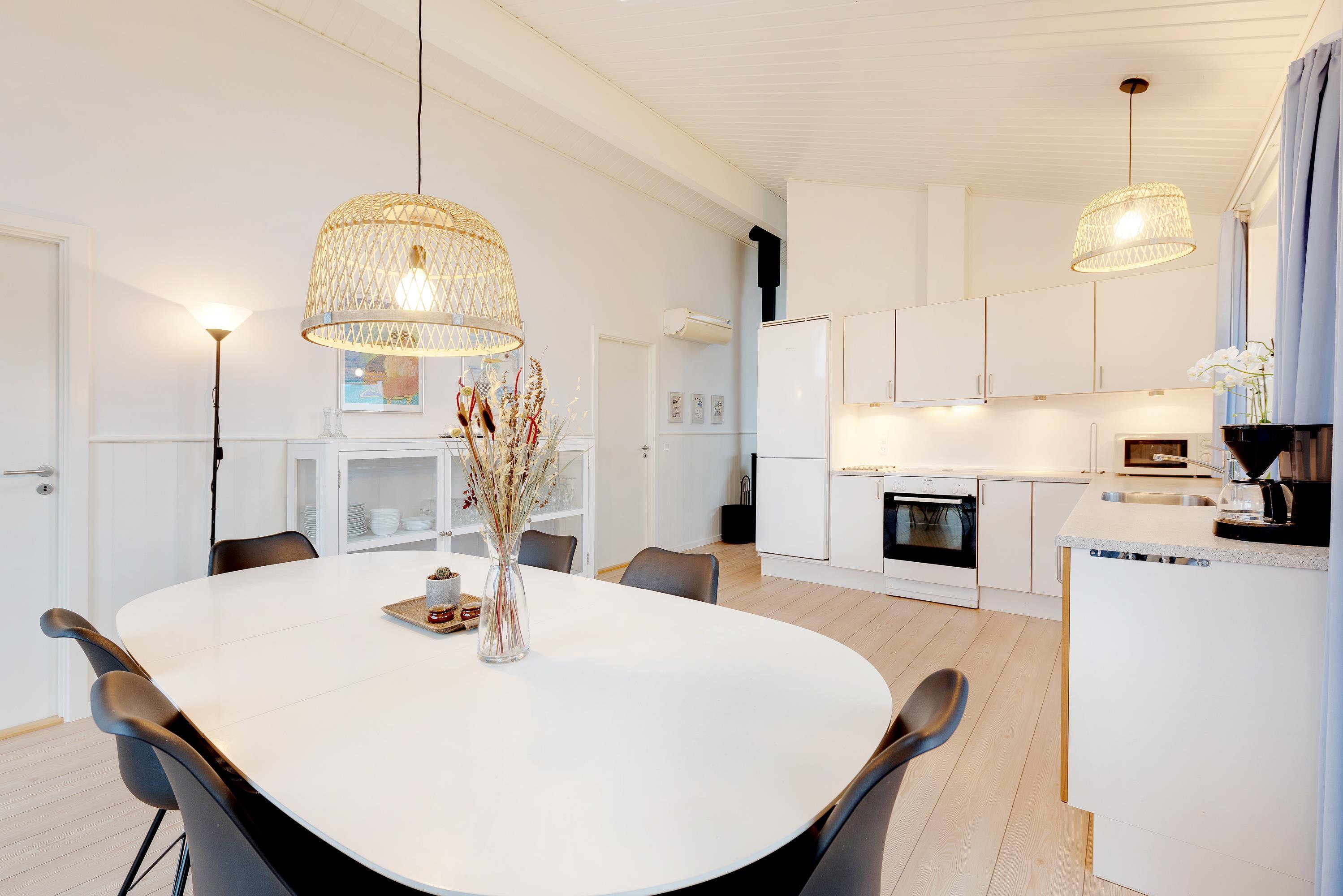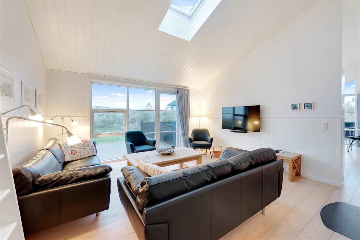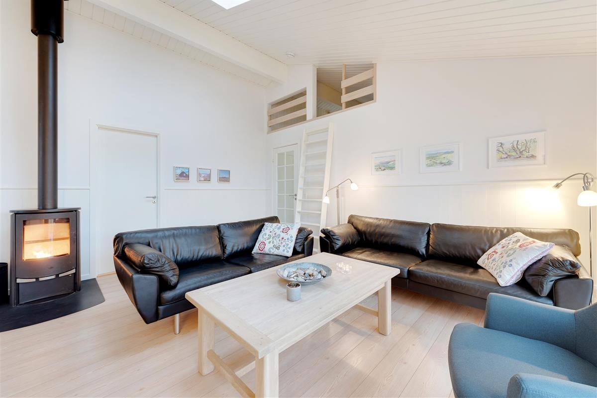 The well-equipped kitchen includes a dishwasher, microwave, and fridge with a large separate freezer (80 litres). The kitchen opens onto the living room, which is attractively furnished with comfortable seating, a wood-burning stove and TV. The house also features a mezzanine sleeping area with two beds and complimentary wireless internet access. This holiday home is well-insulated and fitted with an energy-efficient heat pump, helping to keep energy and heating costs manageable.
