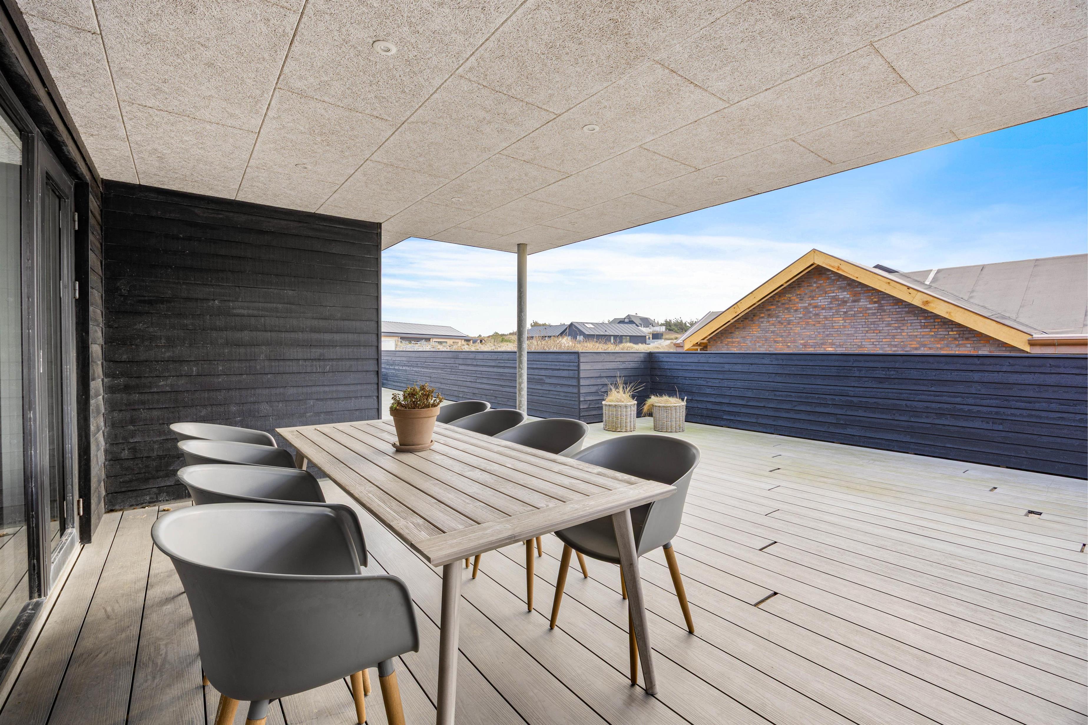 Furthermore, the holiday home features a large terrace, partially fenced to provide shelter from strong winds. The terrace is also partially covered for shade from the sun. This spacious outdoor area offers plenty of room. Naturally, the holiday home comes equipped with garden furniture, sun loungers, and a barbecue - perfect for summer evenings.