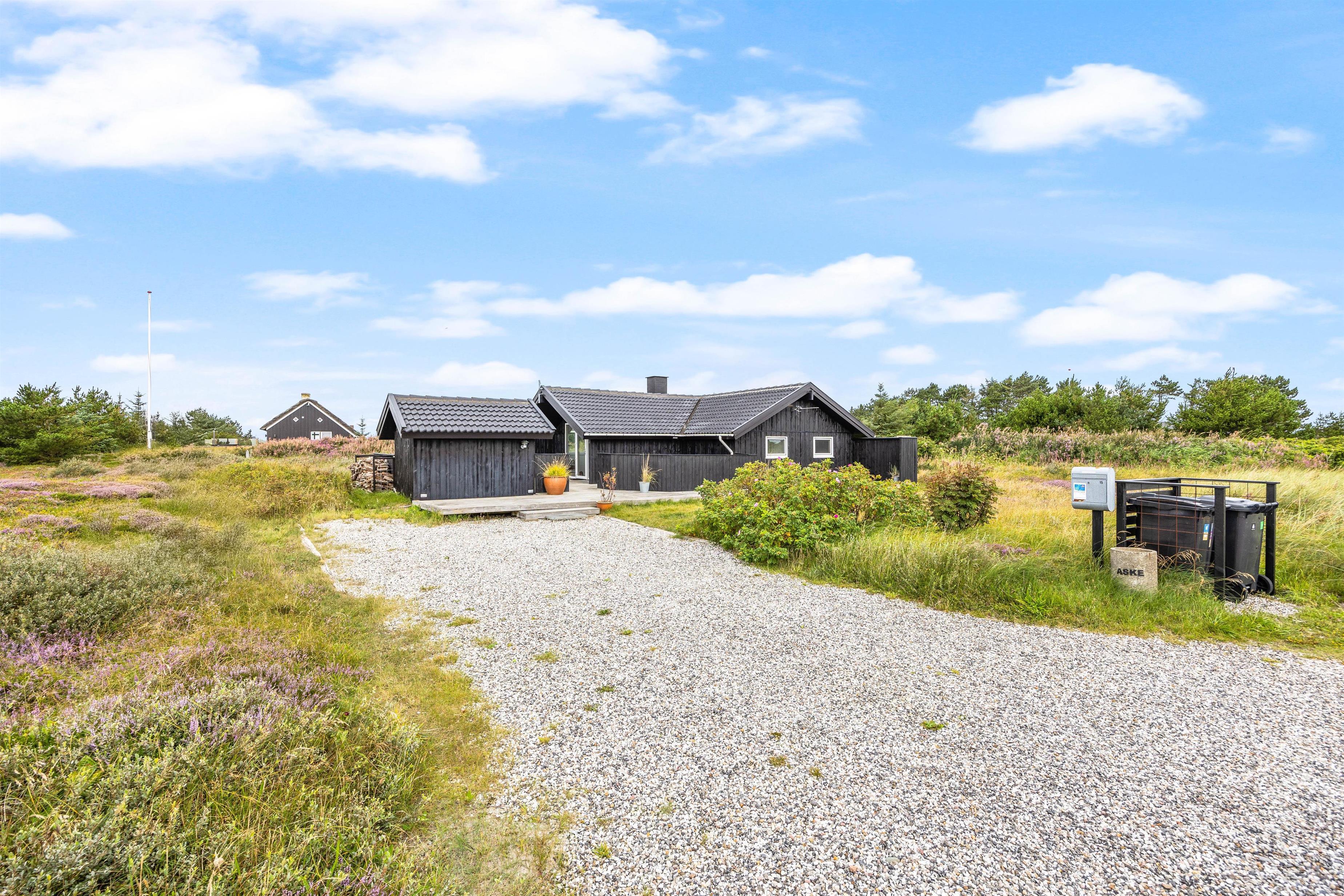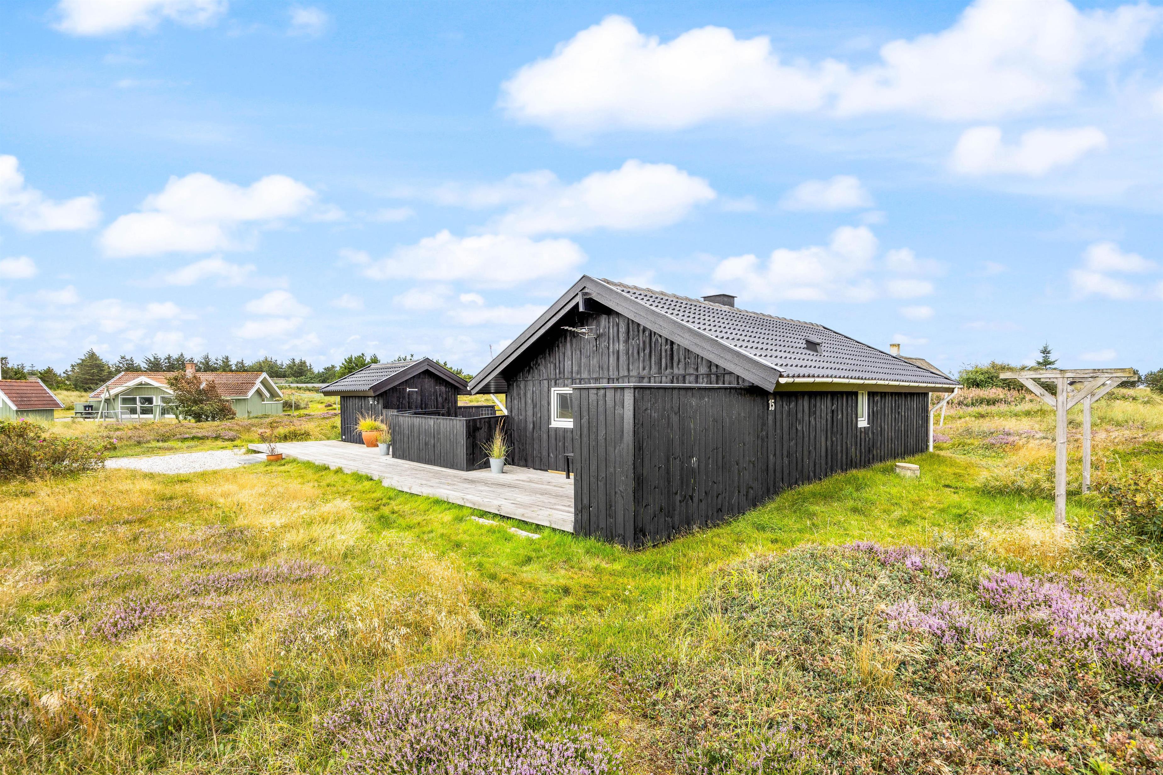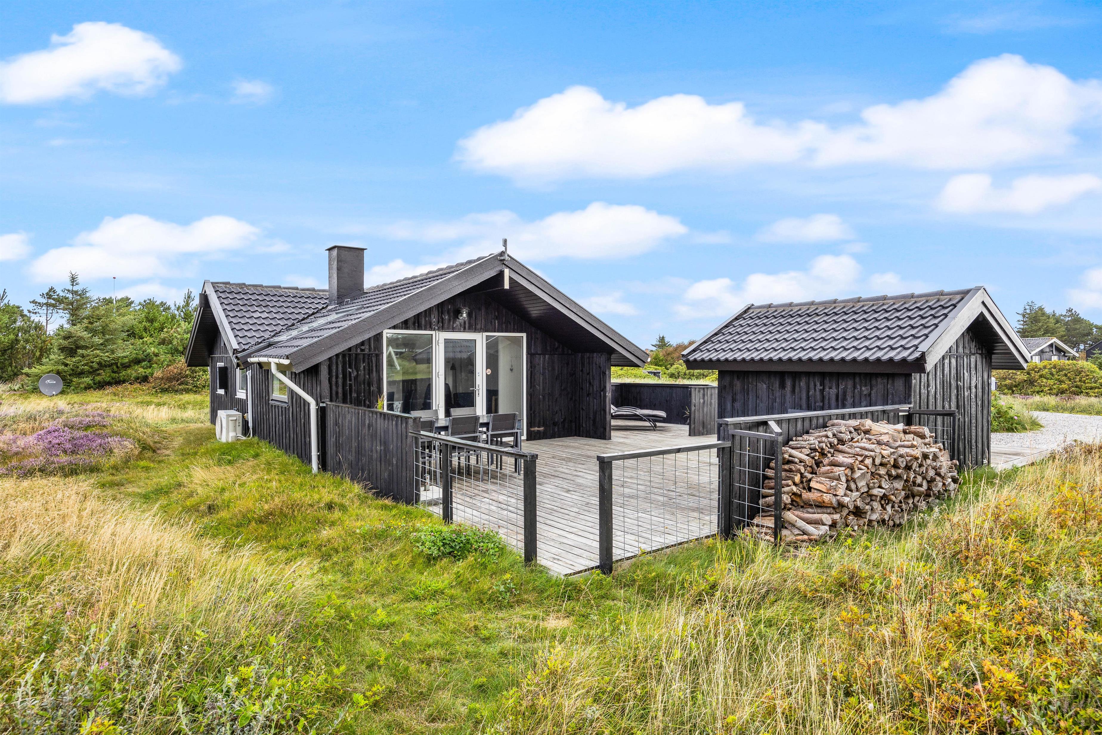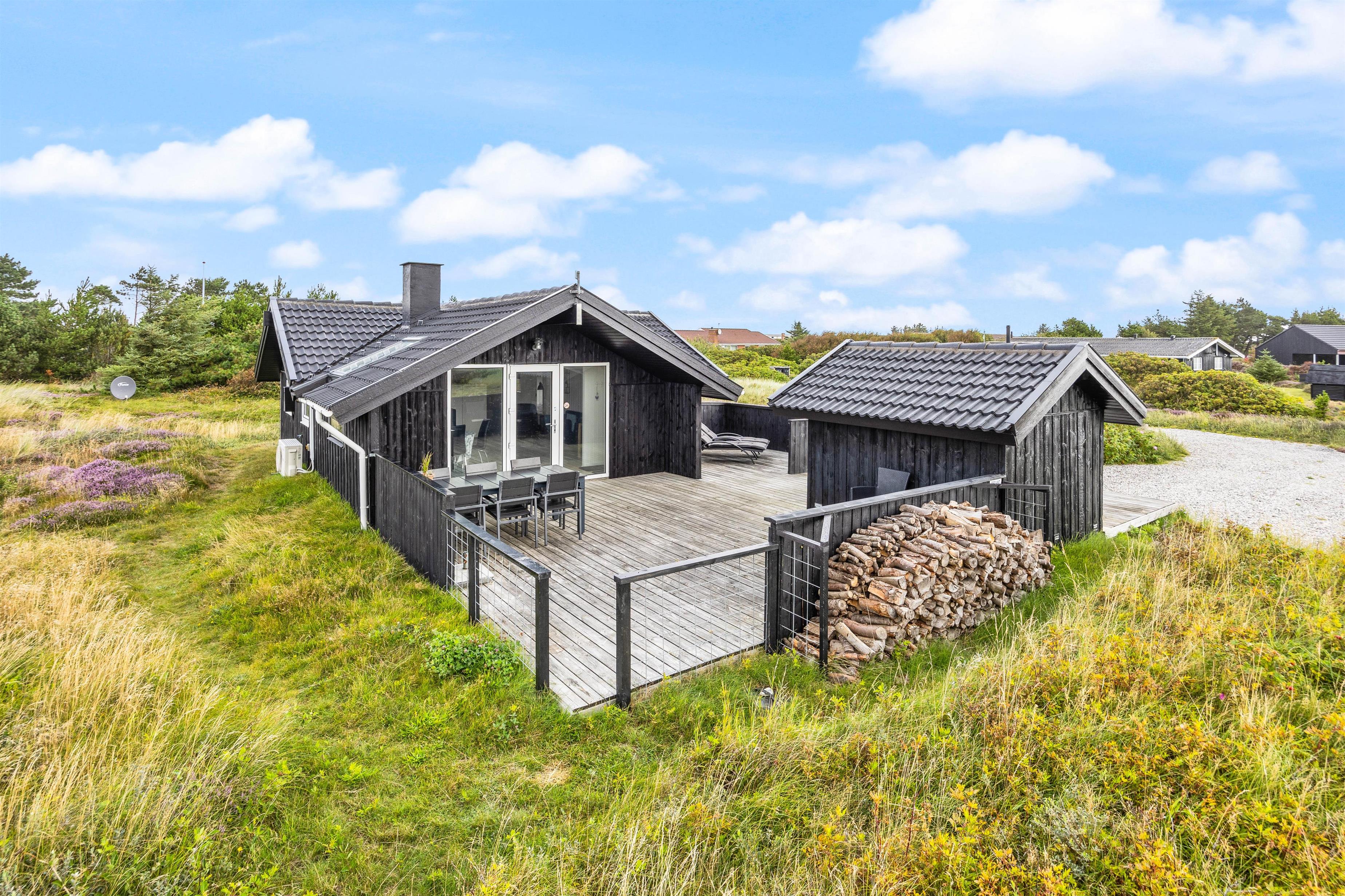 The holiday home sits on a 2,466-square-metre natural plot covered in heather, just 800 metres from miles of sandy beach and the breathtaking North Sea. The living room opens directly onto a beautiful, large wooden terrace that's sheltered and partially enclosed. Garden furniture, sun loungers and a barbecue are provided. As evening falls, it's the perfect time to fire up the barbecue and let the grill master demonstrate their skills preparing a delicious meal for the whole family. Young guests will enjoy the swing and plenty of space to play.