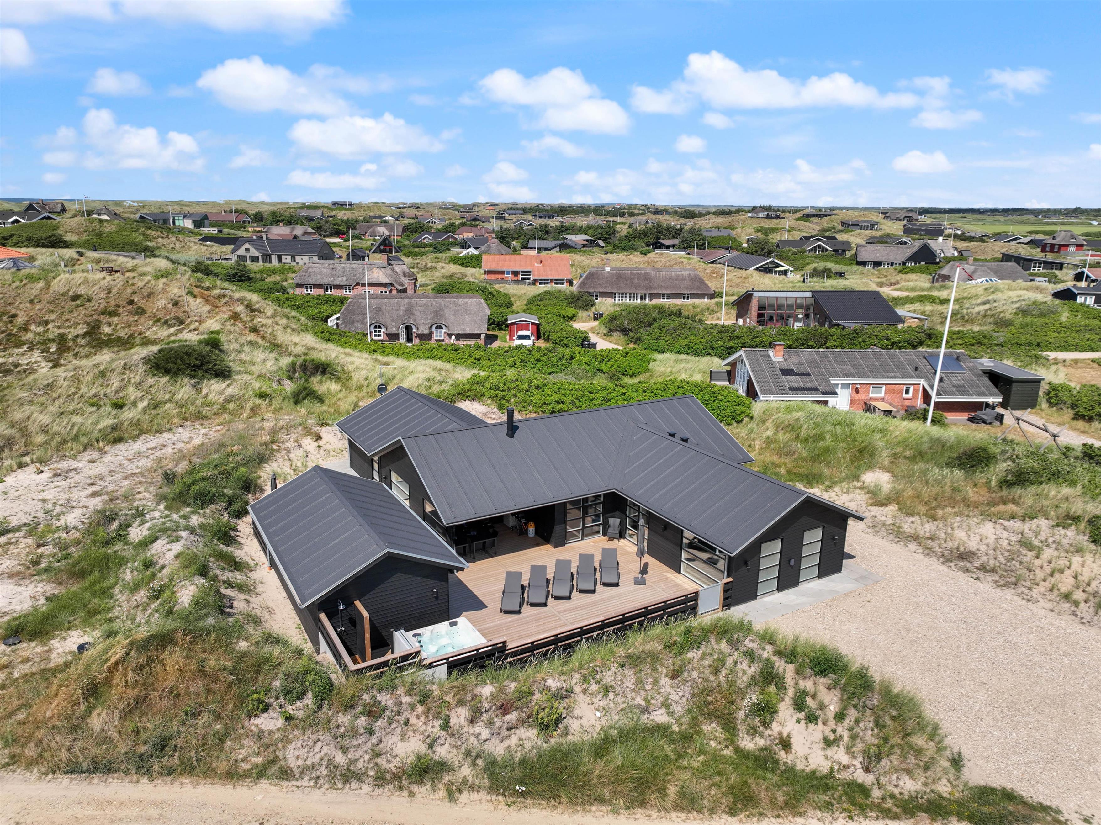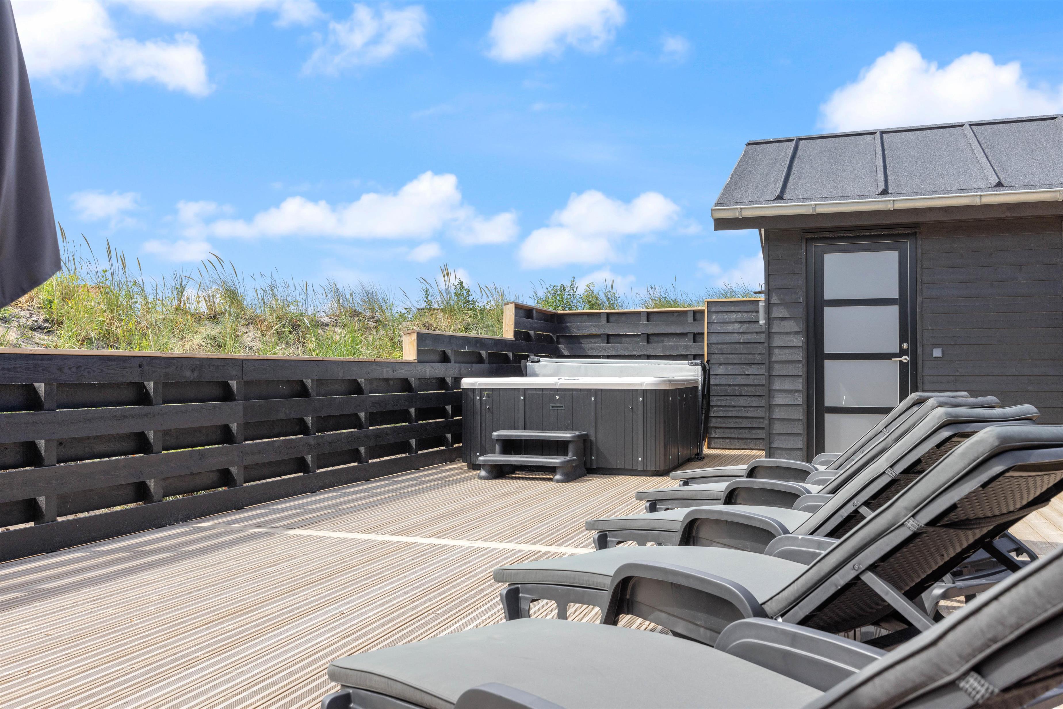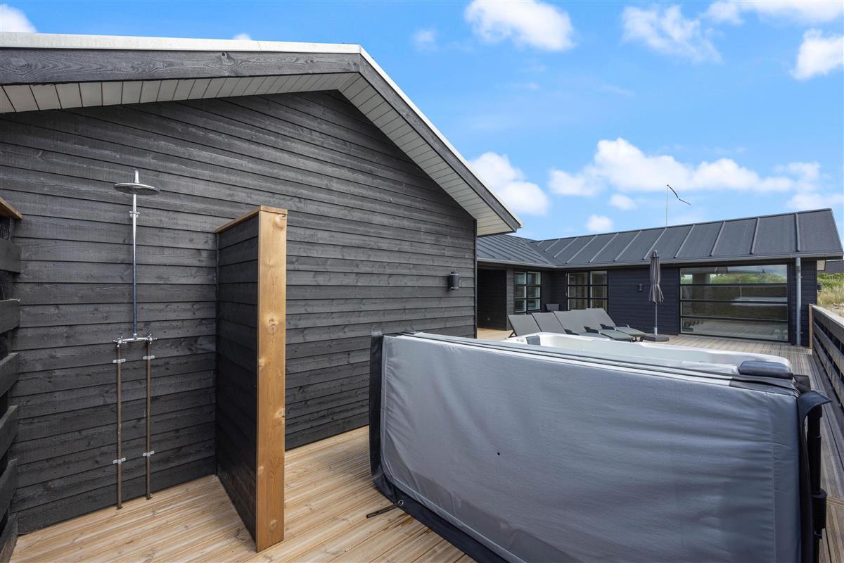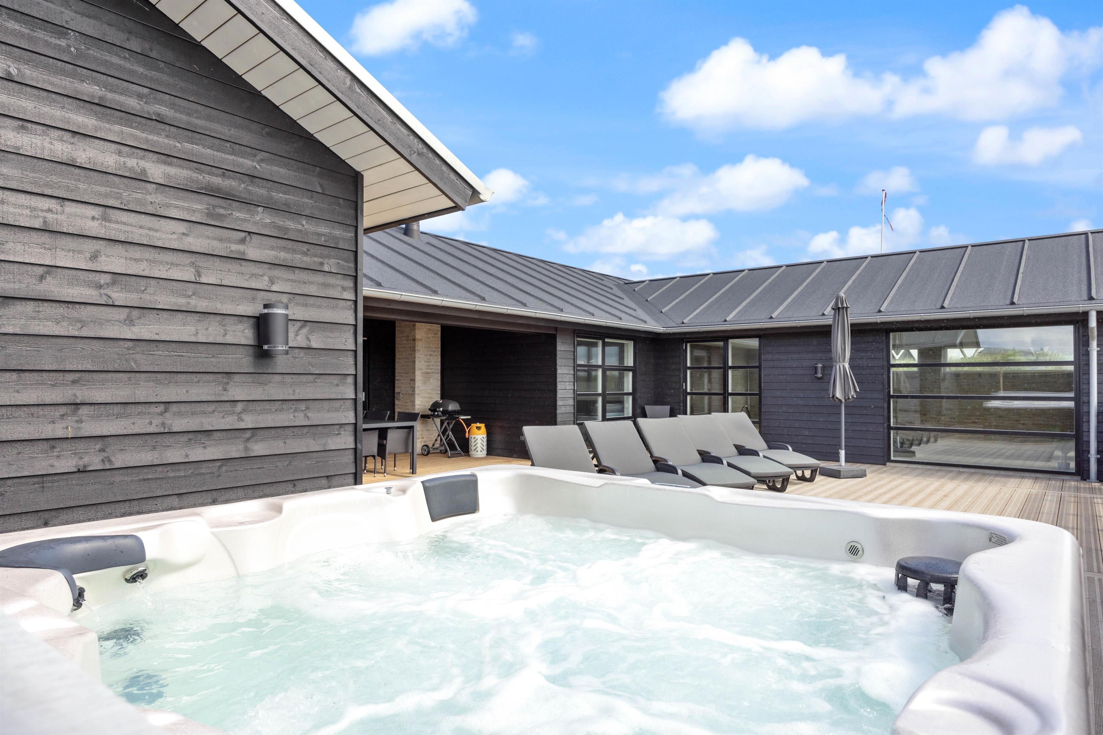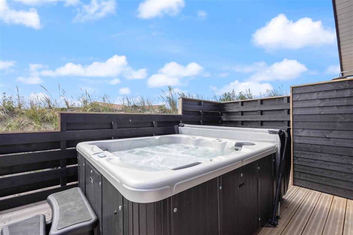 This newly built holiday home from 2022, located just 400 metres from the beach, offers a relaxing retreat for the whole family. If you're looking for a holiday home with wellness facilities, this holiday home at Holdvej 50 could be the perfect choice. The holiday home features a swimming pool with counter-current system, a large outdoor hot tub for six people, a sauna, an outbuilding with recreational facilities, and is just 400 metres from the sea. The house enjoys a particularly peaceful setting, situated on a quiet road with properties only on one side.