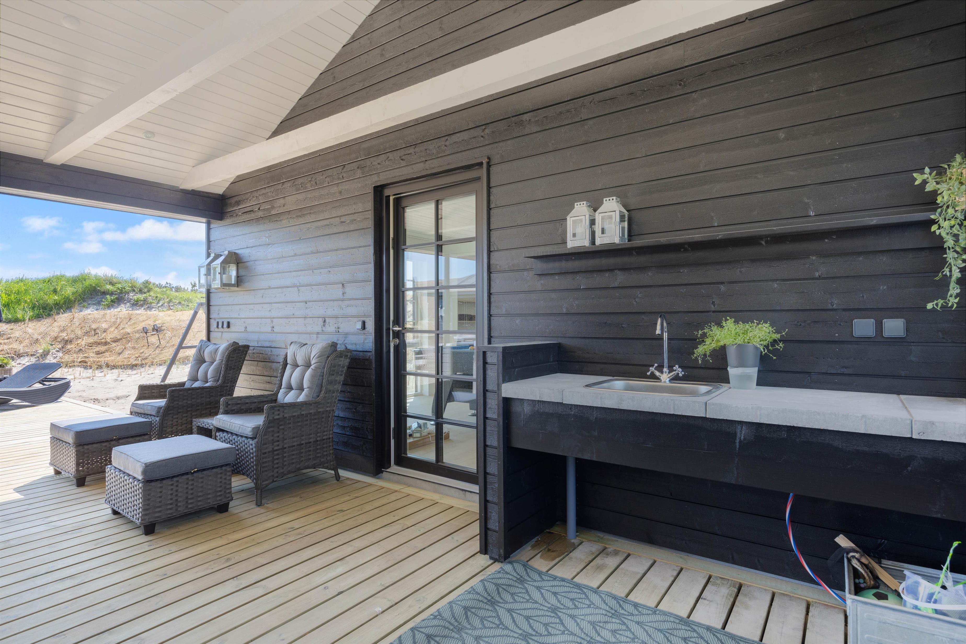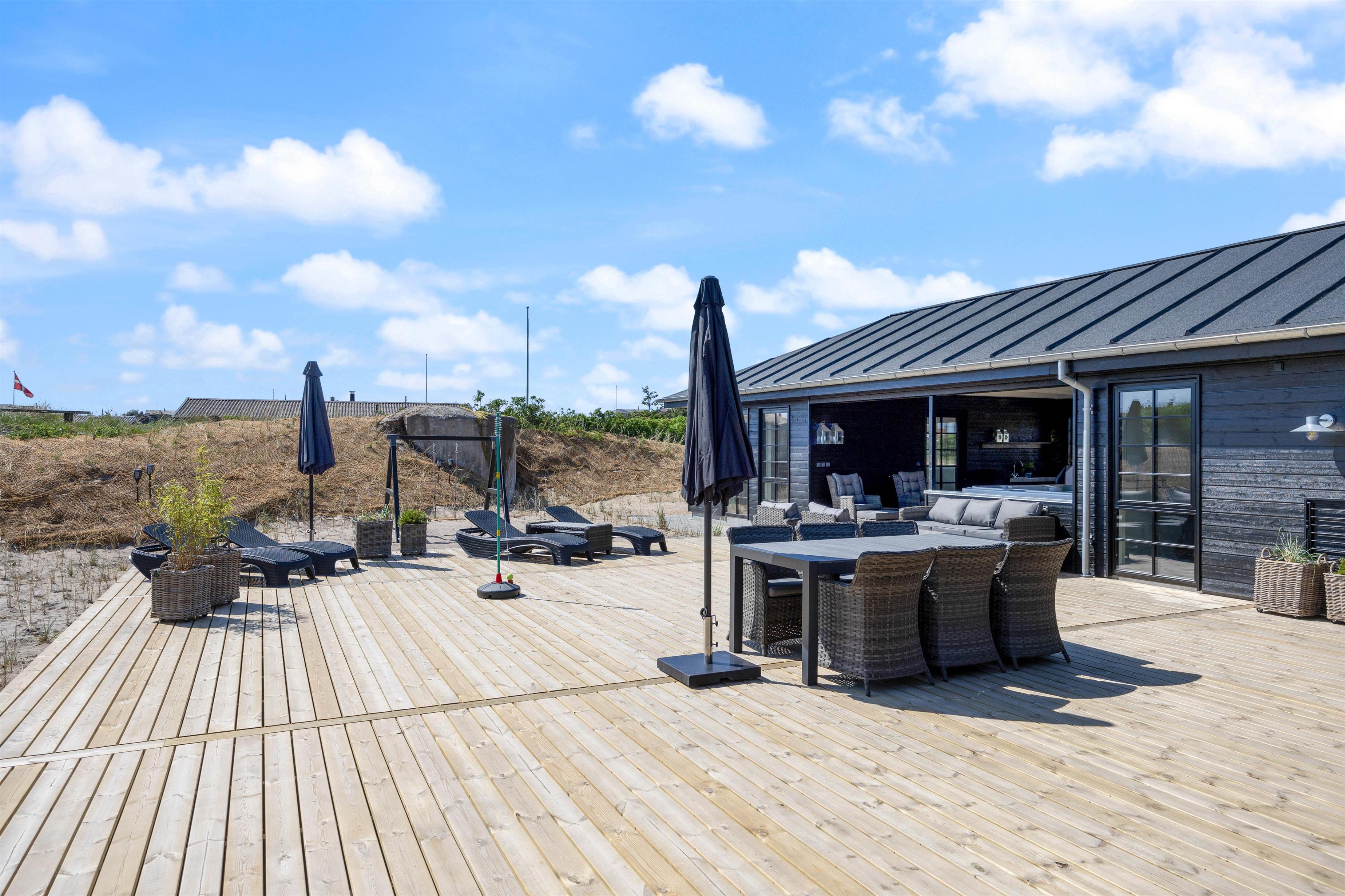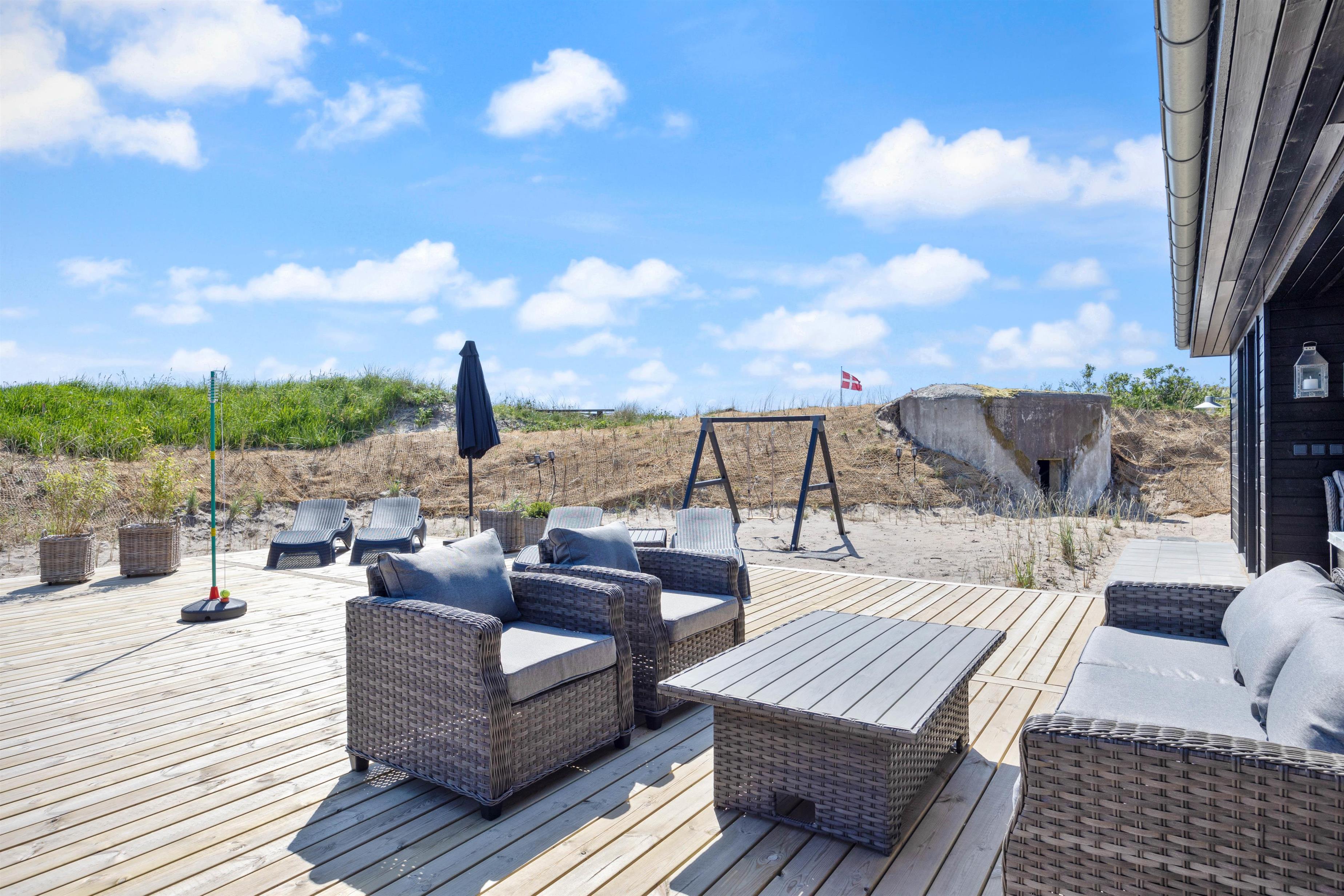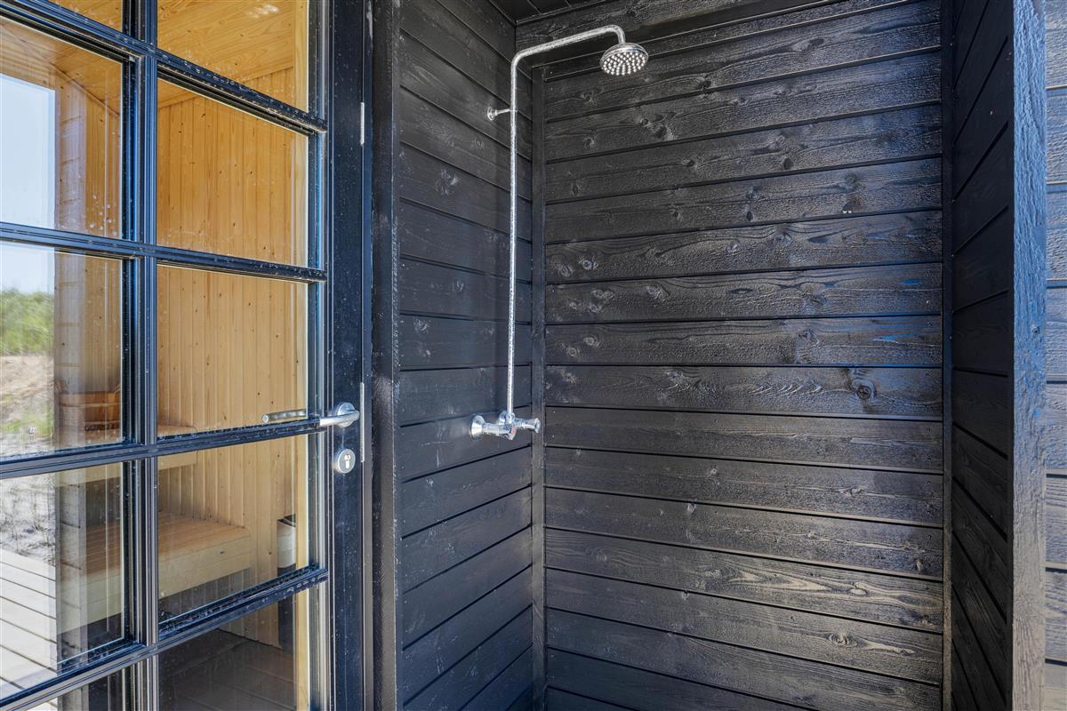 The holiday home at Nordsøvej 100 in Søndervig sits on a 1,555-square-metre natural dune plot. Young guests can burn off energy on the swing while you relax on the terrace enjoying good weather with a cool drink. When it gets too warm, cool off under the outdoor shower. A gas barbecue is available for preparing delicious evening meals. The outdoor hot tub offers extra relaxation - perfect for warming up after a long walk. The holiday home's sauna can be accessed both from inside and outside the house. From April to November, you can rinse sandy feet after beach days using the outdoor shower.
