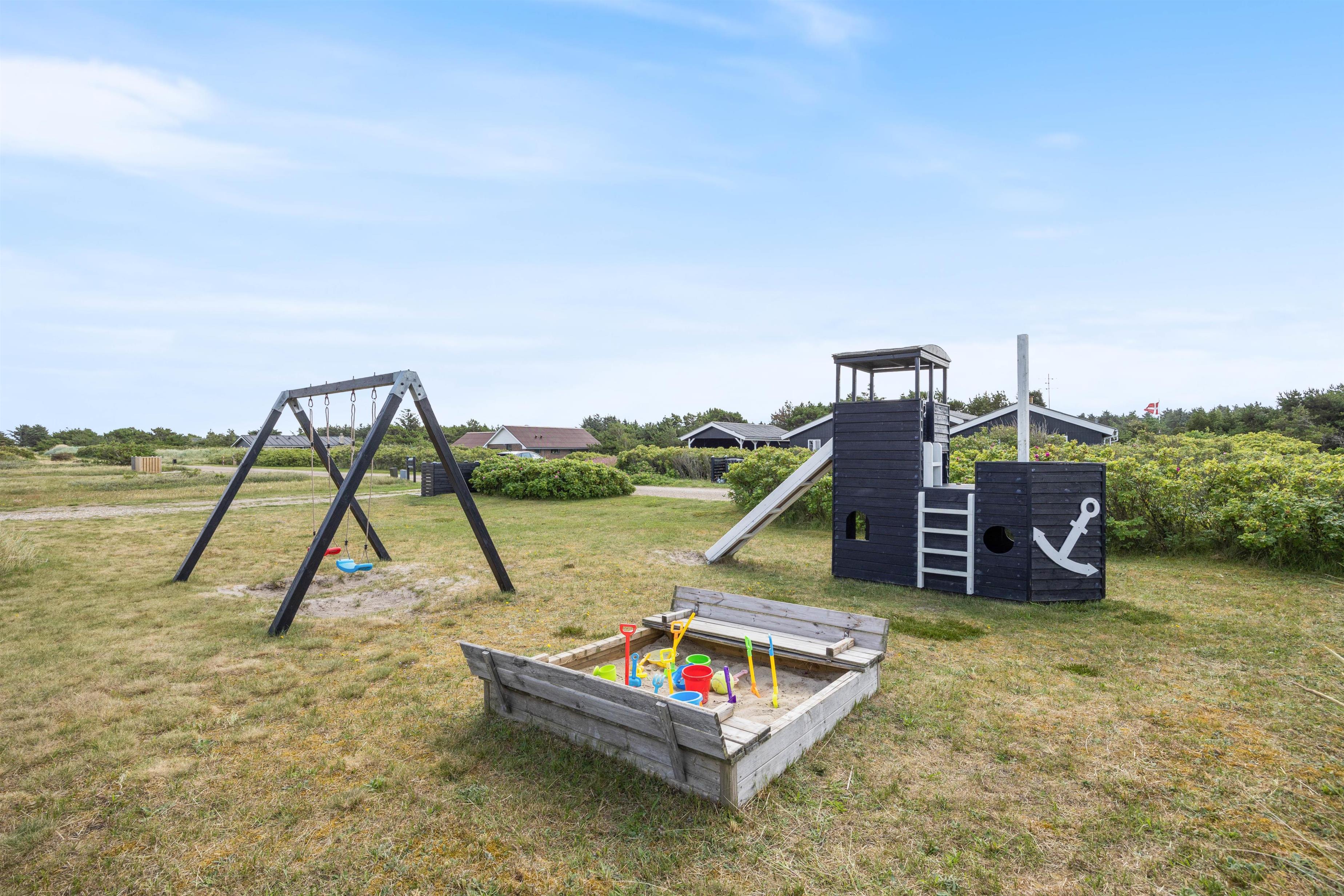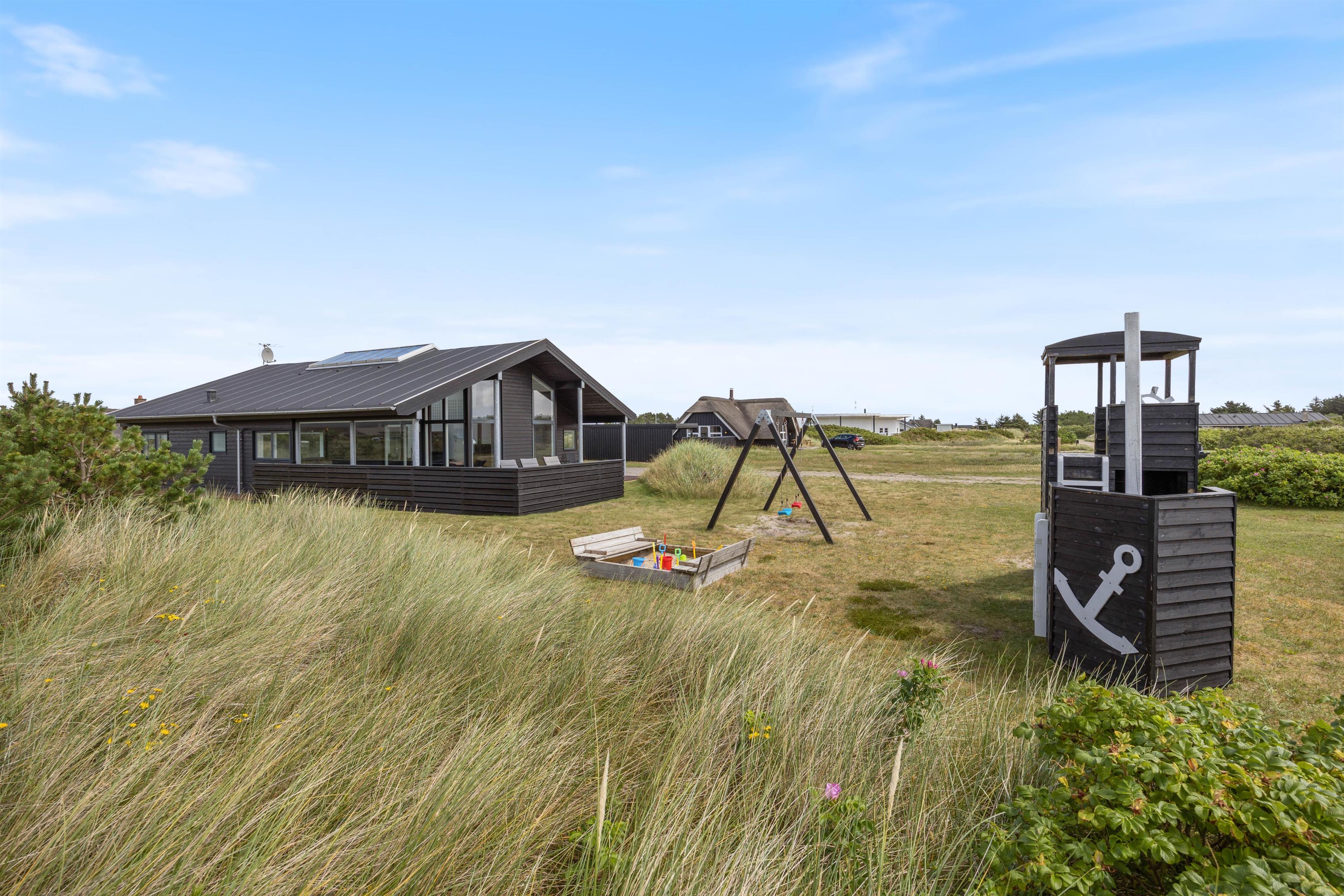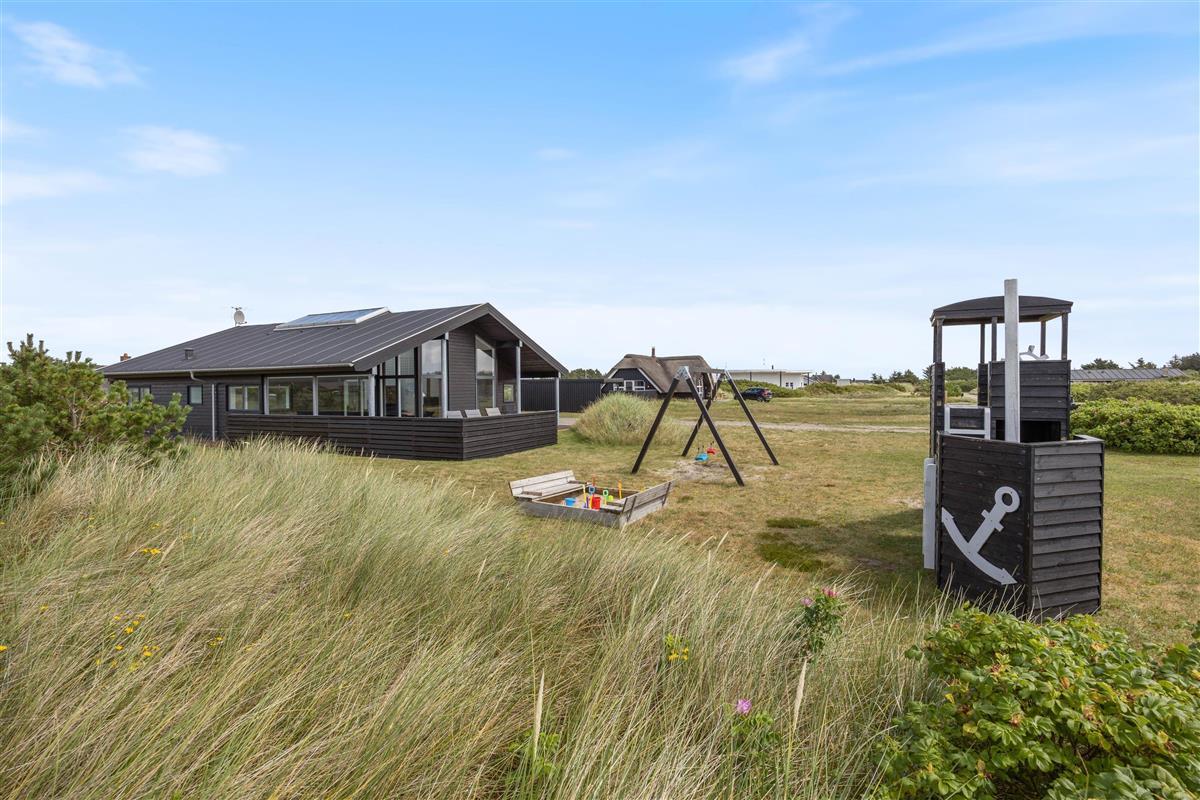 The holiday home at Jakob Bondes Vej 22 in Søndervig sits on a large plot bordering a protected nature area. The grounds offer plenty of space for play, complete with a swing, sandbox and climbing frame for children.