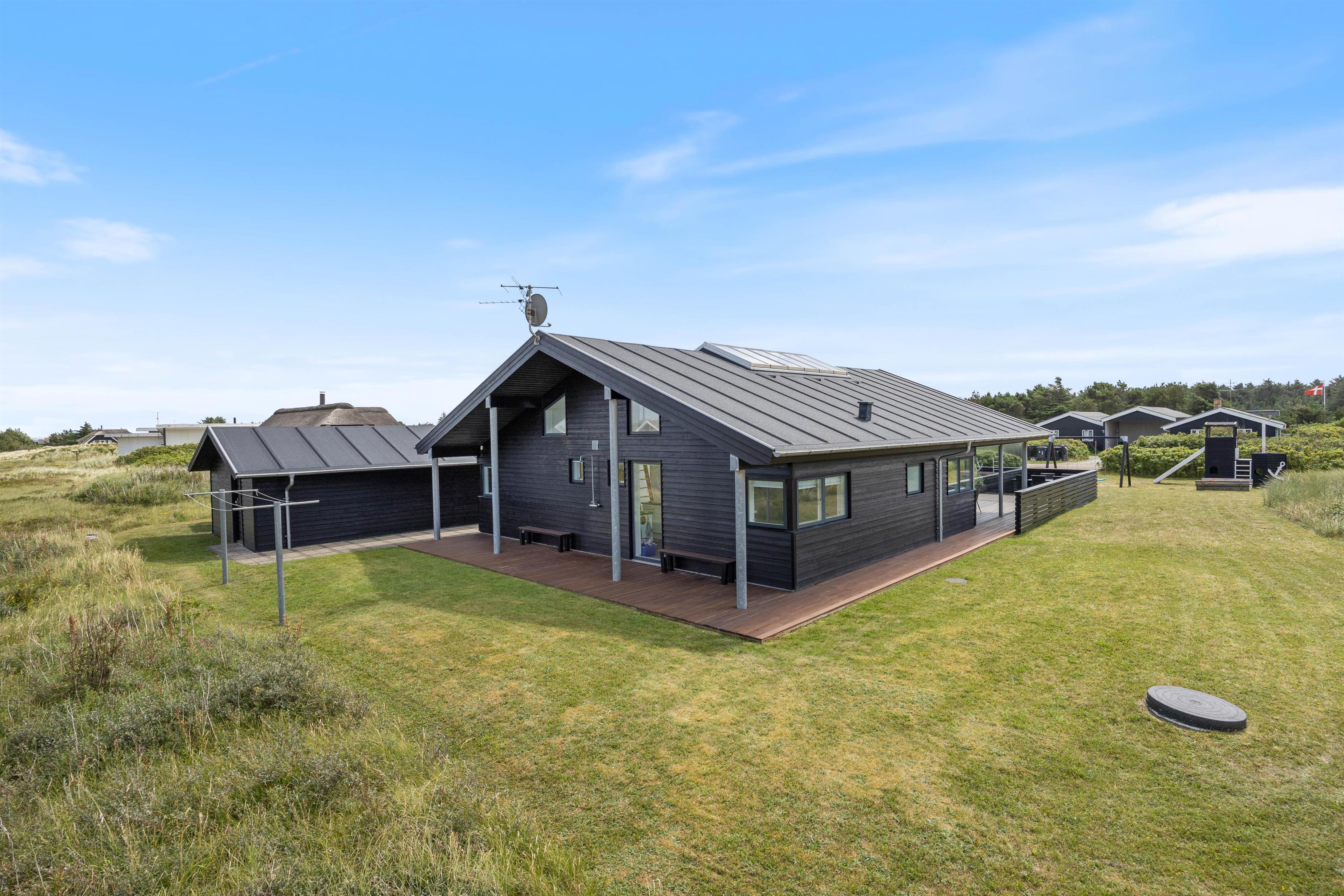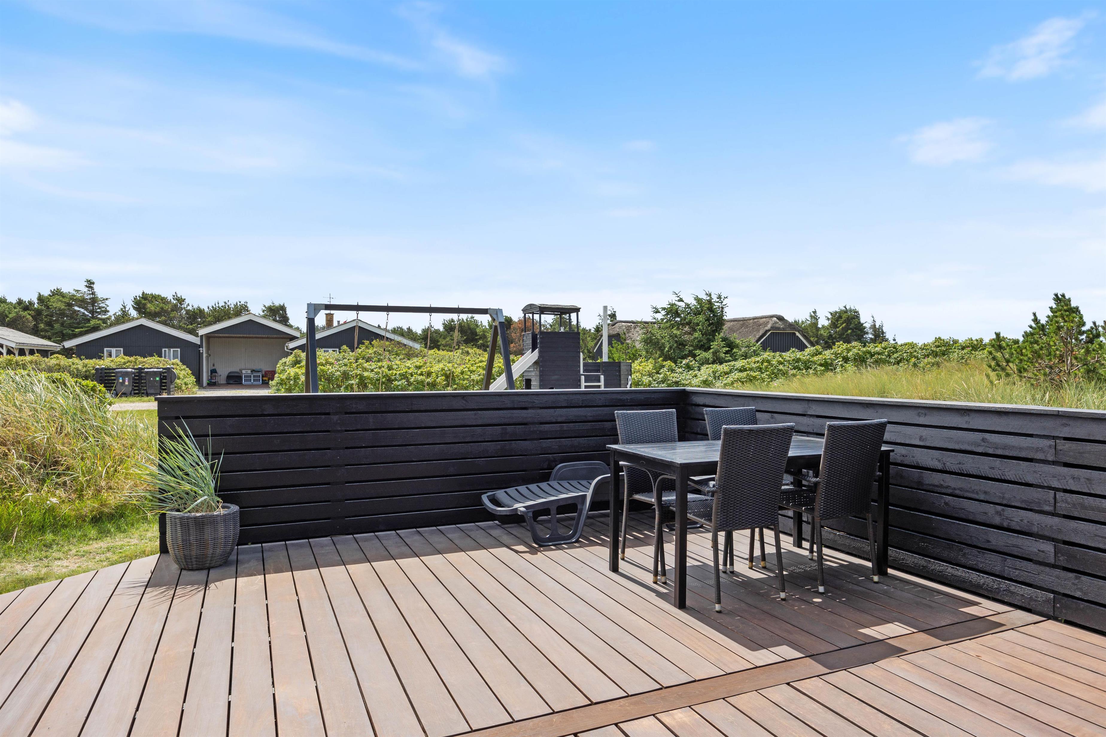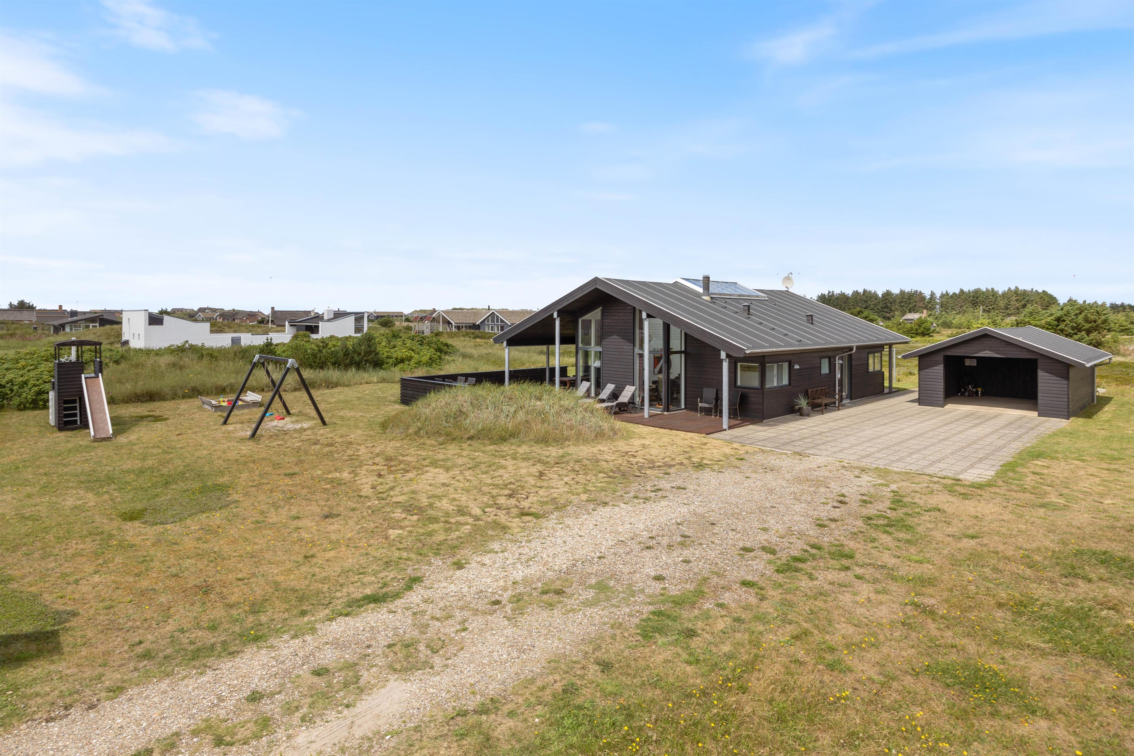 The holiday home at Jakob Bondes Vej 22 in Søndervig sits on a large plot bordering a protected nature area. The grounds offer plenty of space for play, complete with a swing, sandbox and climbing frame for children.