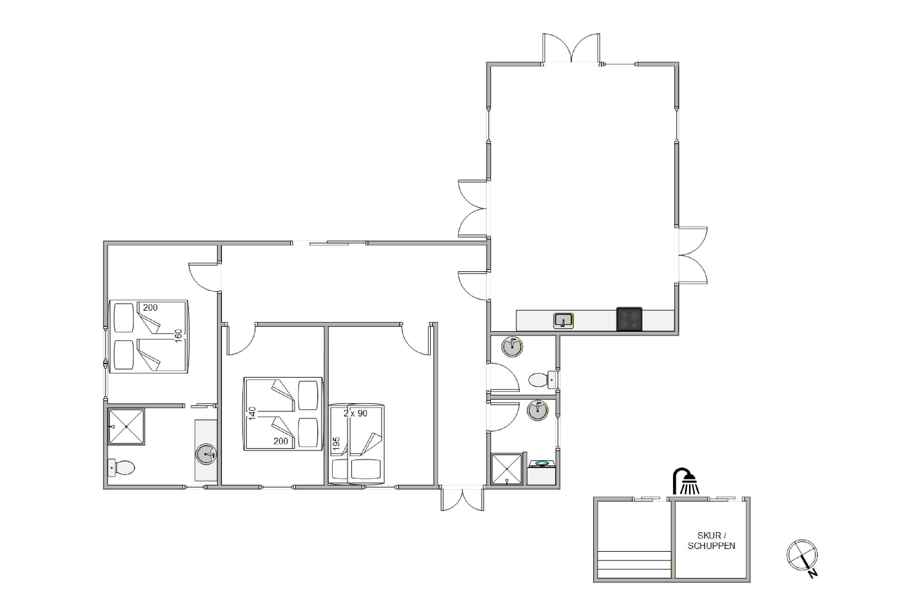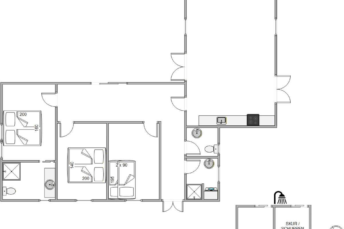 Im Ferienhaus stehen euch drei Schlafzimmer zur Verfügung. Zwei Schlafzimmer sind mit Doppelbetten ausgestattet, während das dritte Zimmer mit zwei Etagenbetten ideal für Kinder oder weitere Gäste ist. Zwei Badezimmer mit Fußbodenheizung im Bad versprechen euch Wohlbefinden schon gleich nach dem Aufstehen. Eine Waschmaschine steht euch zur Verfügung, dadurch braucht ihr nur eure Lieblingskleidung einzupacken.