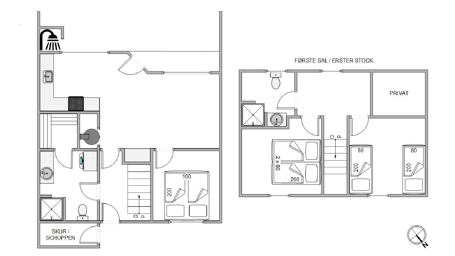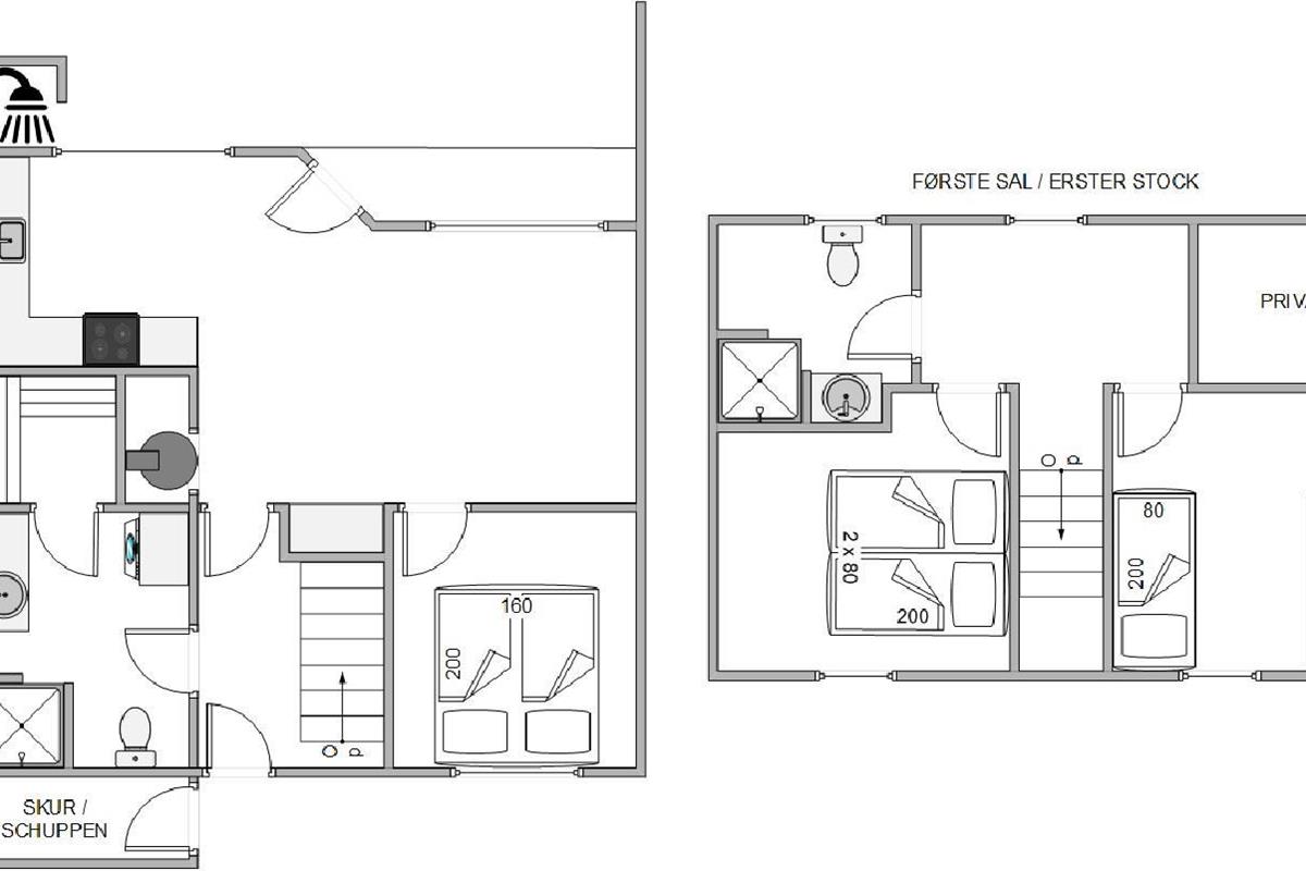 The holiday home accommodates 6 people across two floors. The ground floor features an open-plan kitchen, living and dining area, one bedroom, a bathroom, and the sauna. Upstairs, you'll find an additional bathroom and two bedrooms. There's no need to worry about laundry, as a washing machine and tumble dryer are provided. The holiday home benefits from energy-efficient district heating.