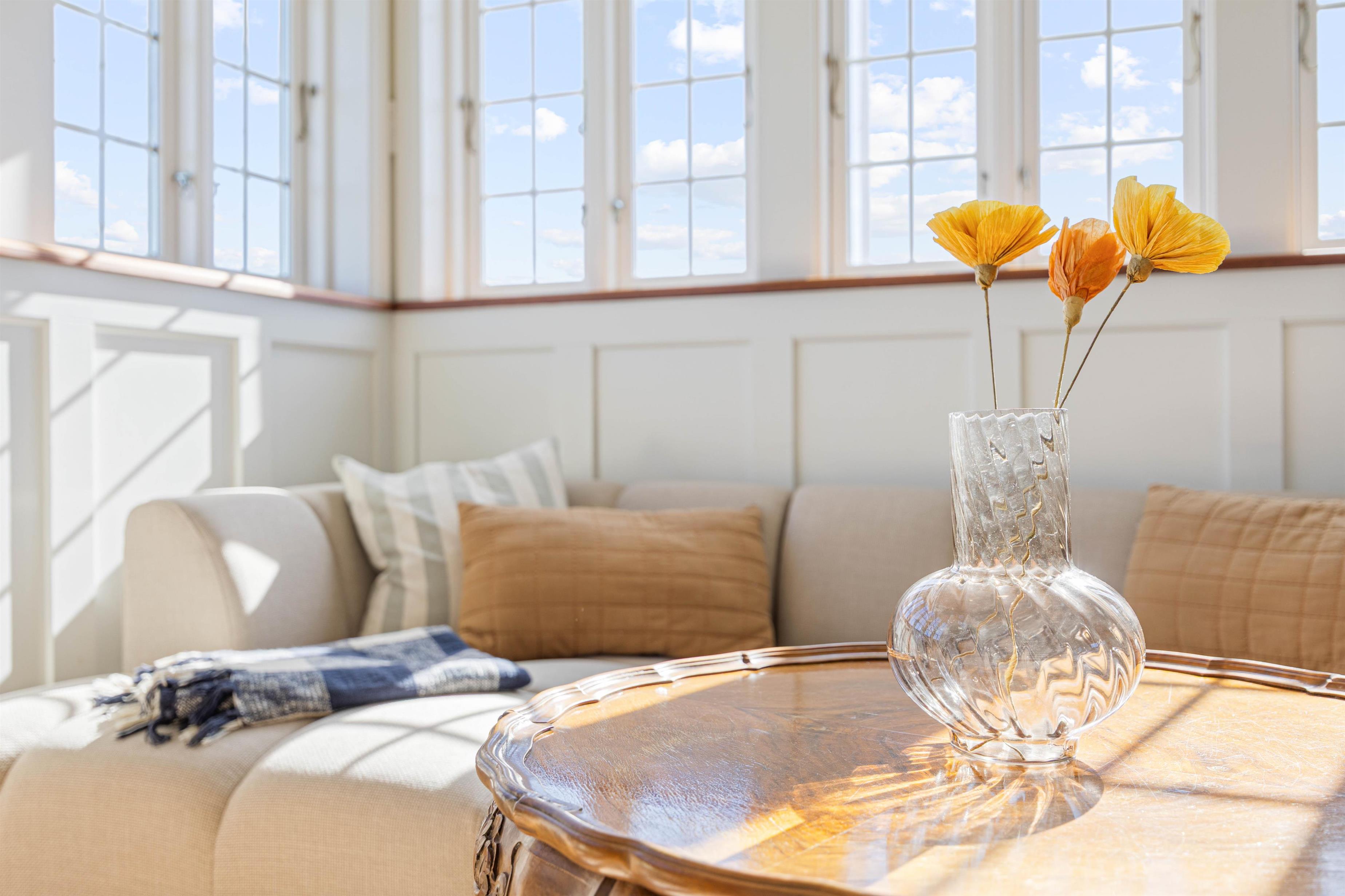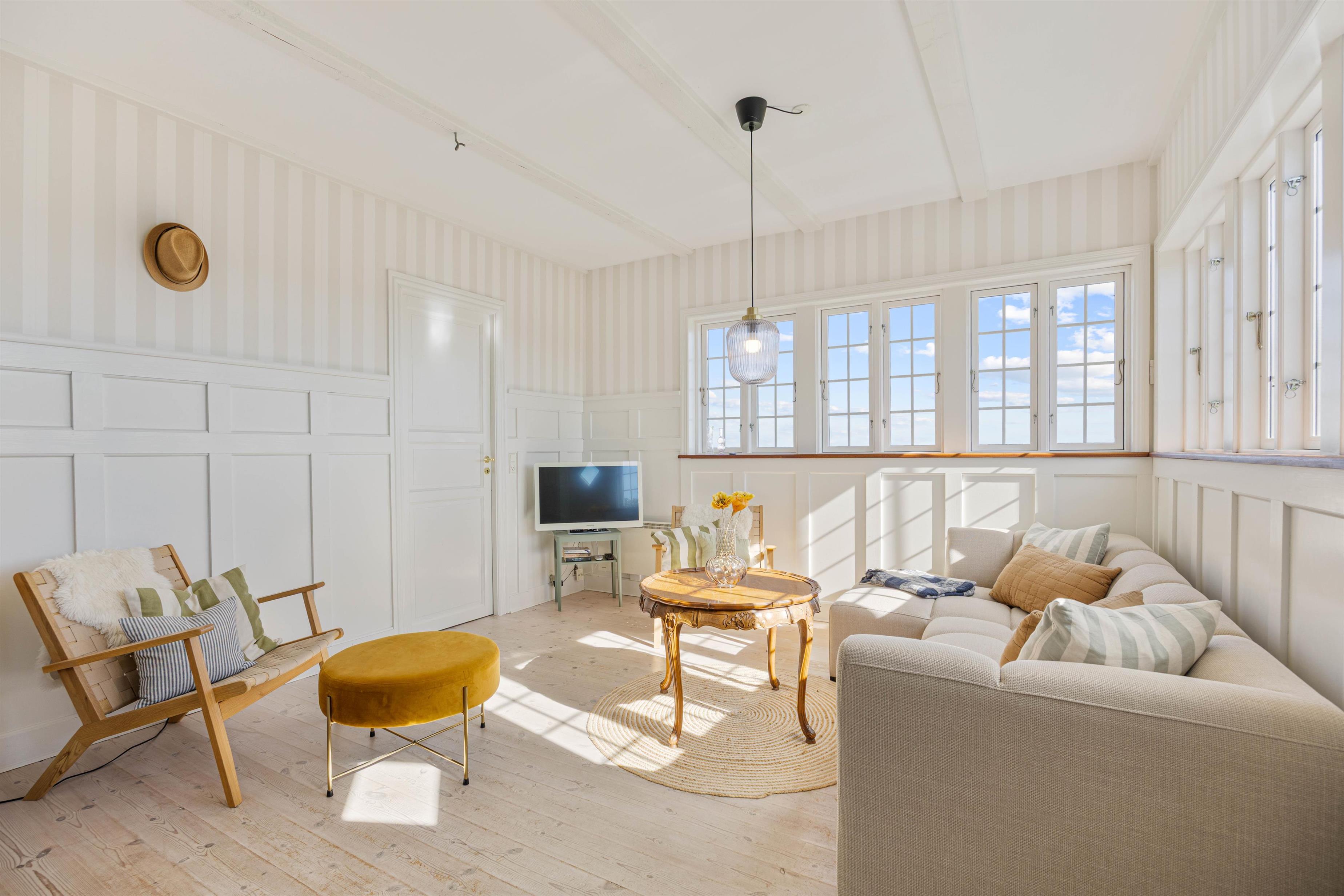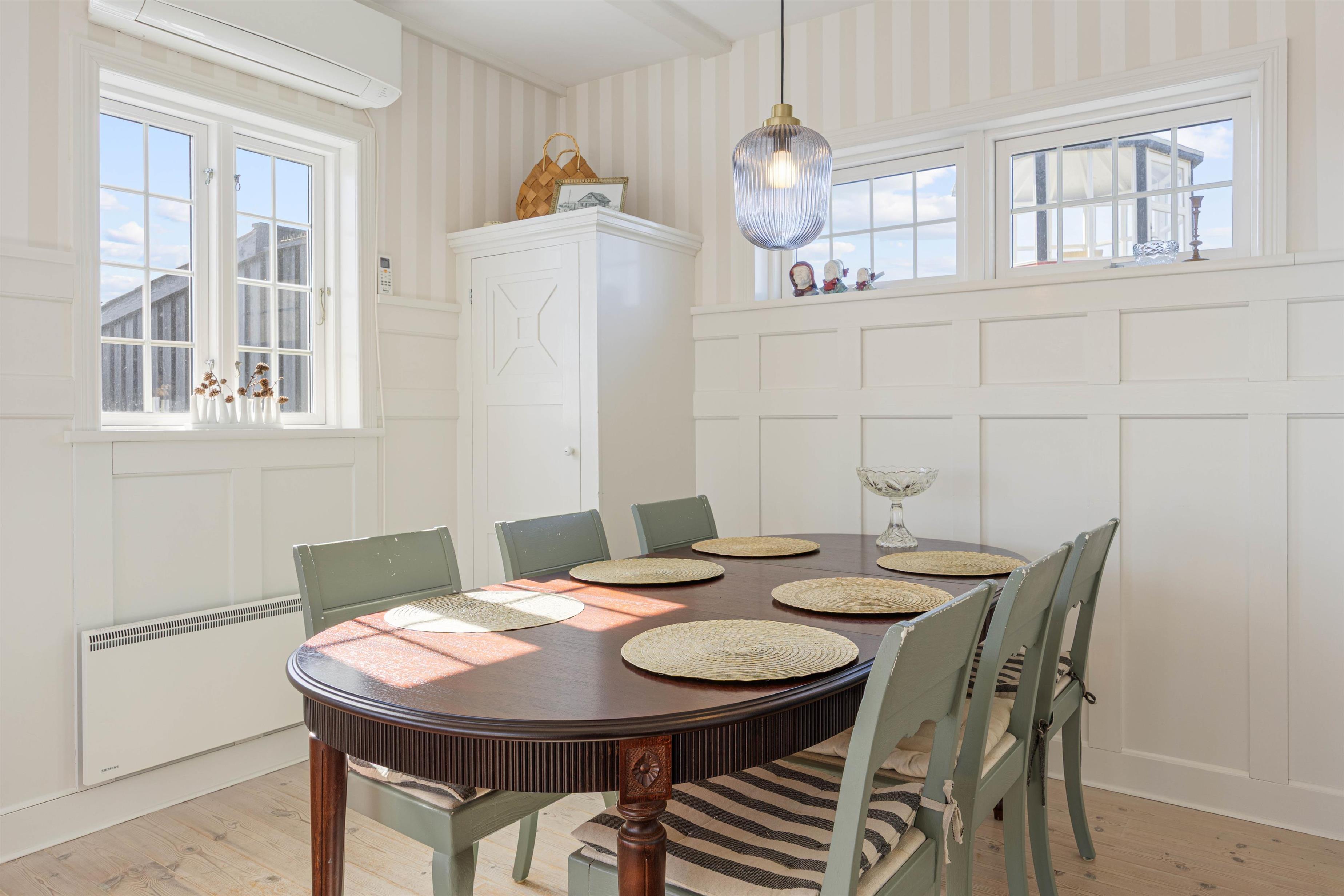 Sobald ihr dieses Ferienhaus betretet, werdet ihr die besondere Atmosphäre eines Strandhotels erleben, die das Haus einzigartig macht. Die schöne Wandvertäfelung, die schönen Tapeten und die Sprossenfenster schaffen eine authentische und gemütliche Atmosphäre, wie man sie nur selten in traditionellen Ferienhäusern zur Miete findet. Das Wohnzimmer ist mit Sofamöbeln und einer Essecke ausgestattet und ist hell und offen gestaltet. Durch die vielen Fenster habt ihr eine fantastische Aussicht auf Søndervig und die umliegende Dünenlandschaft – ideal für alle, die ein Ferienhaus mit Aussicht suchen.