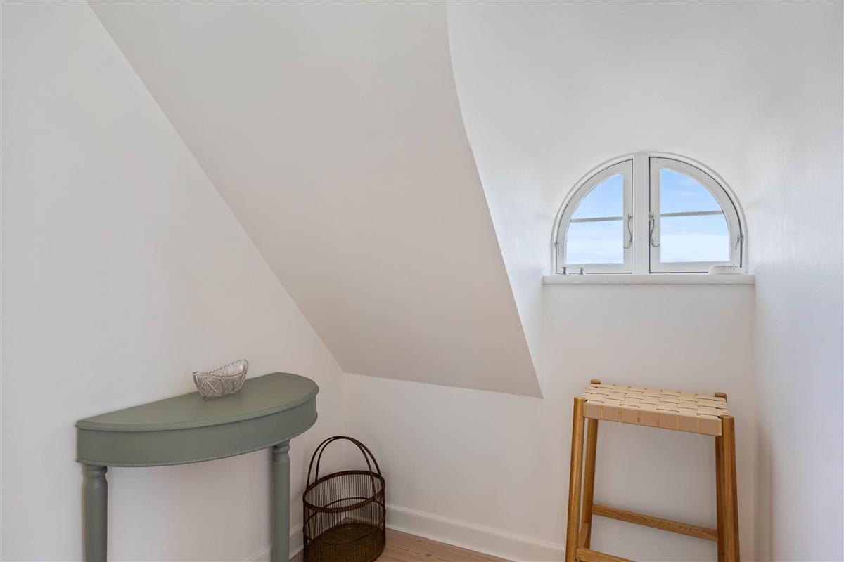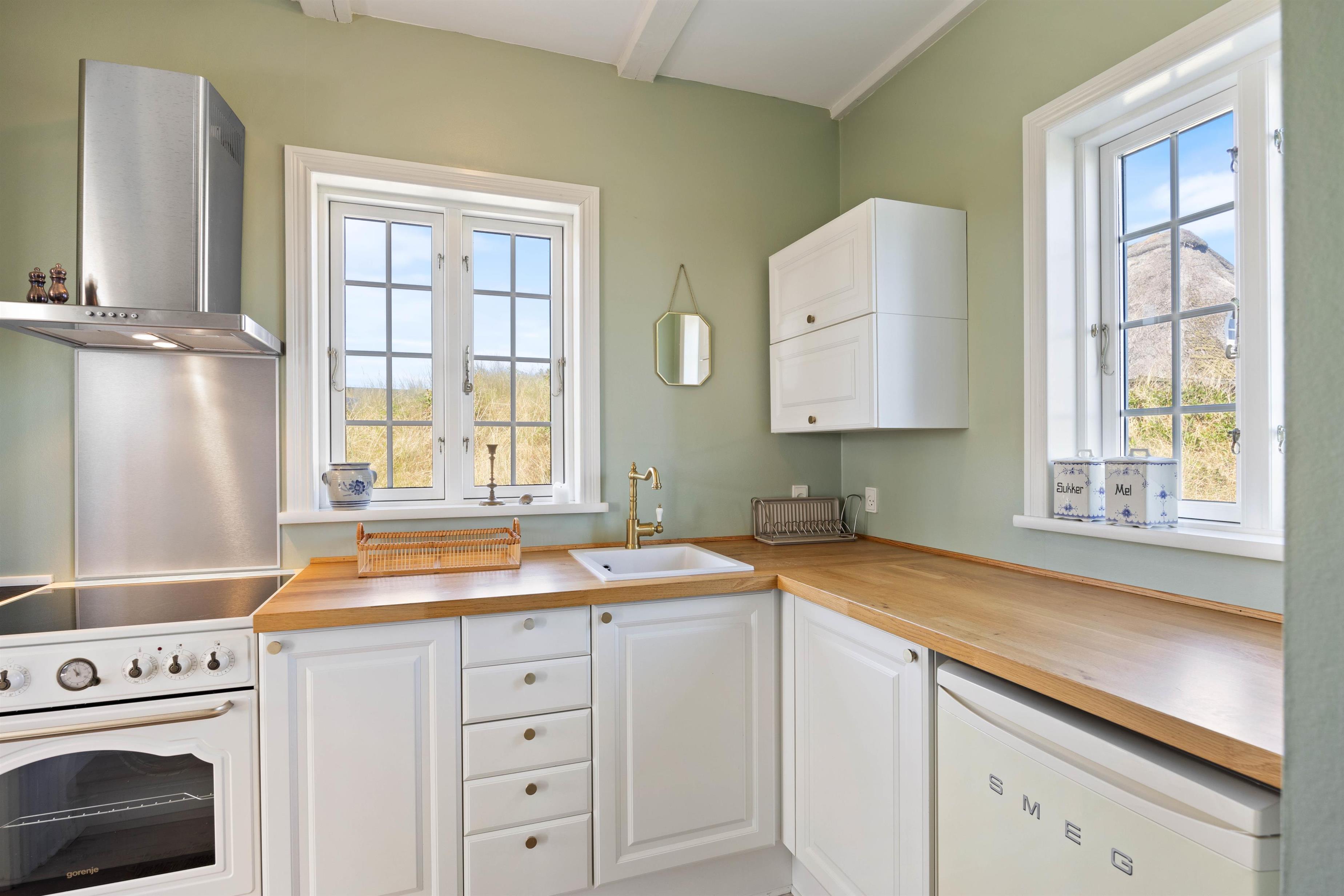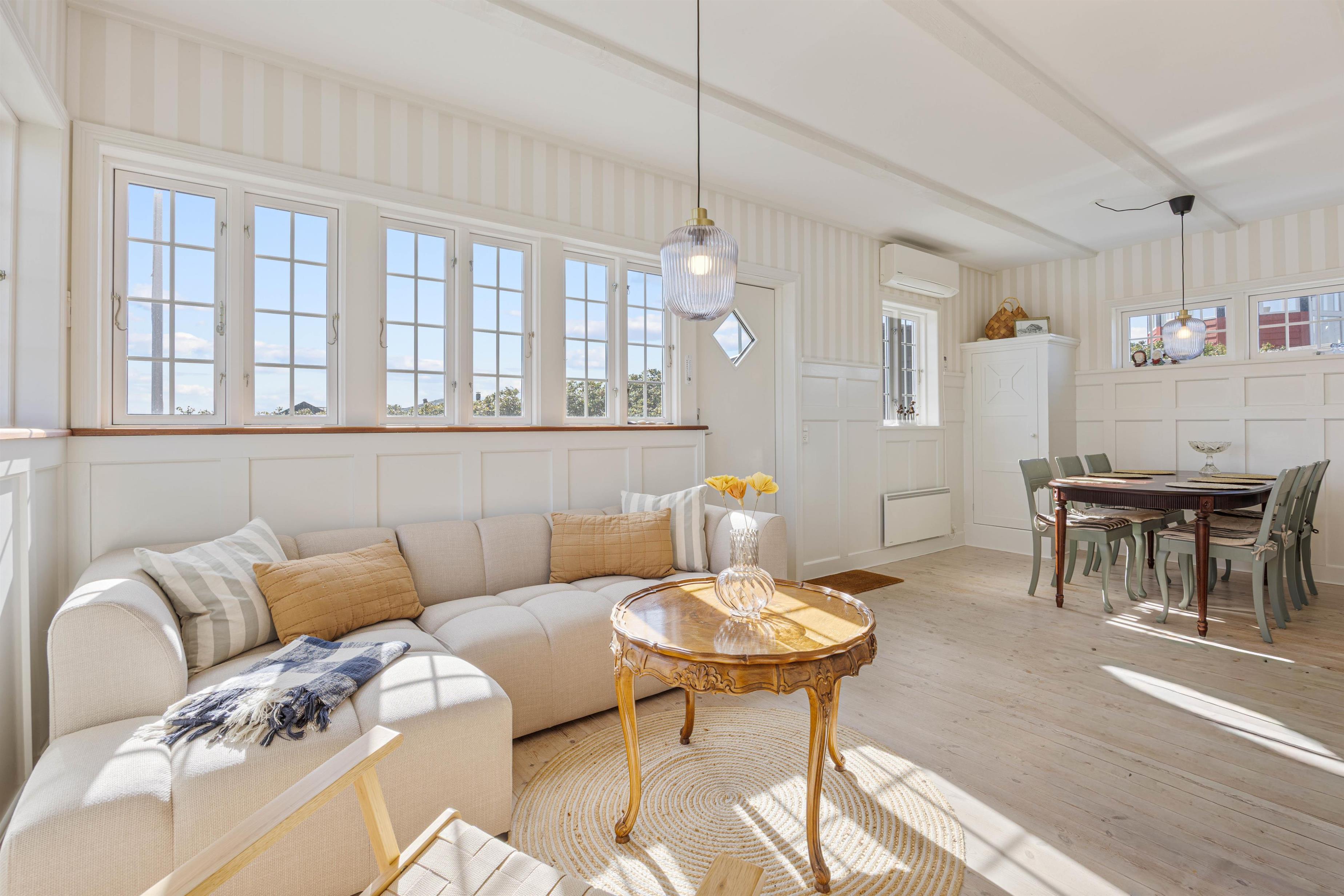 Sobald ihr dieses Ferienhaus betretet, werdet ihr die besondere Atmosphäre eines Strandhotels erleben, die das Haus einzigartig macht. Die schöne Wandvertäfelung, die schönen Tapeten und die Sprossenfenster schaffen eine authentische und gemütliche Atmosphäre, wie man sie nur selten in traditionellen Ferienhäusern zur Miete findet. Das Wohnzimmer ist mit Sofamöbeln und einer Essecke ausgestattet und ist hell und offen gestaltet. Durch die vielen Fenster habt ihr eine fantastische Aussicht auf Søndervig und die umliegende Dünenlandschaft – ideal für alle, die ein Ferienhaus mit Aussicht suchen.