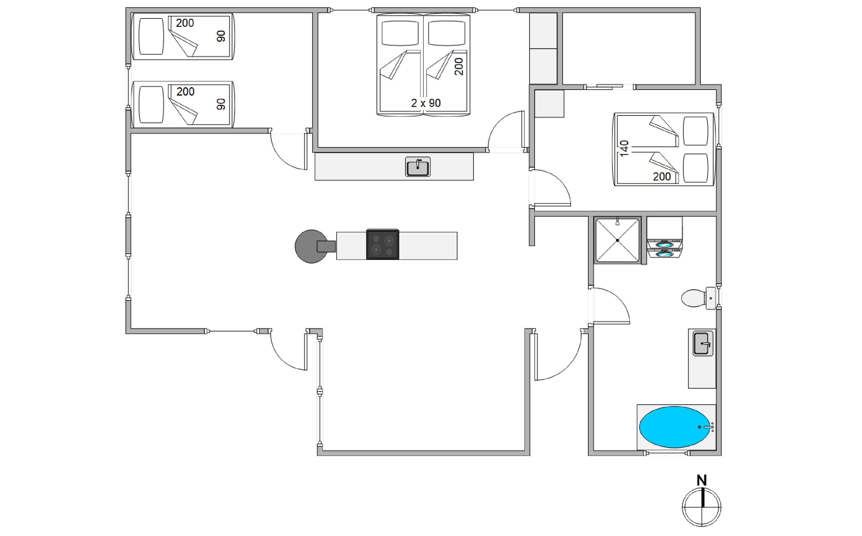 The holiday home features three bedrooms, all accessed from the living area. Two bedrooms each have a double bed, while the third bedroom offers two single beds. The bathroom includes a whirlpool for extra relaxation.