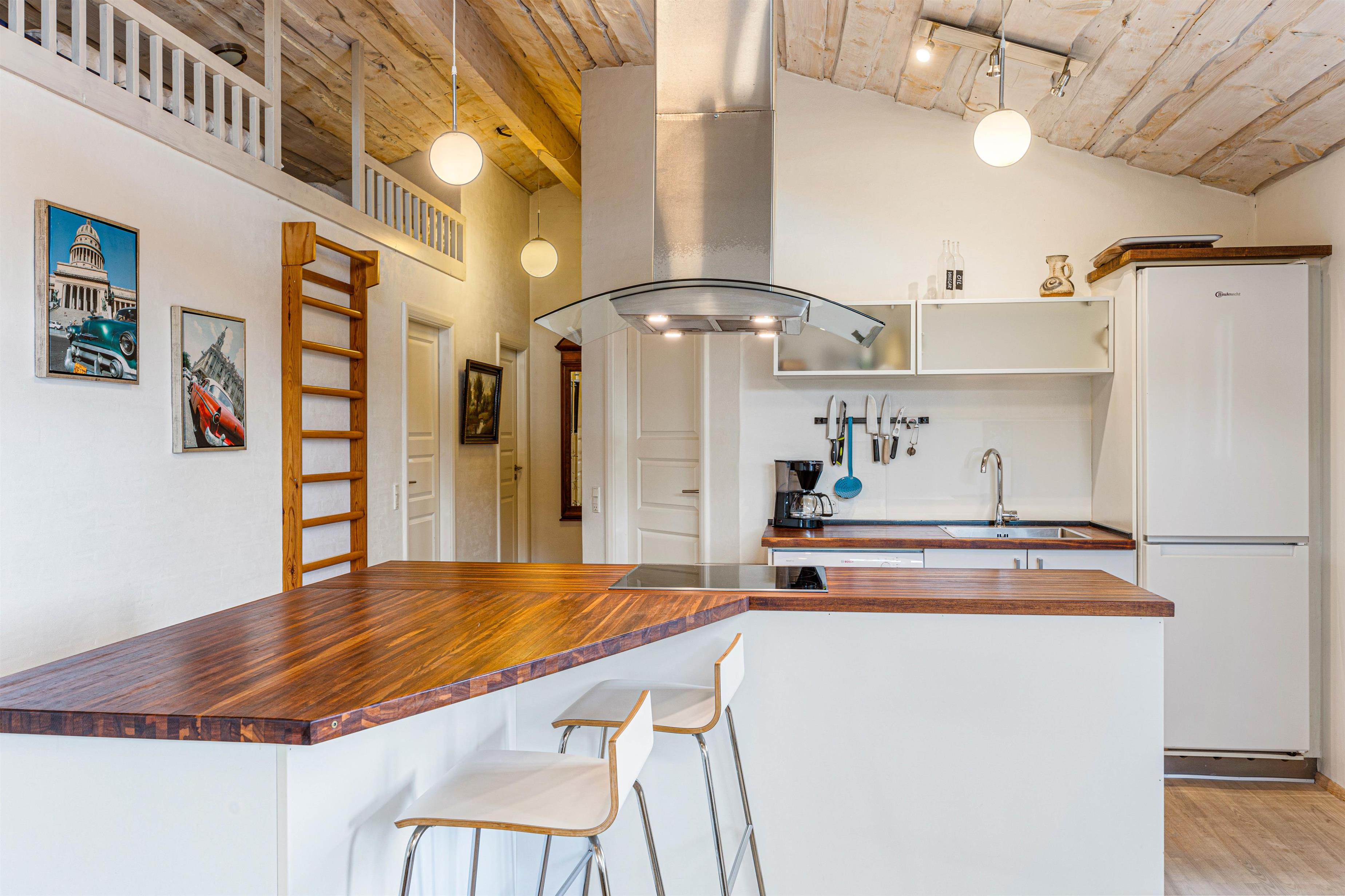 Part of the living room is split-level, set slightly lower than the kitchen. Here you'll find comfortable sofas - perfect for putting your feet up and watching your favourite series in peace.