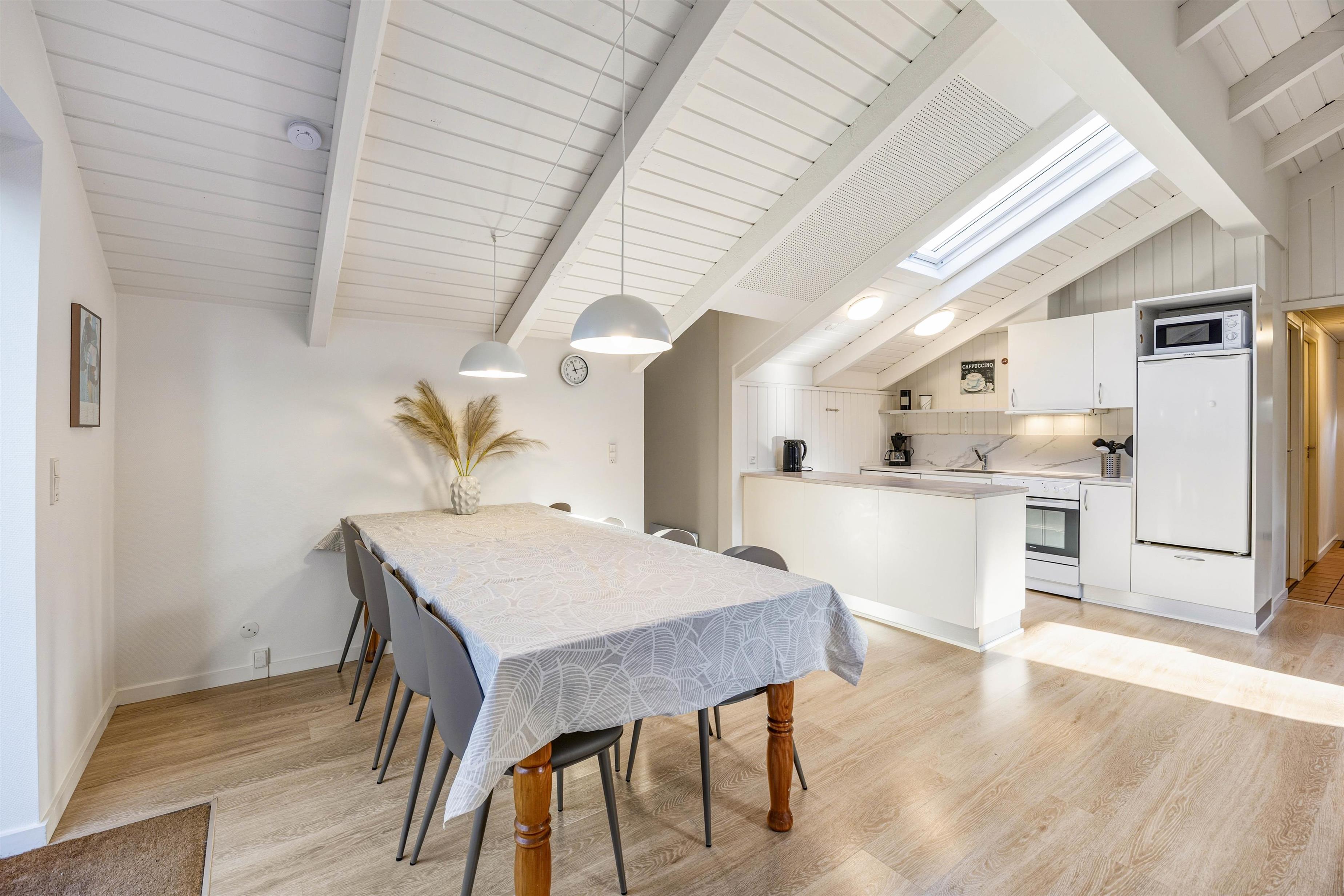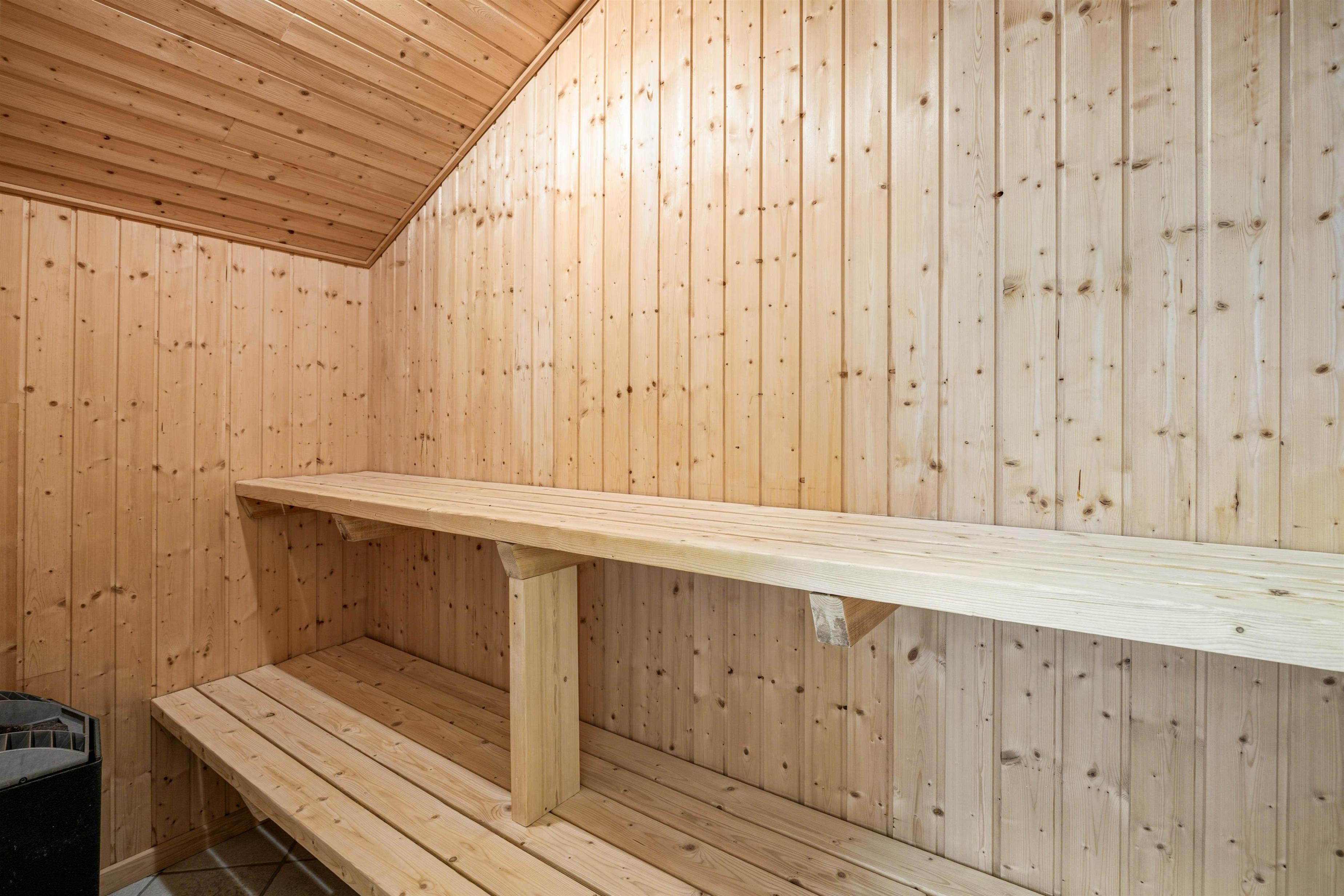 This holiday home accommodates 7 people across 4 bedrooms. There are 3 bedrooms with double beds and one with a single bed, ensuring comfortable sleeping arrangements for all. The open-plan kitchen adjoining the living room is equipped with a microwave, dishwasher and a separate 100-litre freezer, making cooking and food storage effortless. A washing machine and tumble dryer are also provided for convenient laundry facilities. The heart of the holiday home is undoubtedly the welcoming living room, furnished with comfortable seating, a wood-burning stove and a flat-screen TV. The living room provides access to the west-facing terrace, with its full-height ceiling allowing plenty of natural light through the skylight and terrace area. The former alcove in the living room has been transformed into a cosy reading corner, perfect for relaxing with a book by the wood-burning stove. The holiday home also features complimentary fibre broadband, keeping you connected throughout your stay. After a day of exploration and activities, you can unwind in the holiday home's sauna and whirlpool. With two bathrooms, there's ample space for everyone, and both feature underfloor heating ensuring warm feet on chilly mornings.