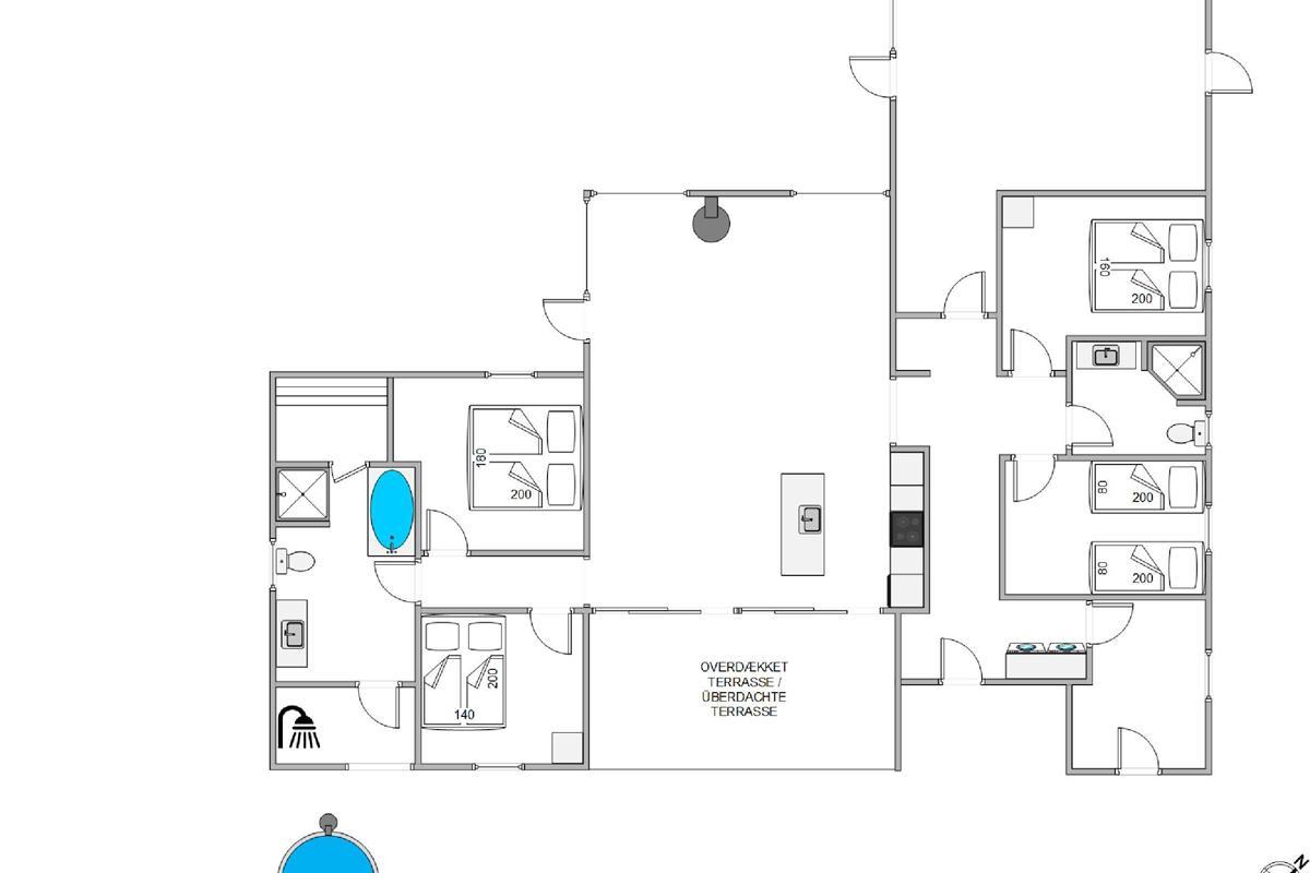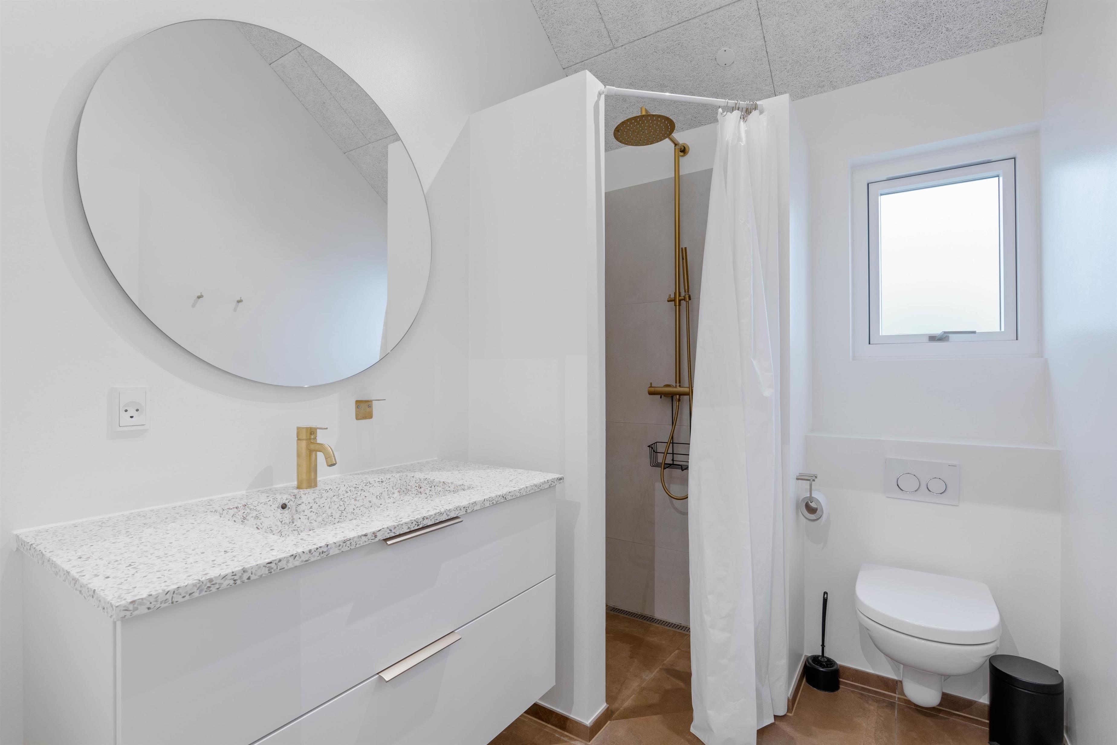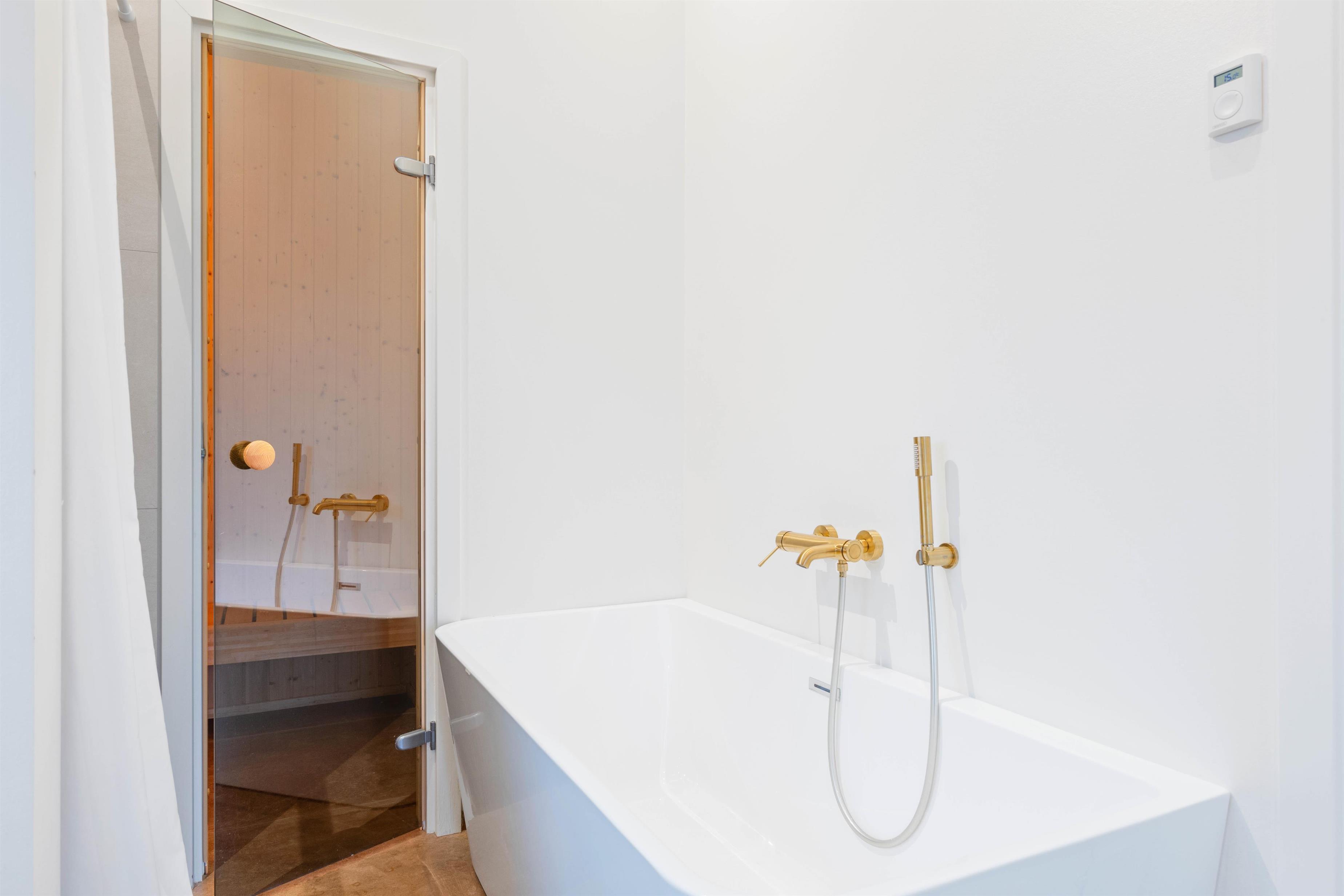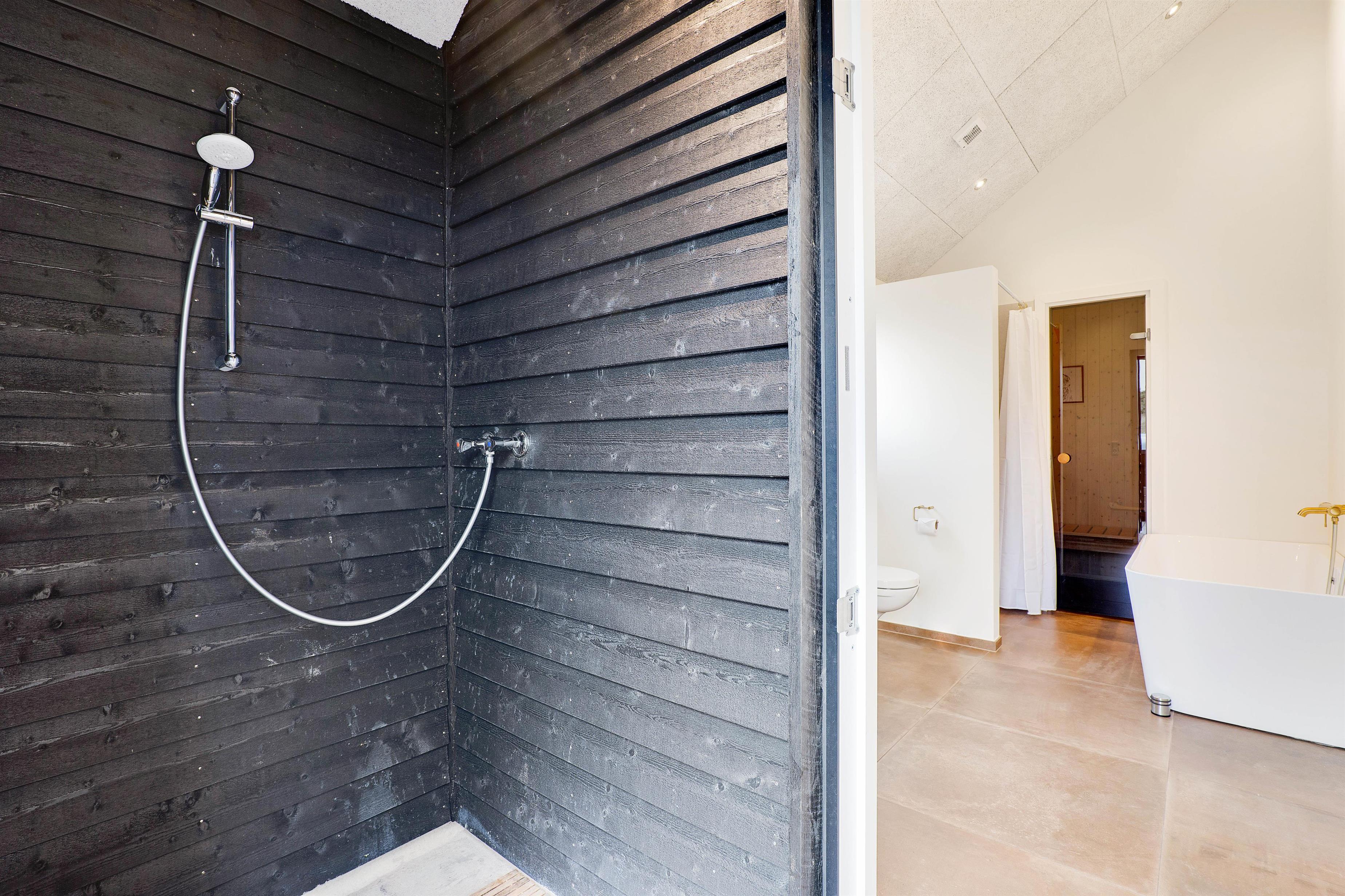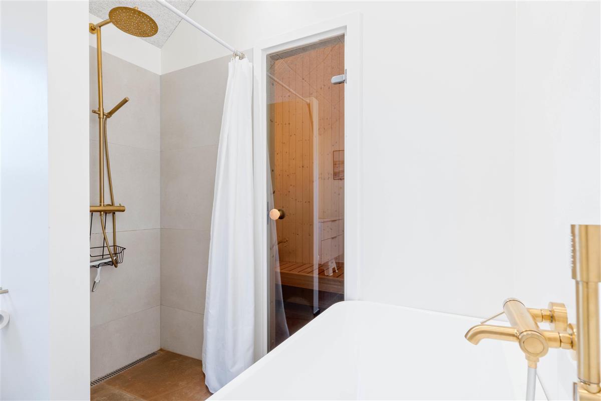 One terrace offers an additional highlight: a hot tub where you can relax after a long day at the beach. There's also an outdoor shower area (available April-November) leading to a large bathroom with bath and sauna, perfect for focusing on relaxation and well-being. Electric car charging is also taken care of, with a charging point installed at the holiday home.