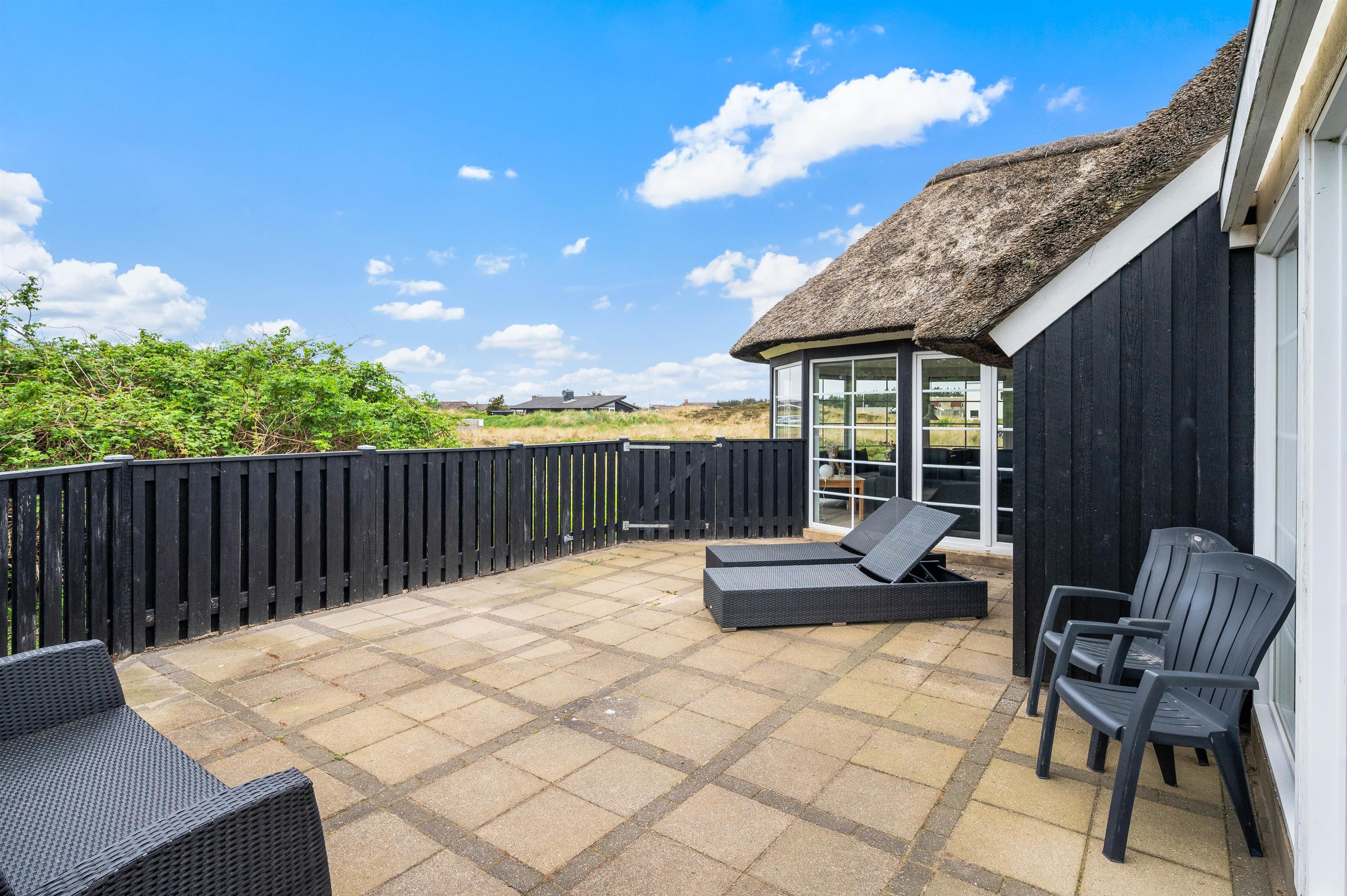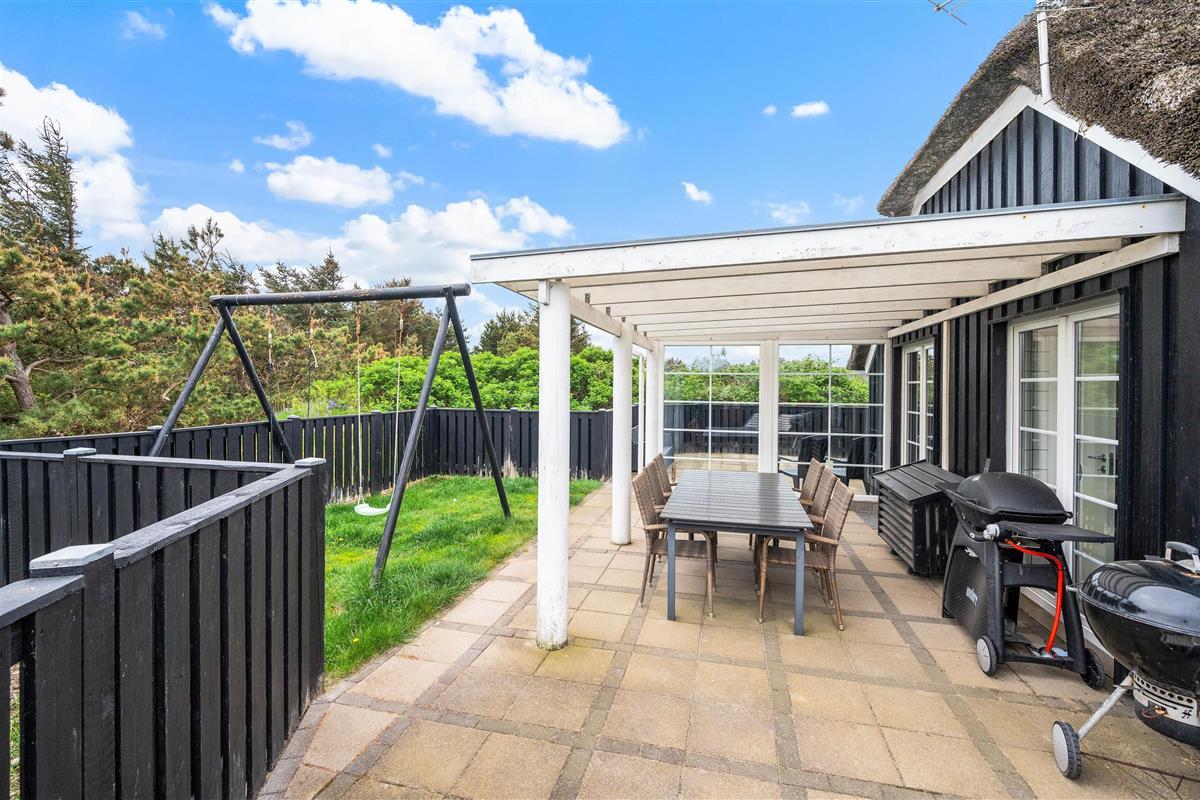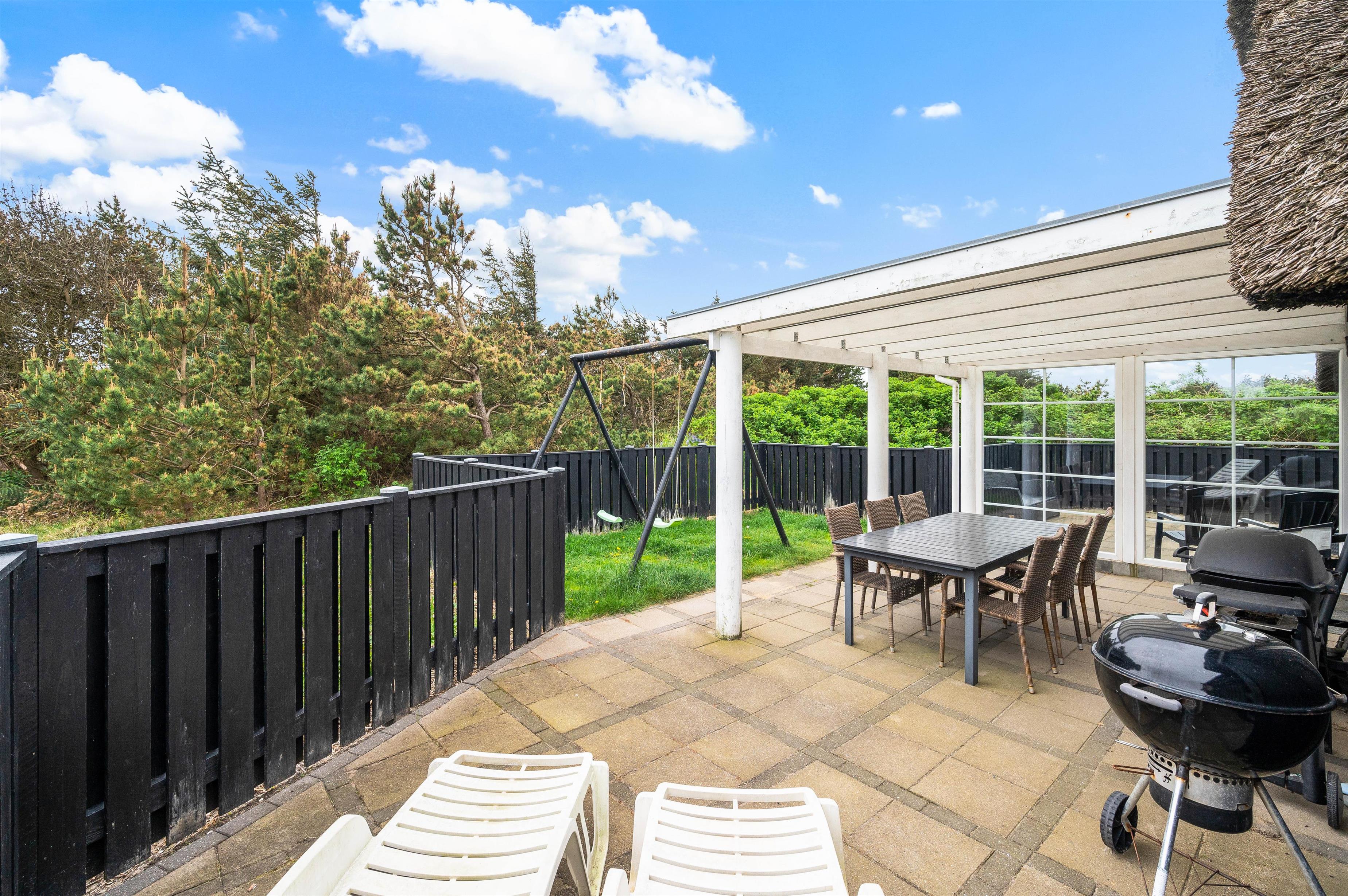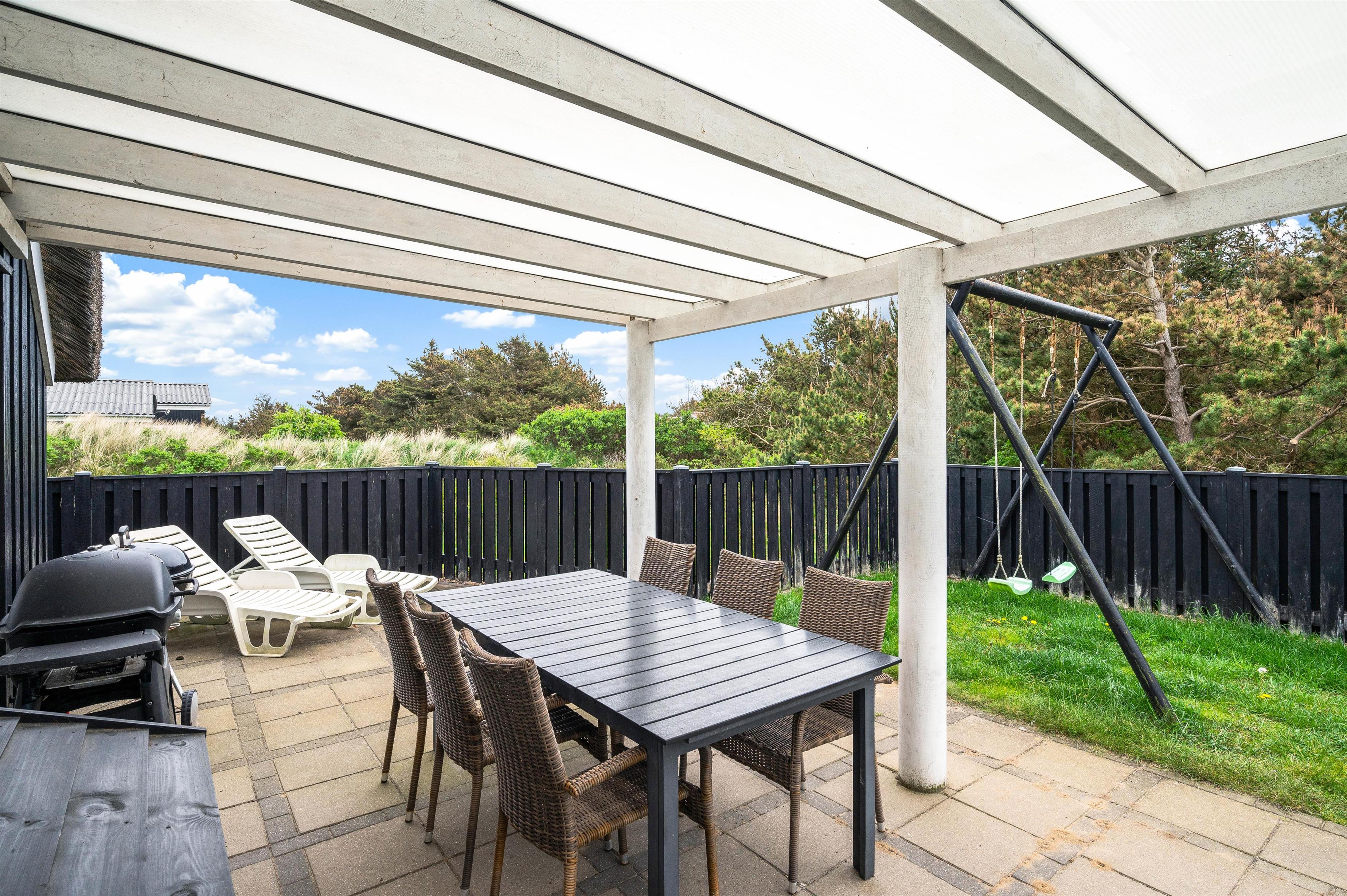 The terrace extends from the south side (where it is partially covered) all the way to the west side of the house. It is completely enclosed, making it a safe space for children and dogs. Depending on the wind direction, you can always find a sheltered spot to sit. The terrace is furnished with garden furniture, sun loungers and a barbecue.