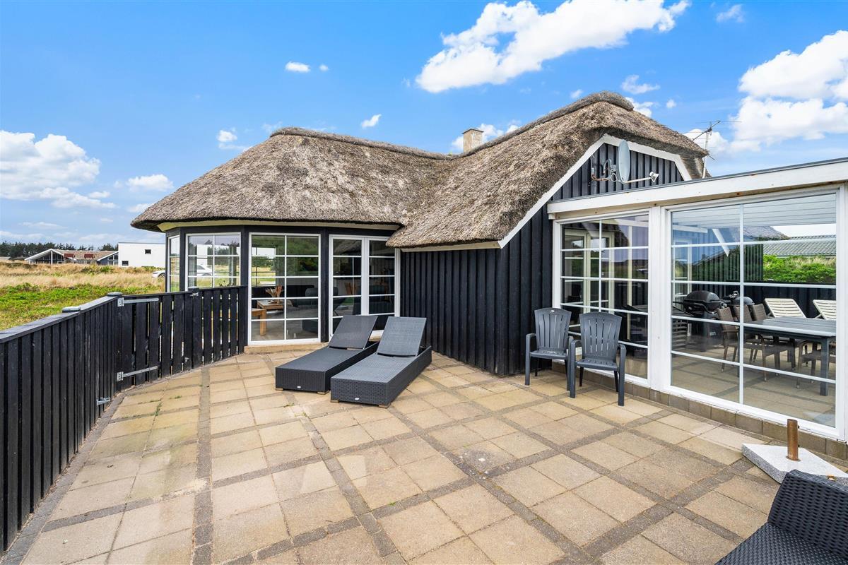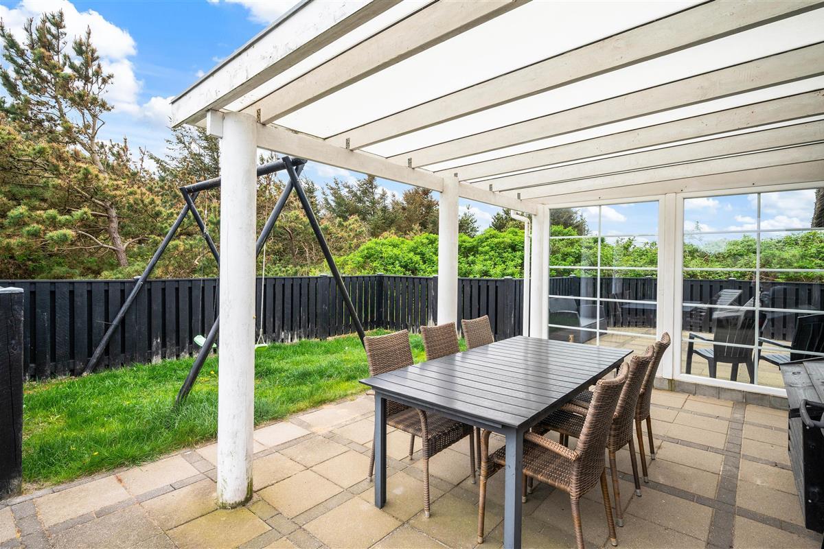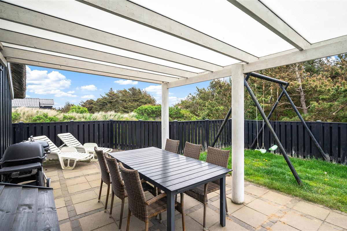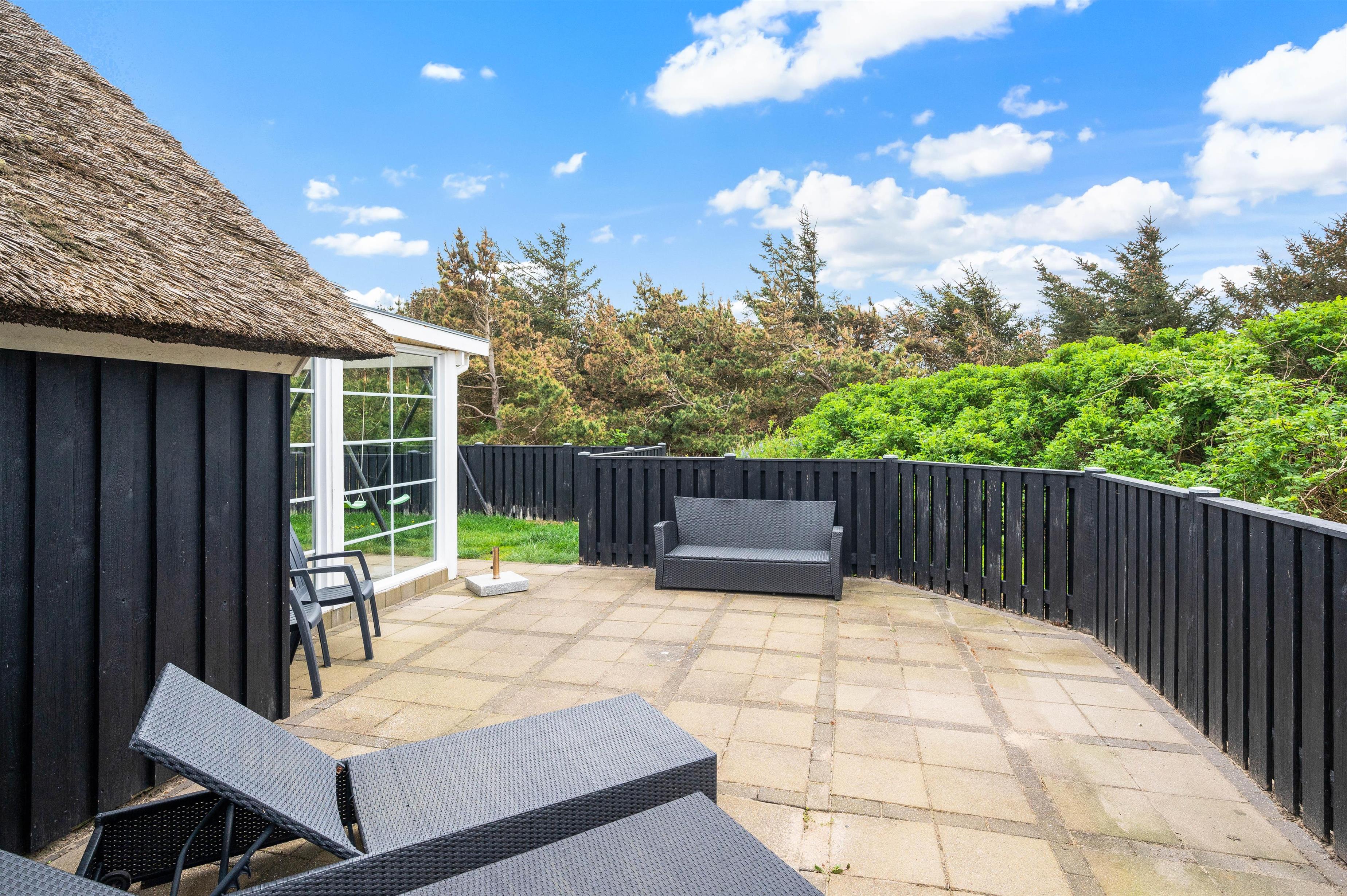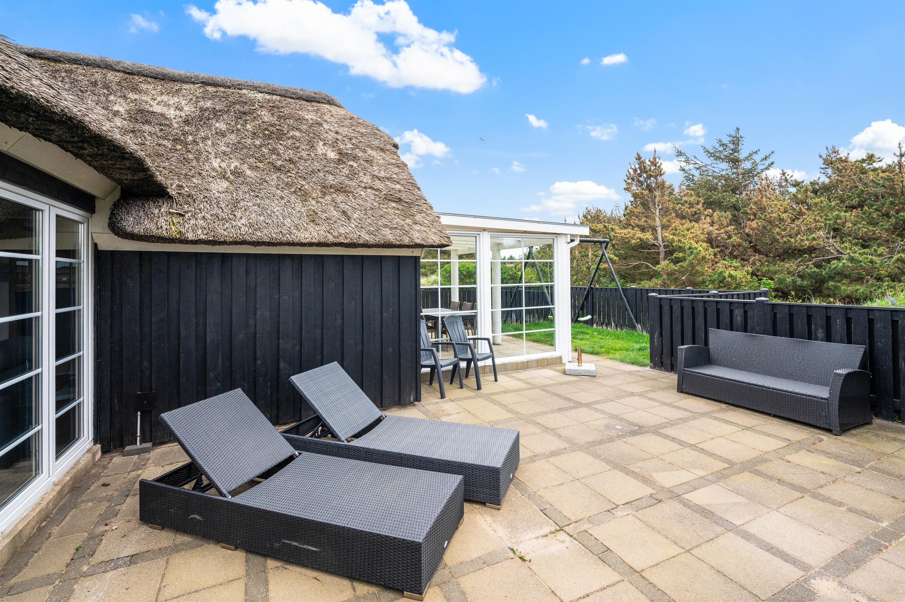 The terrace extends from the south side (where it is partially covered) all the way to the west side of the house. It is completely enclosed, making it a safe space for children and dogs. Depending on the wind direction, you can always find a sheltered spot to sit. The terrace is furnished with garden furniture, sun loungers and a barbecue.