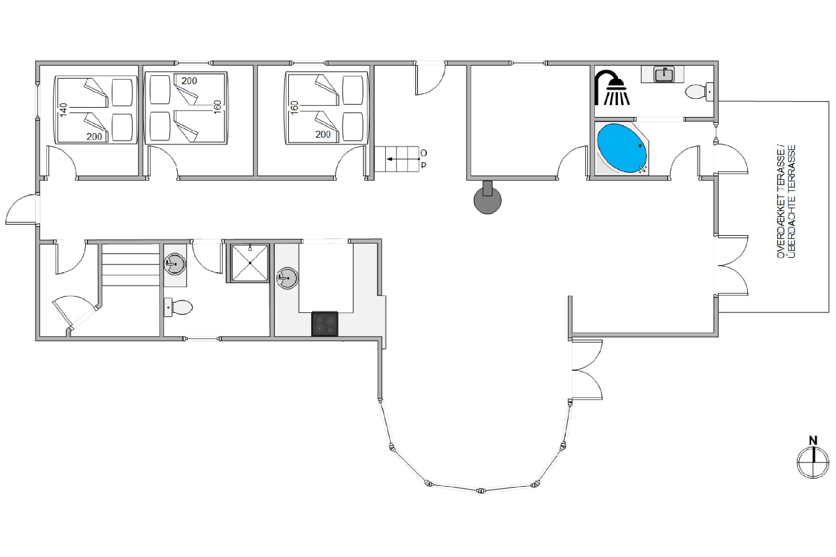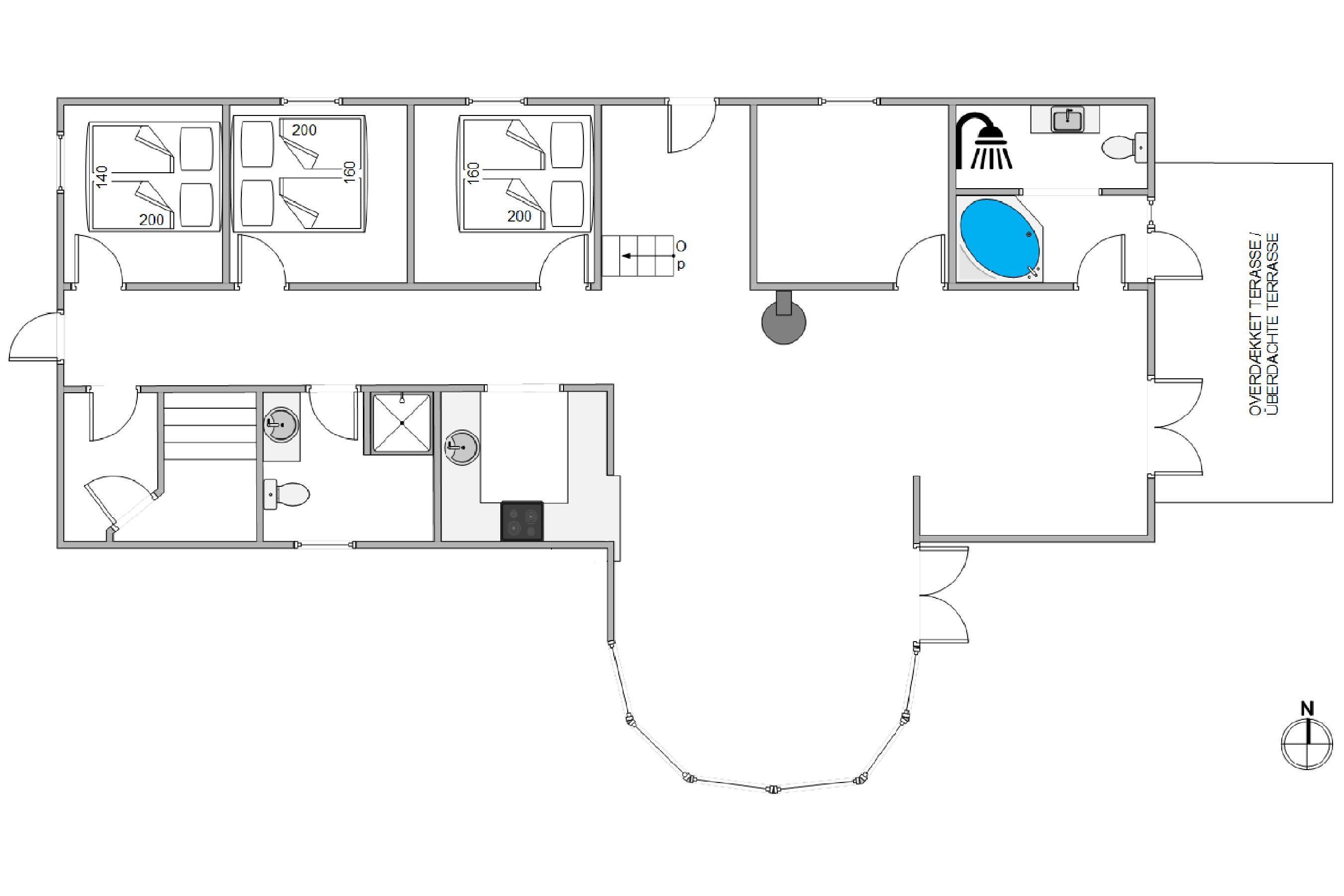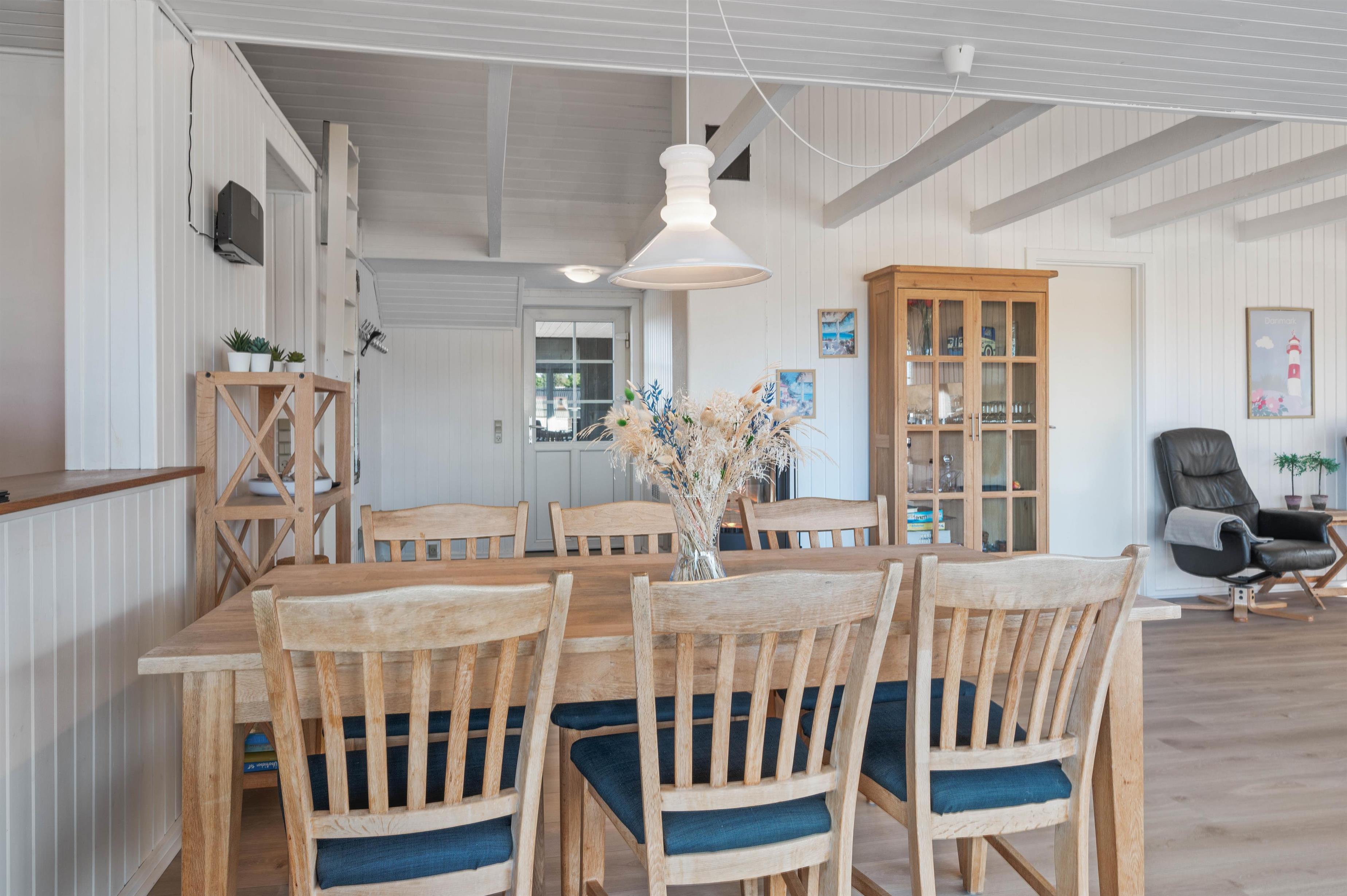 The heart of the house is undoubtedly the spacious open-plan kitchen, dining and living area. Here you can relax on the sofa while the wood-burning stove provides a comfortable warmth. The living and dining area is equipped with comfortable furniture, wood-burning stove, flat-screen TV and table football.