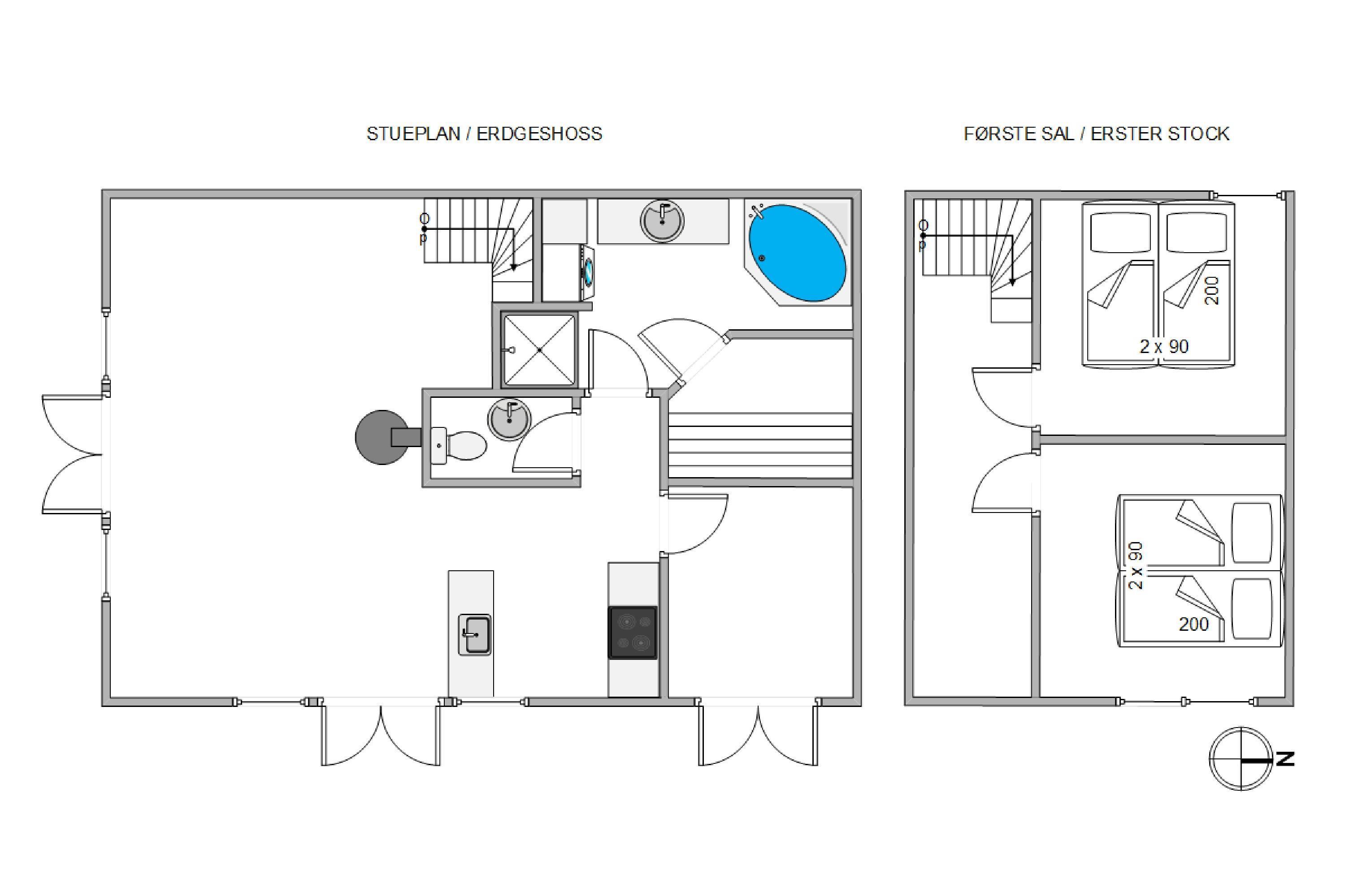 The holiday home features two upstairs bedrooms, each with a double bed, as well as a bathroom with sauna and whirlpool, plus a separate WC. The kitchen is equipped with a dishwasher and all everyday essentials. A washing machine and tumble dryer are also provided for your comfort.