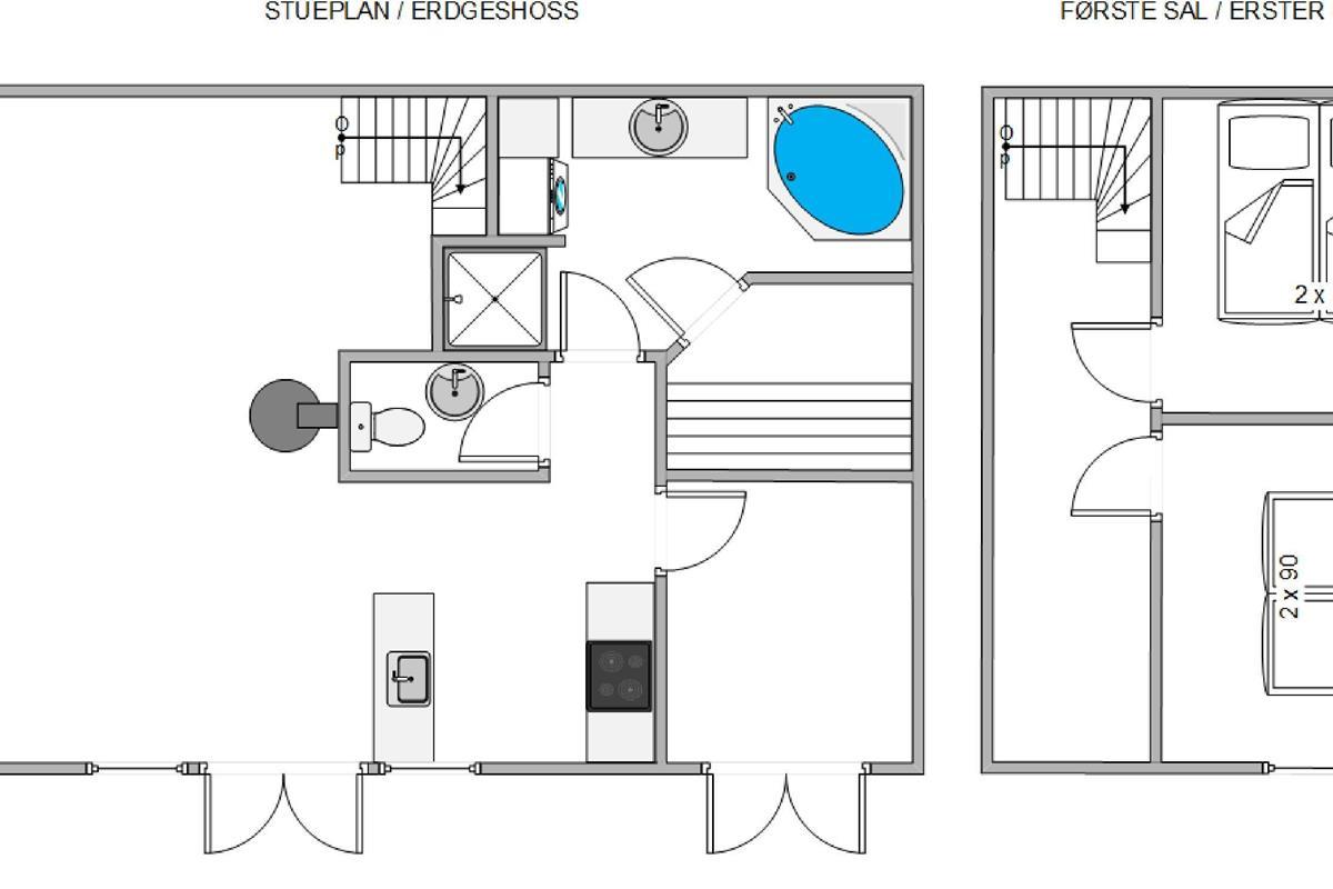 The holiday apartment features two upstairs bedrooms, each with a double bed, as well as a bathroom with sauna and whirlpool, plus a separate WC. The kitchen is equipped with a dishwasher and all everyday essentials. A washing machine and tumble dryer are also provided for your comfort.