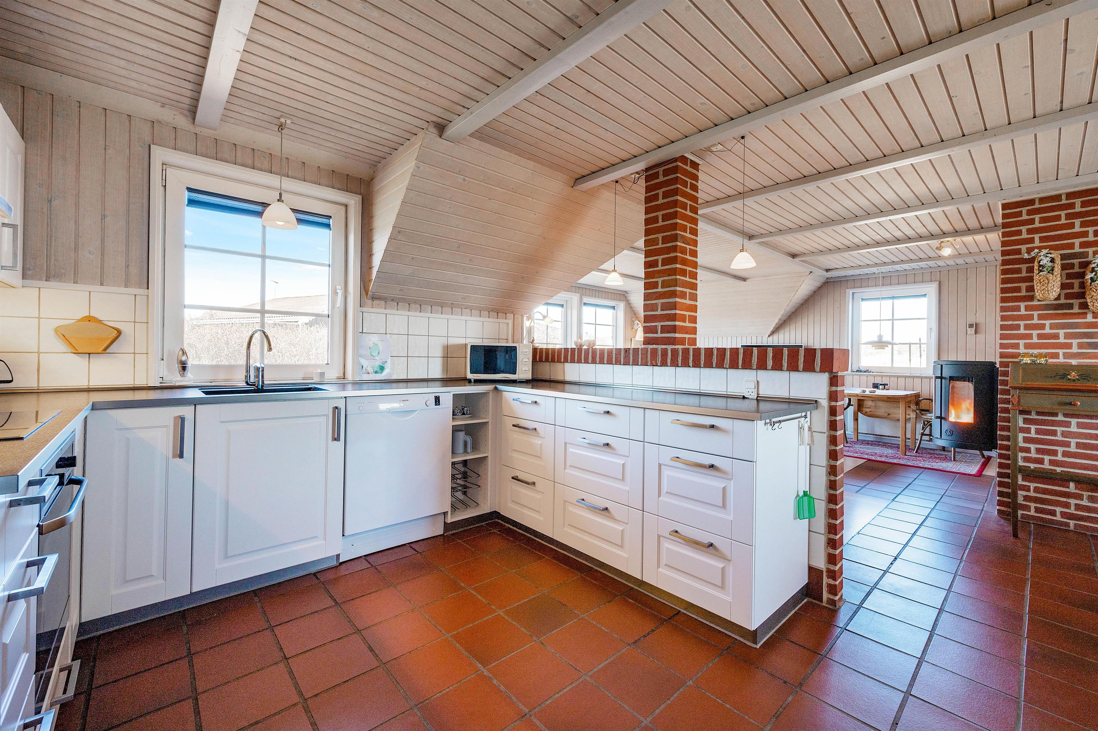 The classically furnished living room forms the heart of the holiday home. Here, the whole family can gather after an eventful day to enjoy each other's company. The wood-burning stove, located in the centre of the living room, contributes to the cosy atmosphere and provides comfortable warmth. Additionally, this holiday home is equipped with an energy-efficient heat pump for pleasant ambient temperatures. The bright kitchen is well-equipped and opens onto the dining and living area.