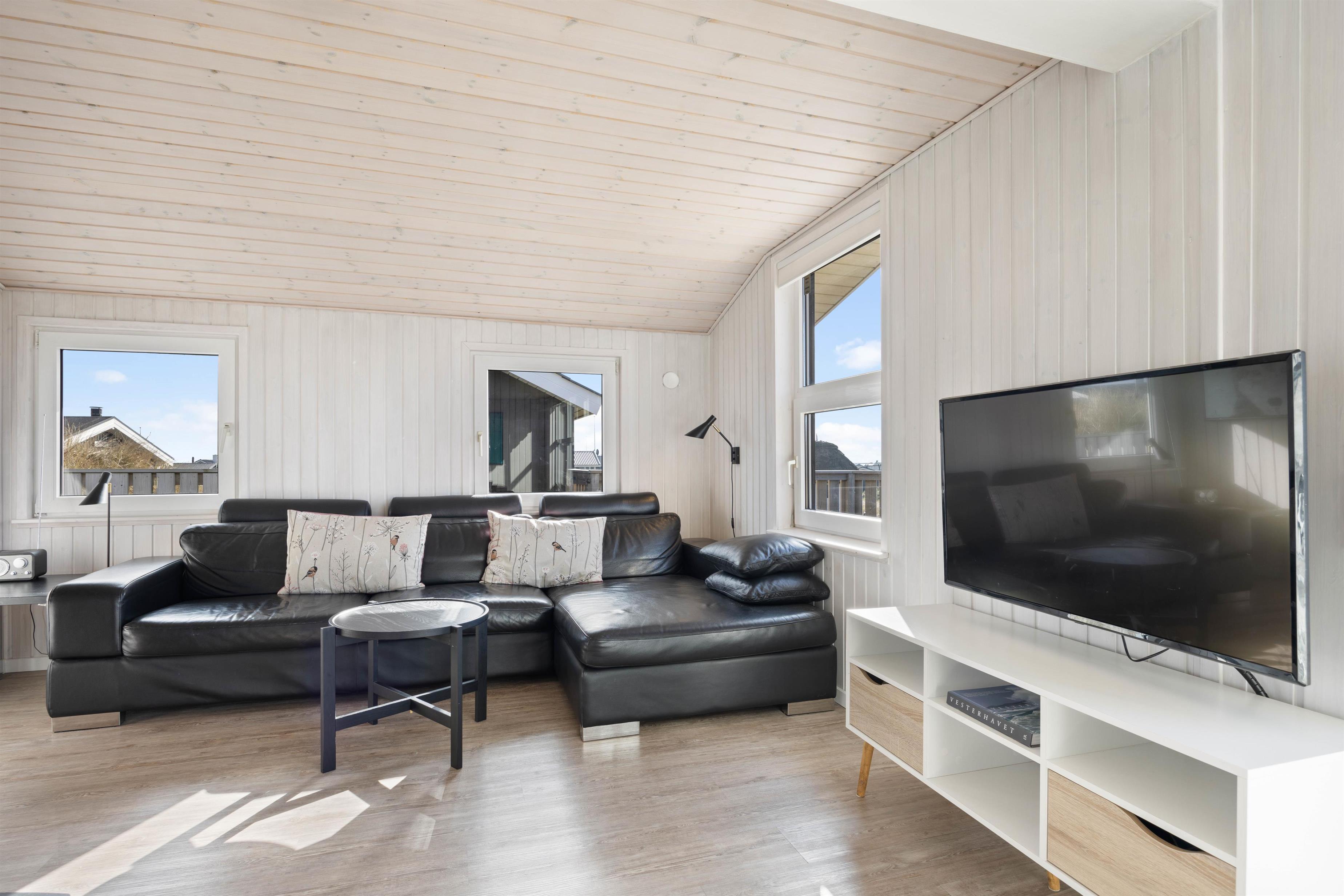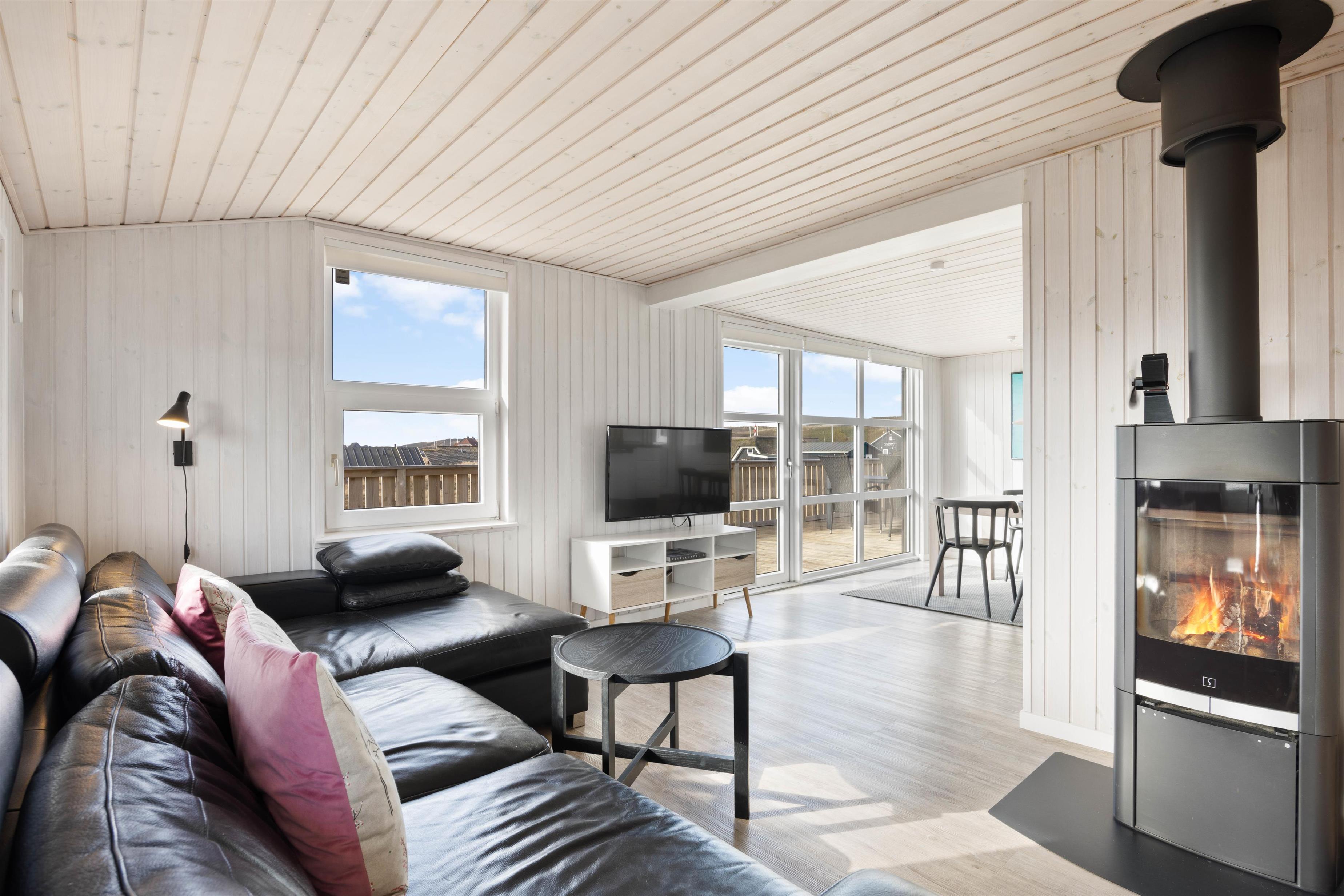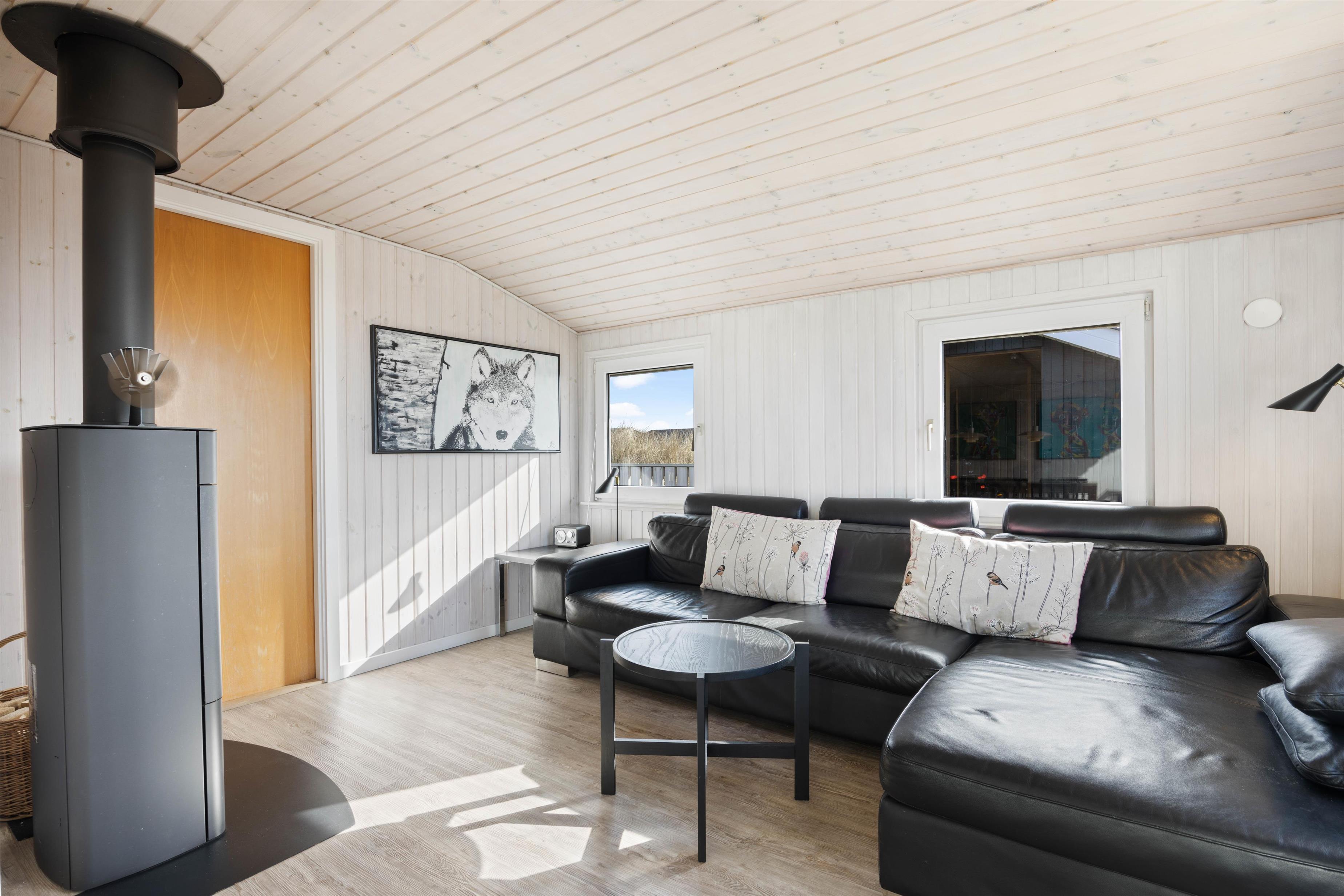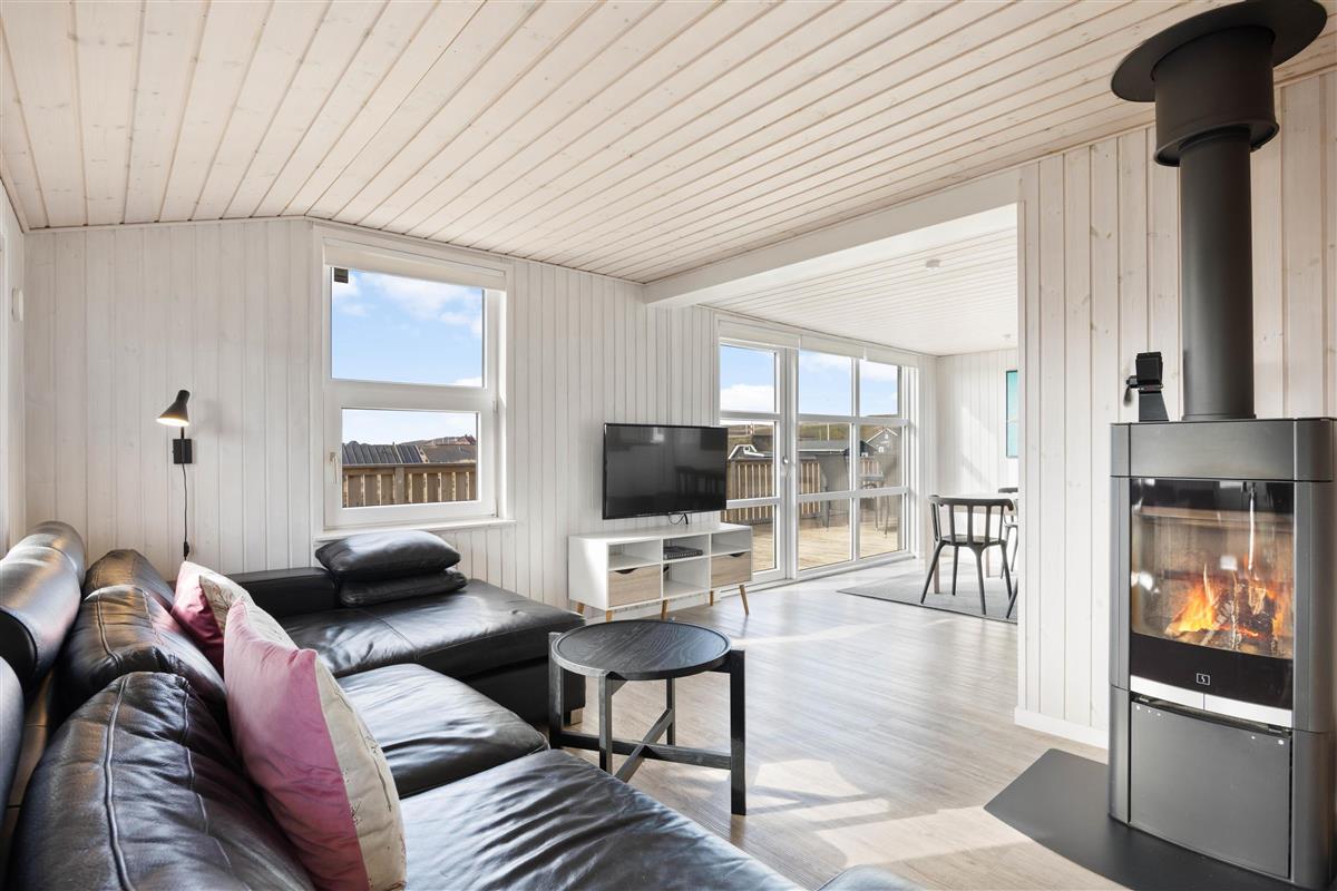This 90-square-metre holiday home at Sand Holms Vej 43 in Søndervig, accommodating 5 people, instantly welcomes you, your family and your dog, helping you slip straight into holiday mode. The bright, sun-filled holiday home impresses with its well-designed layout and cosy atmosphere, enhanced by the wood-burning stove and integrated heat pump.
