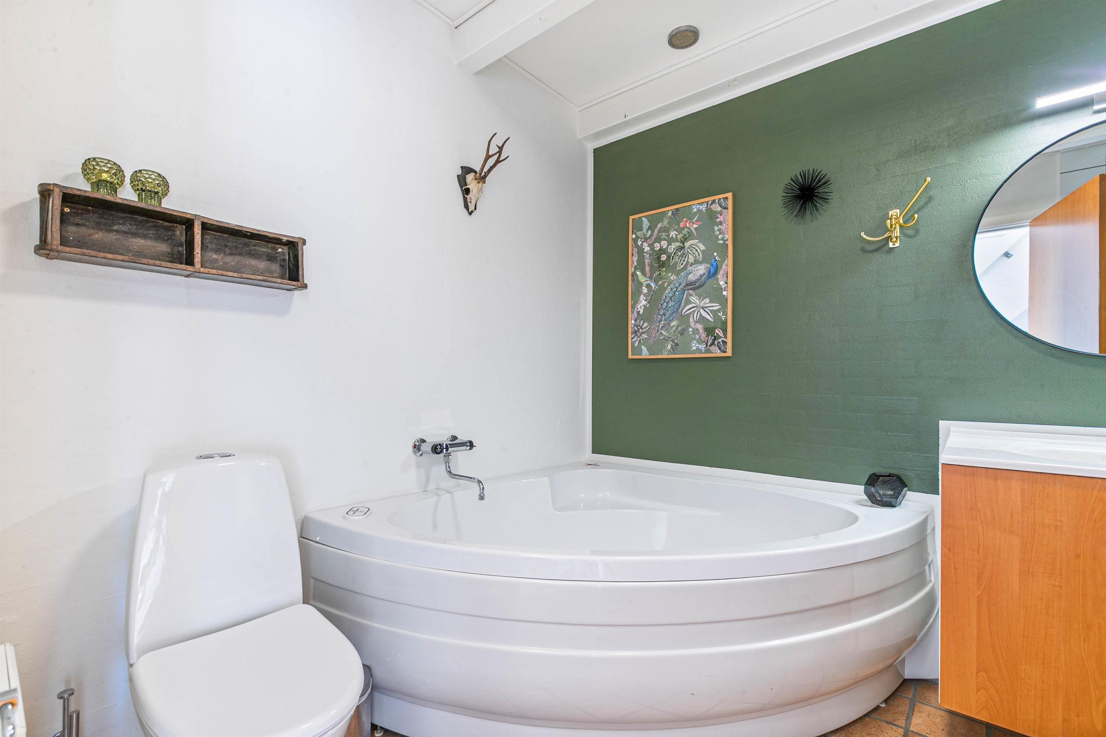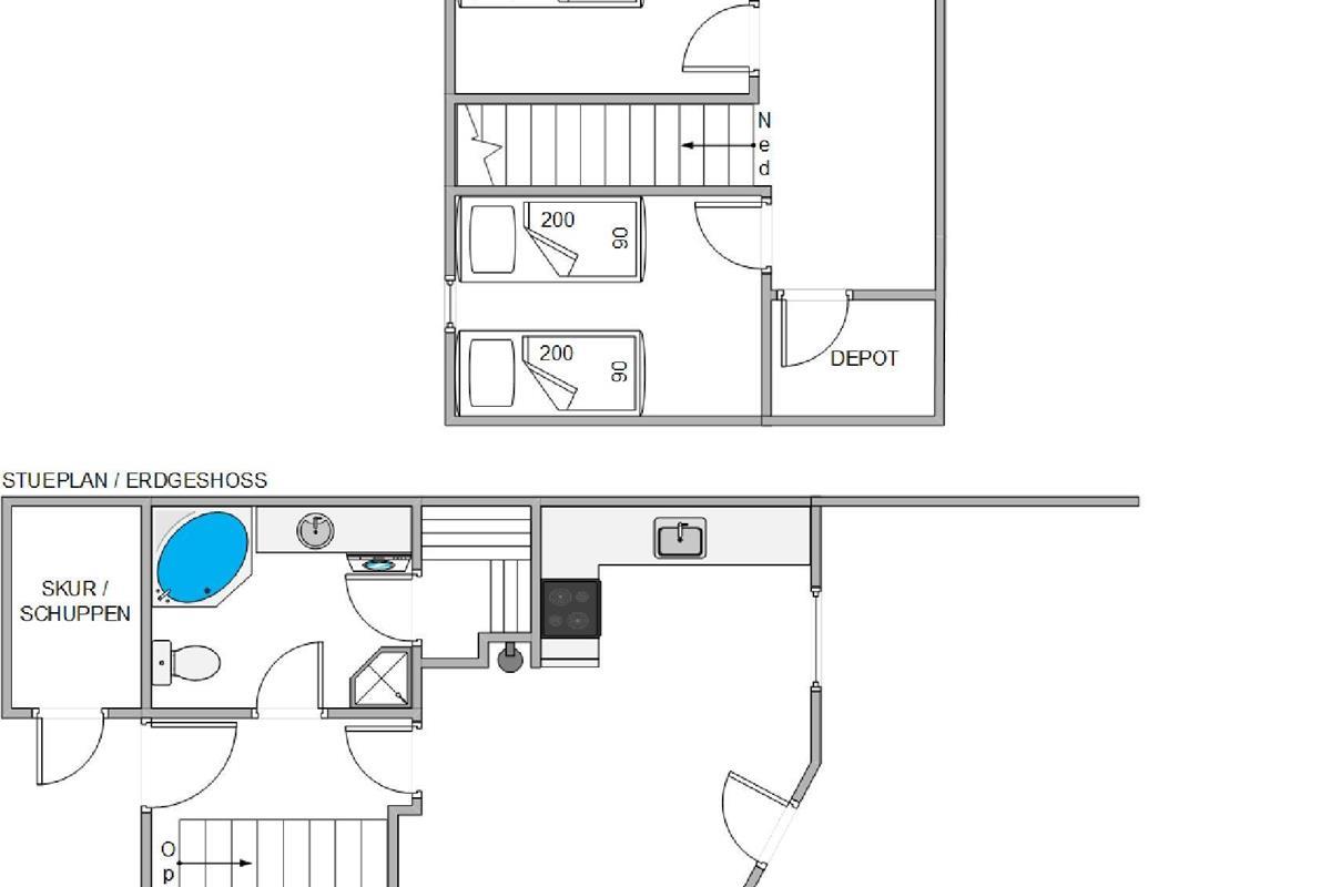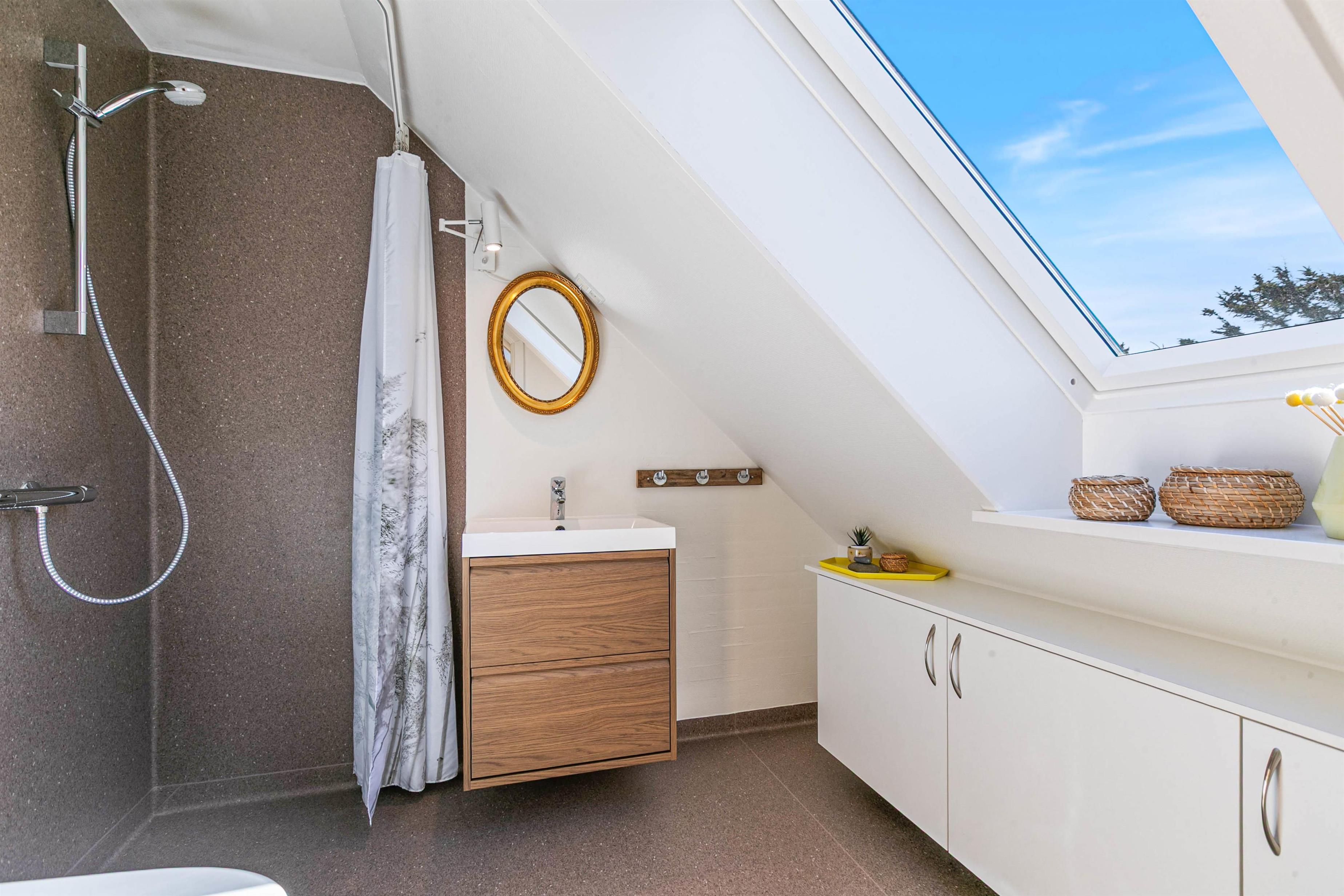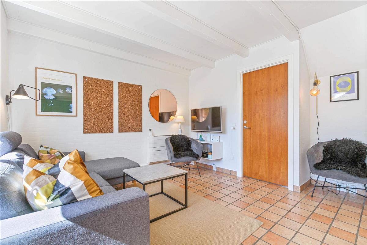 The ground floor features the entrance, a bathroom with sauna and whirlpool, underfloor heating and washing machine. There's also a bedroom with a double bed, and the dining and living room which opens onto the kitchen. From the centre of the house, you have access to a beautiful south-facing enclosed terrace with awning and two sun loungers. This is particularly ideal for families with young children or dogs. Despite the central location in Søndervig, the terrace offers a private, peaceful retreat.