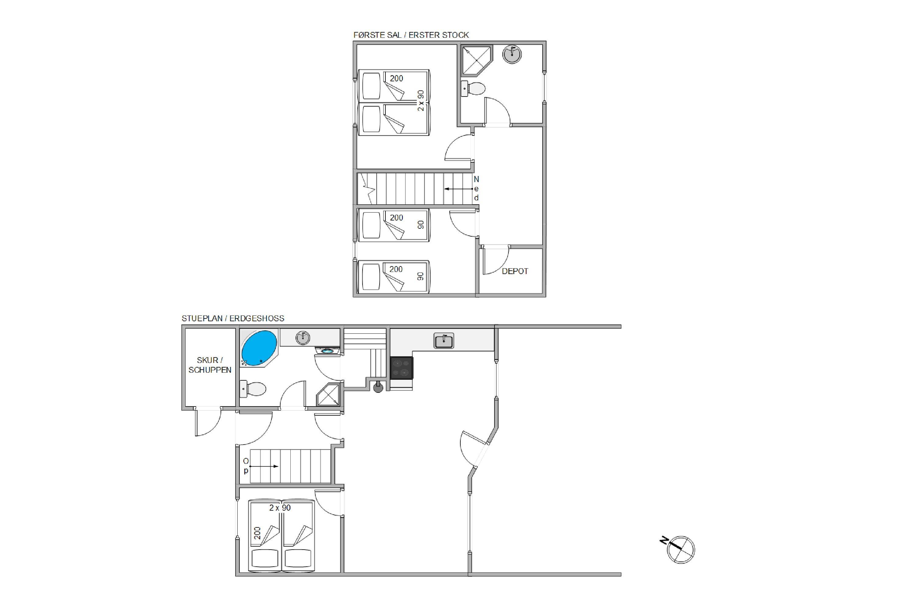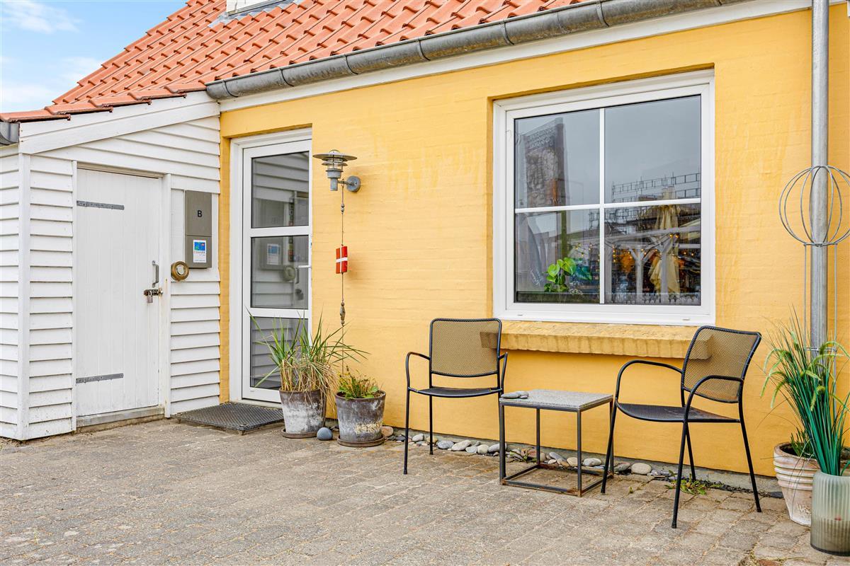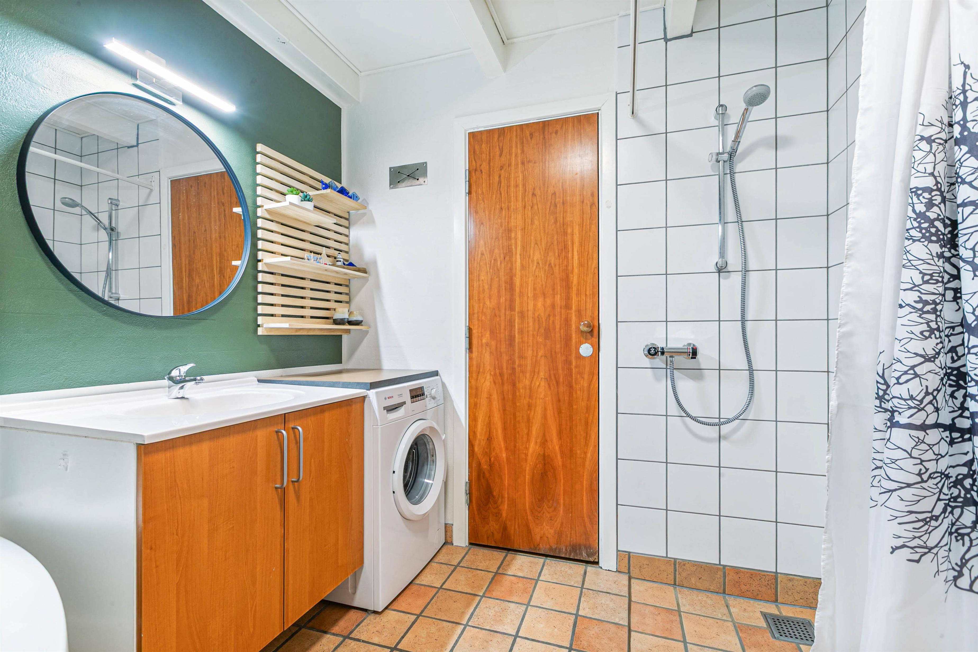 The ground floor features the entrance, a bathroom with sauna and whirlpool, underfloor heating and washing machine. There's also a bedroom with a double bed, and the dining and living room which opens onto the kitchen. From the centre of the house, you have access to a beautiful south-facing enclosed terrace with awning and two sun loungers. This is particularly ideal for families with young children or dogs. Despite the central location in Søndervig, the terrace offers a private, peaceful retreat.