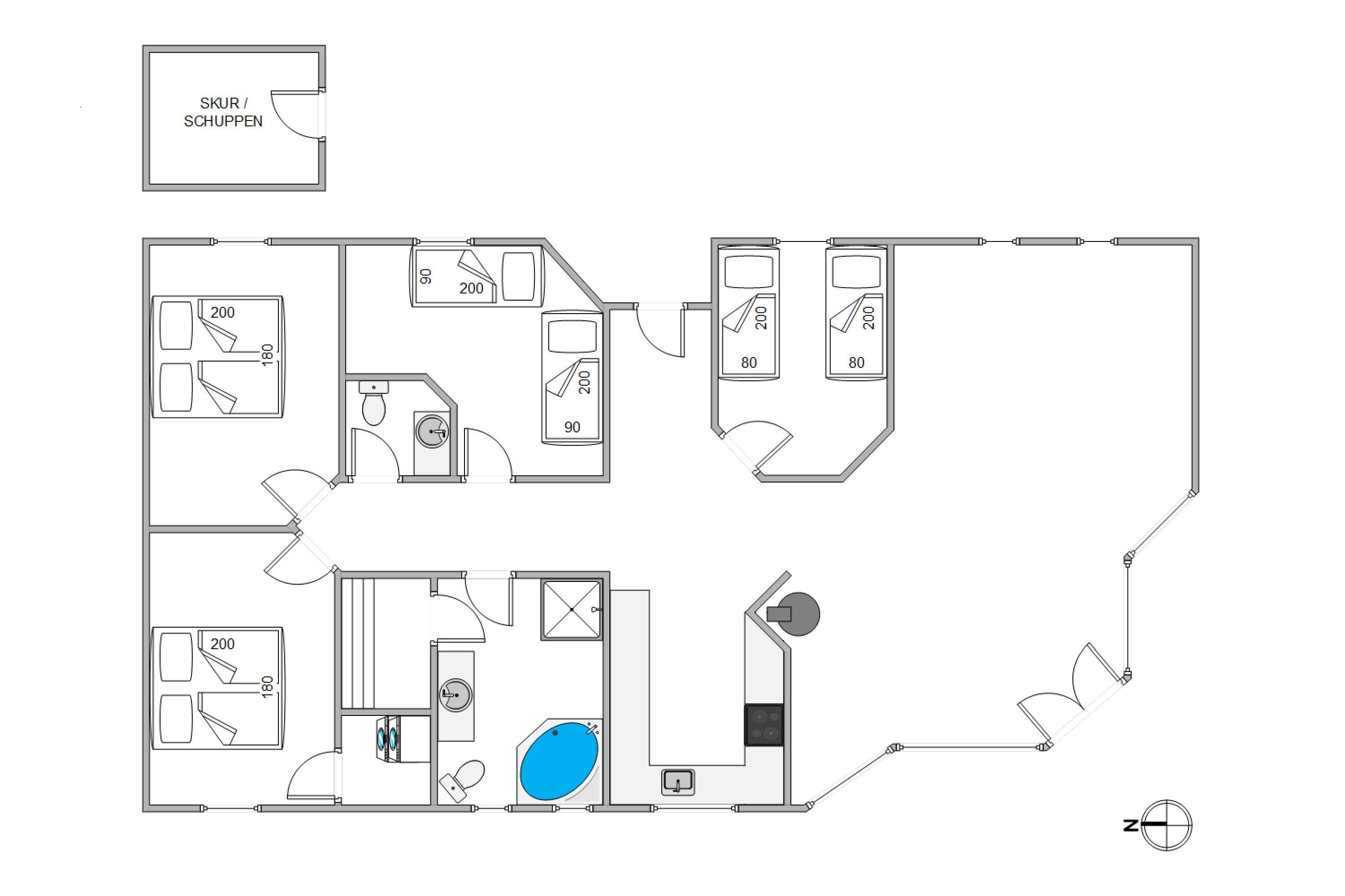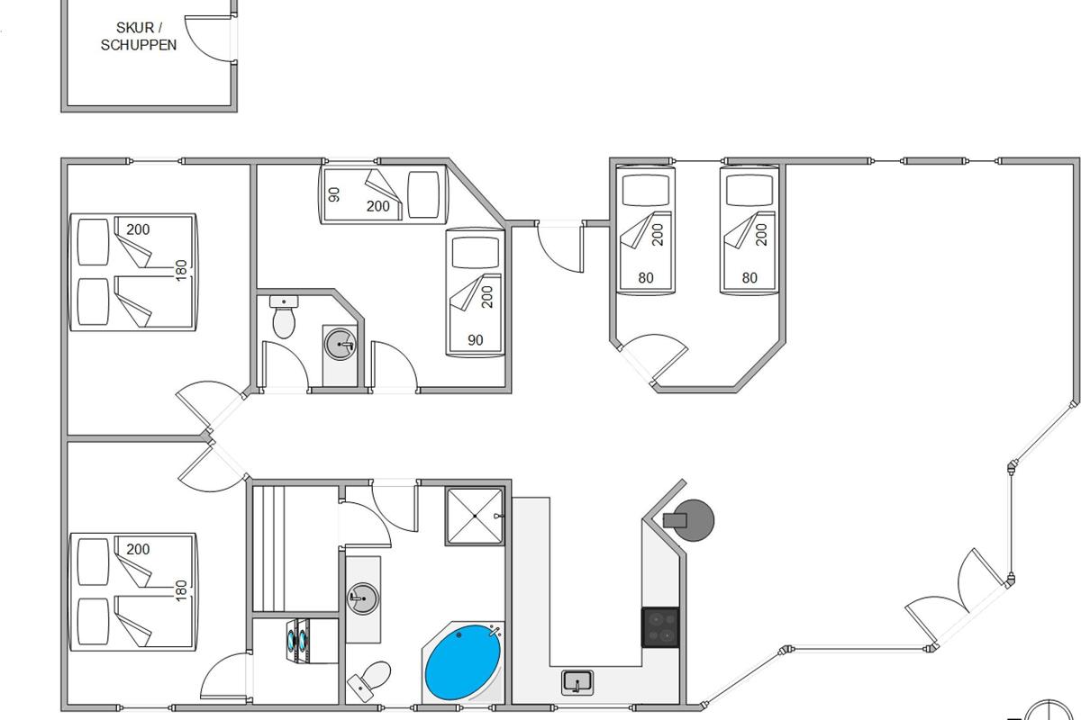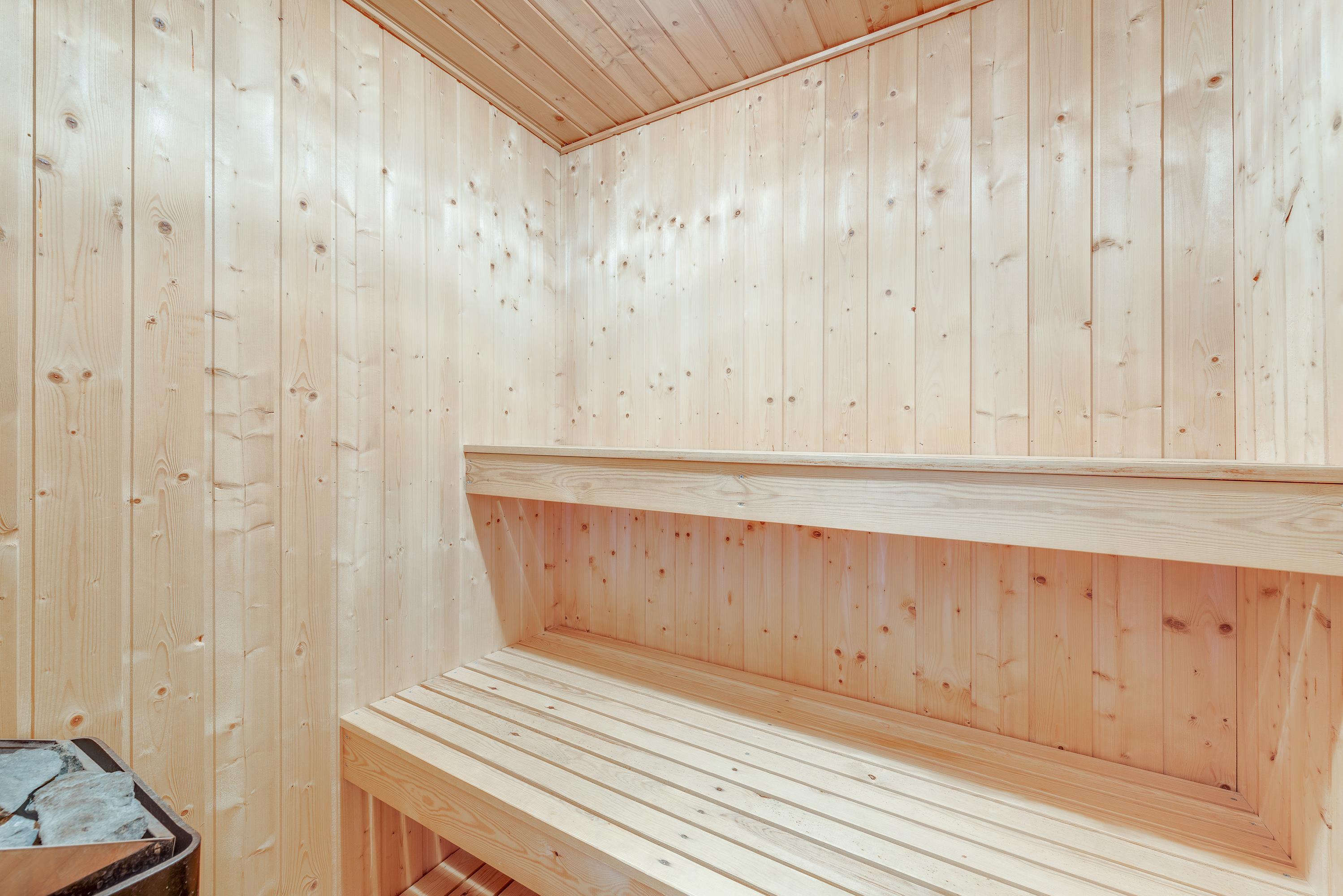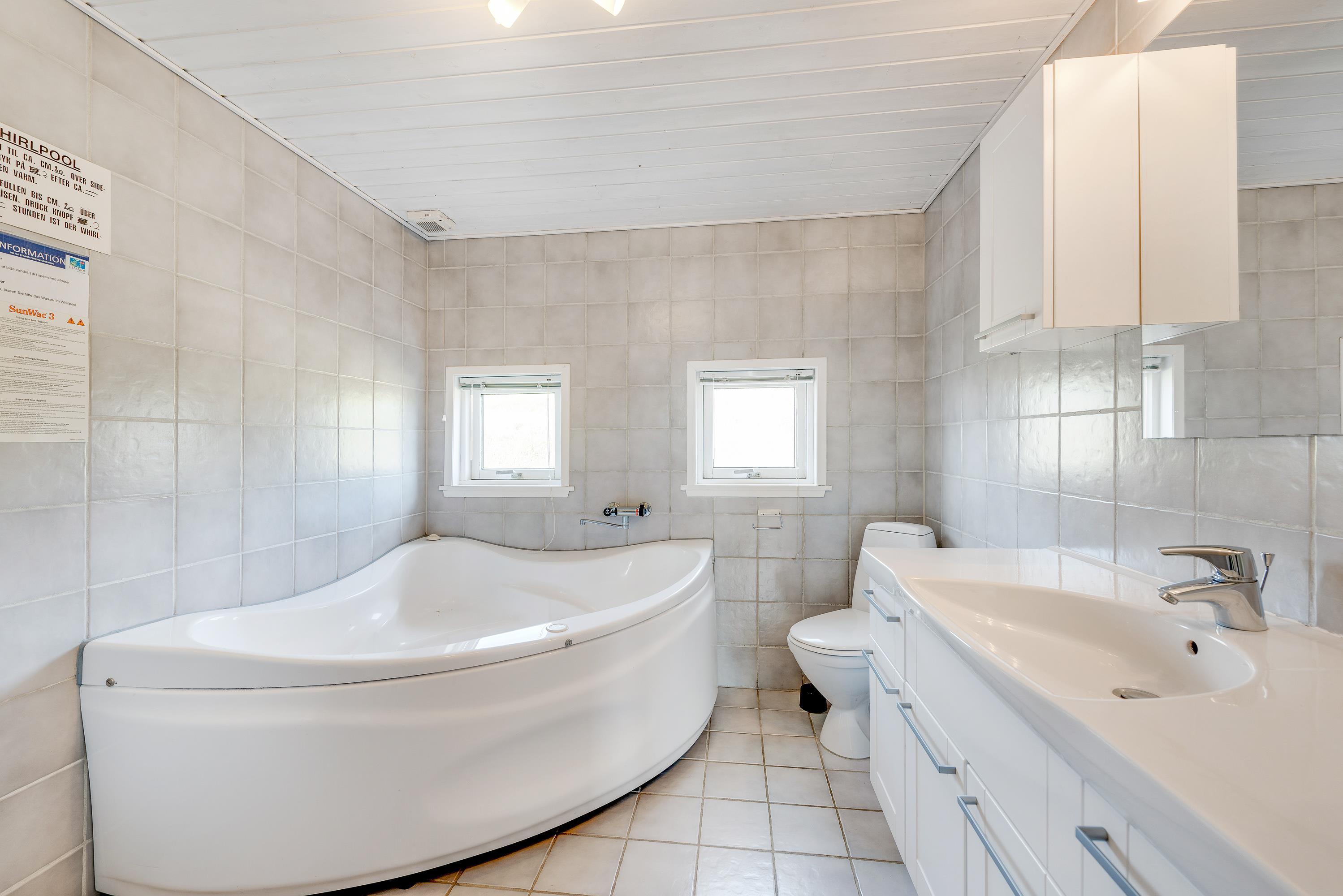 This cosily furnished holiday home is bright and well-equipped, with a layout ideal for both families and groups of friends. On cool evenings, a wood-burning stove in the living area creates a warm atmosphere. Underfloor heating ensures warm feet when you're not using the stove. The exclusive sauna and whirlpool offer perfect relaxation after a day of adventures. The four bedrooms, furnished with two double beds and four single beds, provide comfortable sleeping arrangements for dreaming about tomorrow's holiday adventures. The spacious bathroom features a shower, whirlpool and access to the sauna. There's also a separate guest toilet.