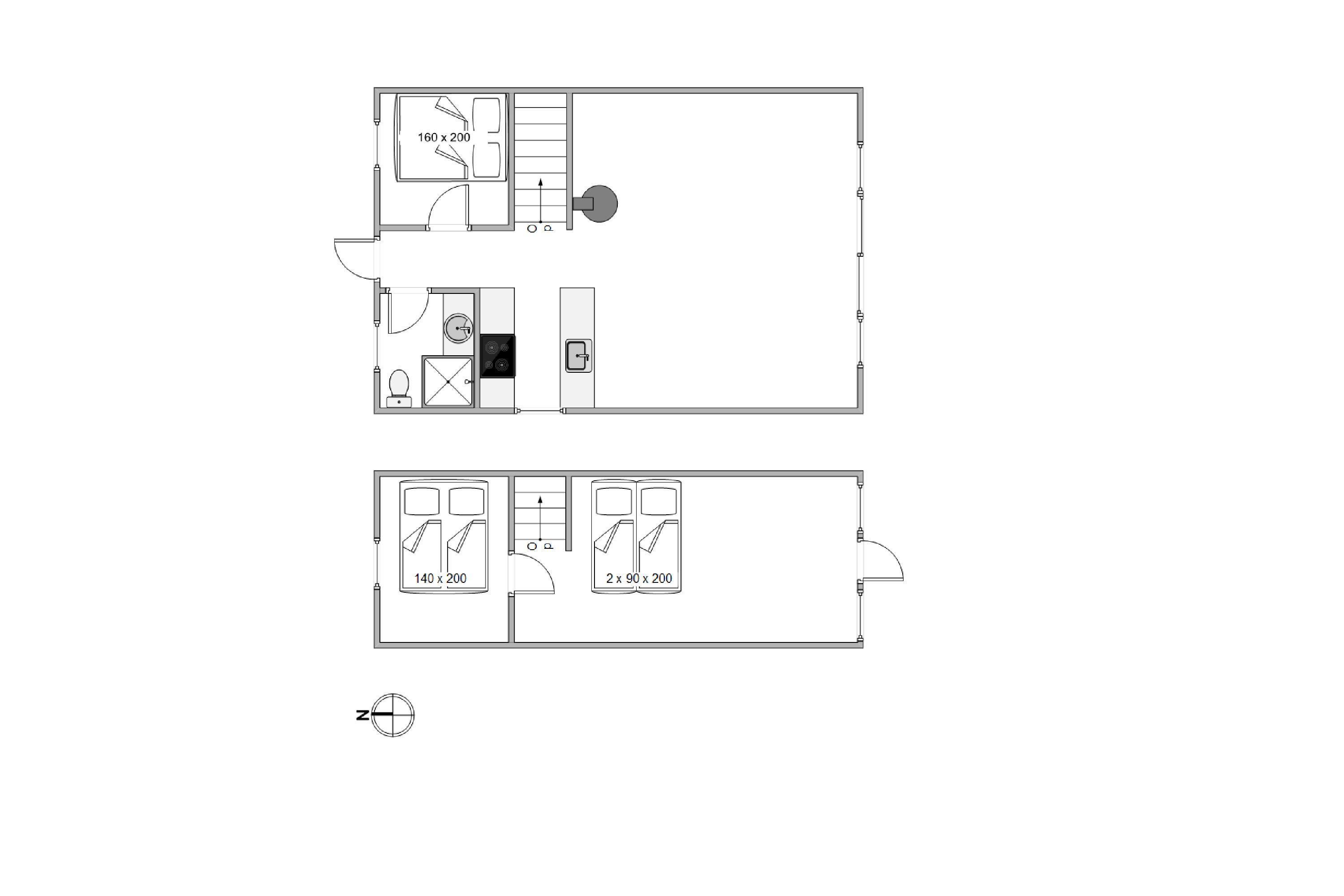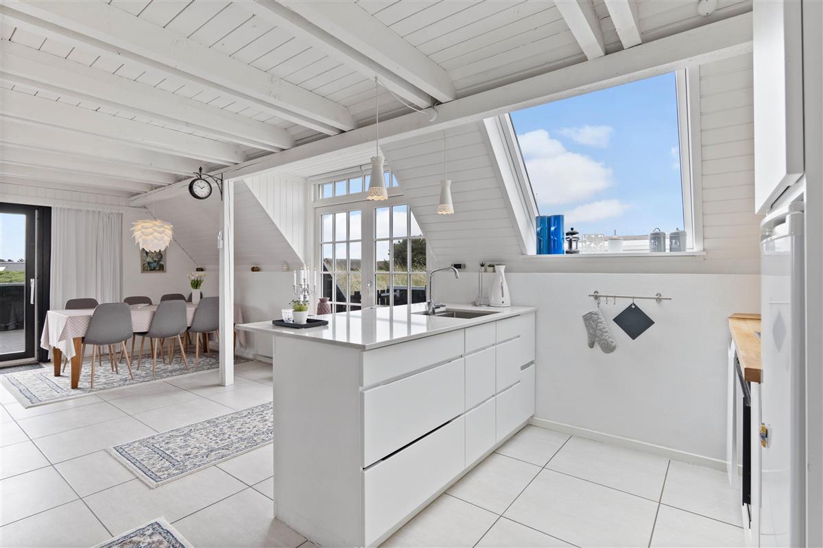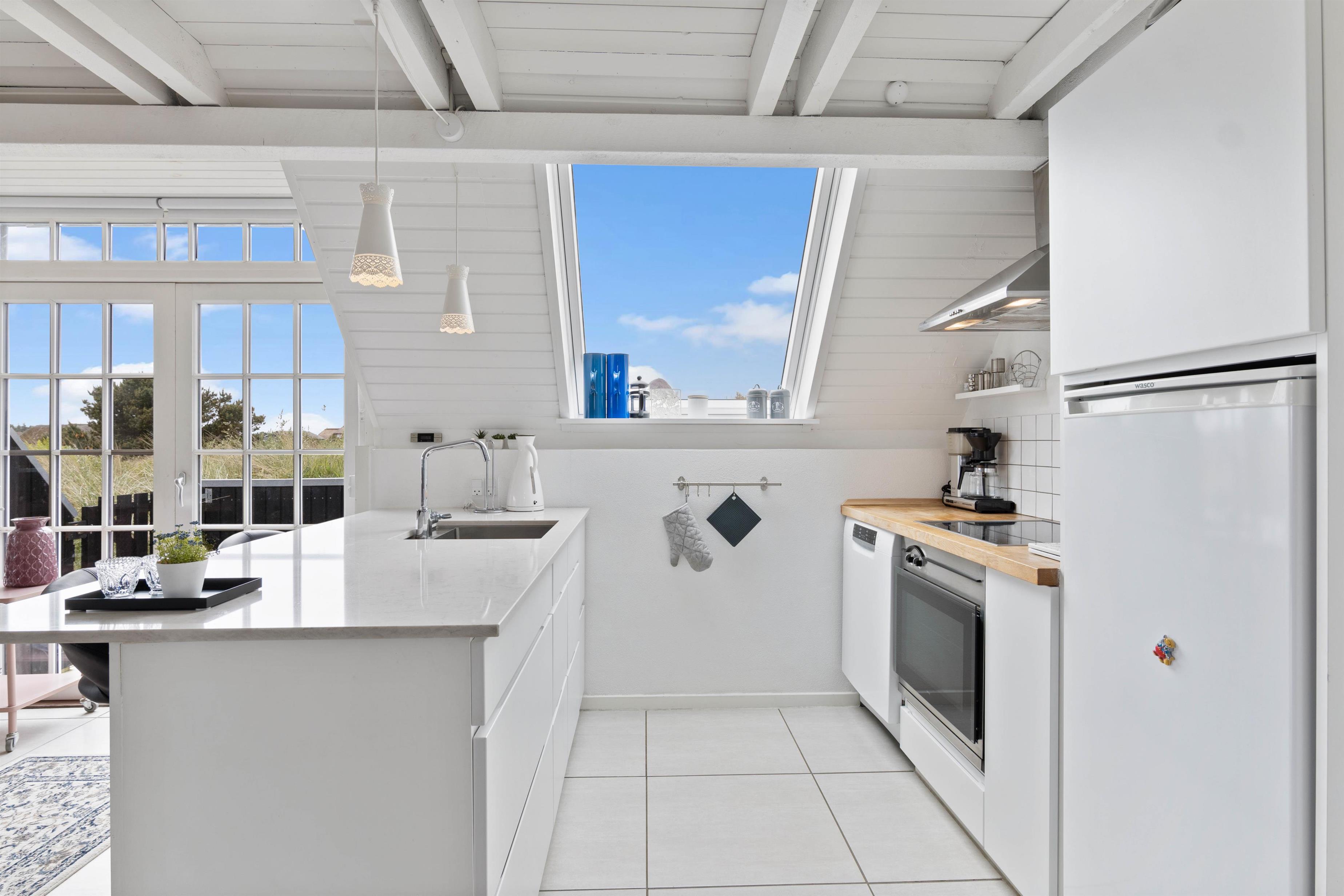 The living room, combined with the kitchen, is furnished with comfortable furniture creating a pleasant holiday atmosphere. In the evening, the crackling wood-burning stove provides a cosy warmth as darkness settles over the dune landscape outside.