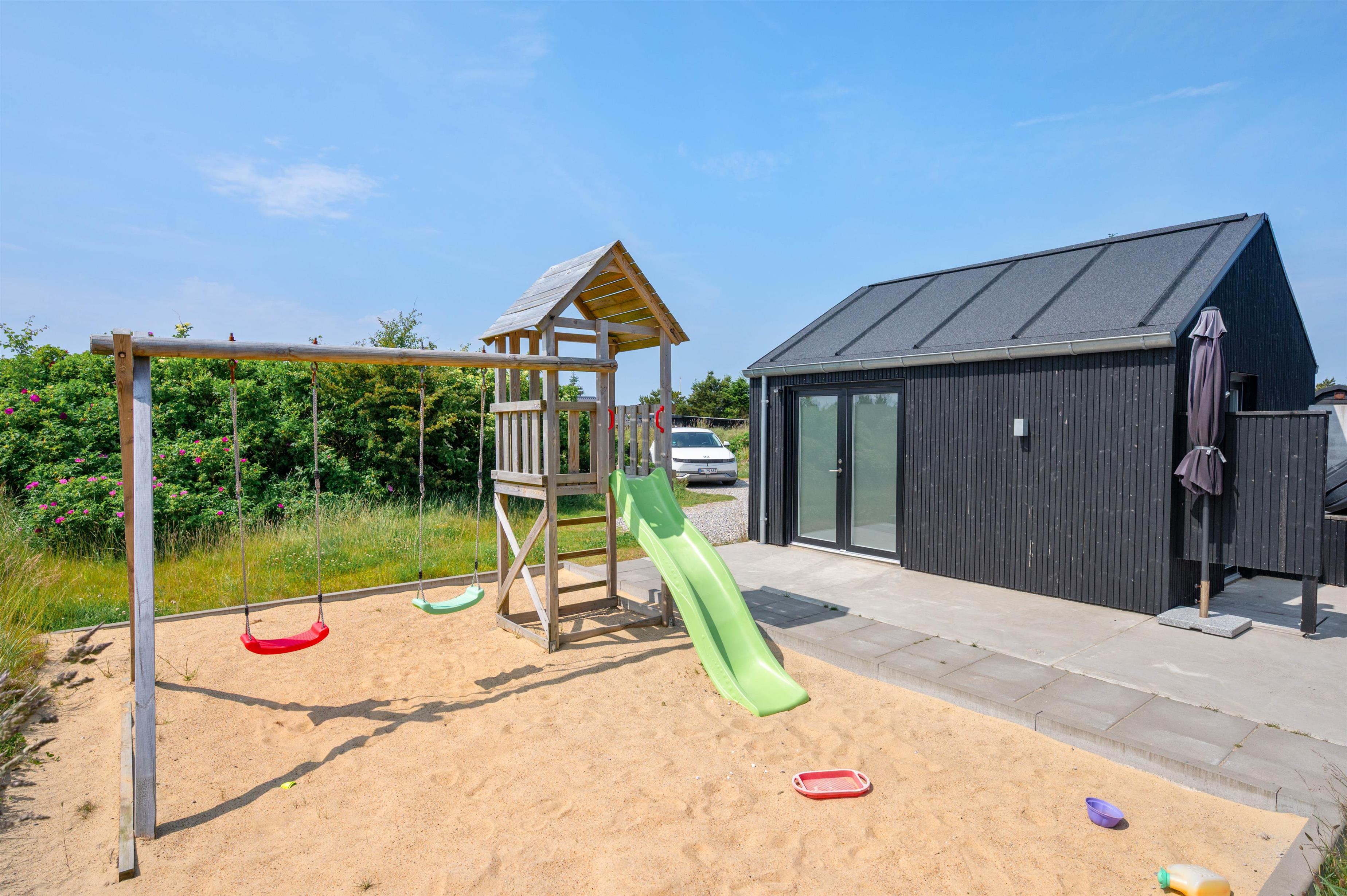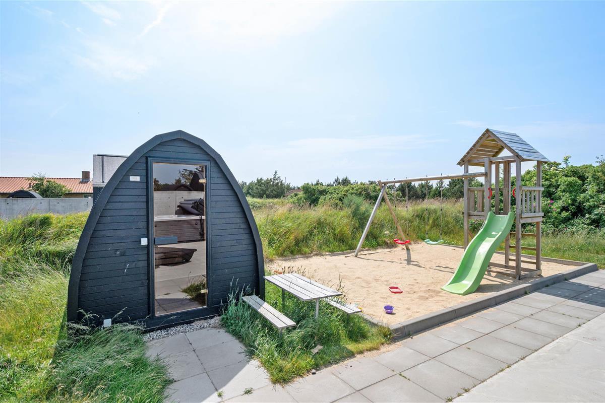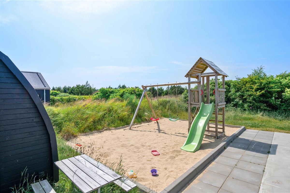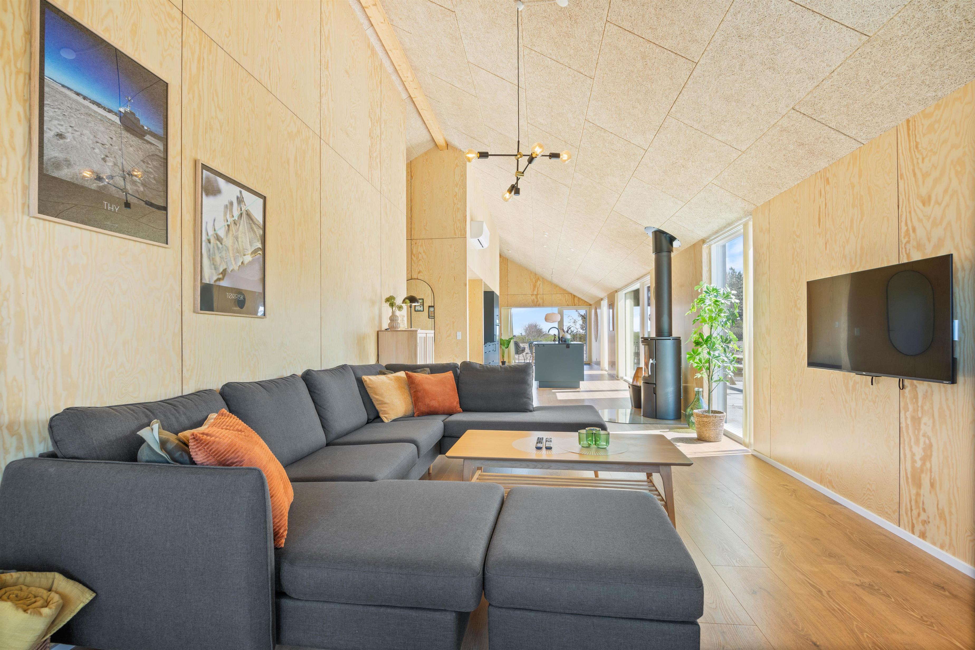 You'll feel at home straight away in this modern holiday home in Søndervig. Built in 2023, the holiday home features stylish, comfortable furnishings complemented perfectly by wonderful natural light. The spacious living room is your gathering point for cosy moments of cooking, gaming and watching films together. The living room fireplace creates both a wonderful holiday atmosphere and cosy warmth. Additionally, there's an energy-efficient heat pump ensuring comfortable temperatures throughout.