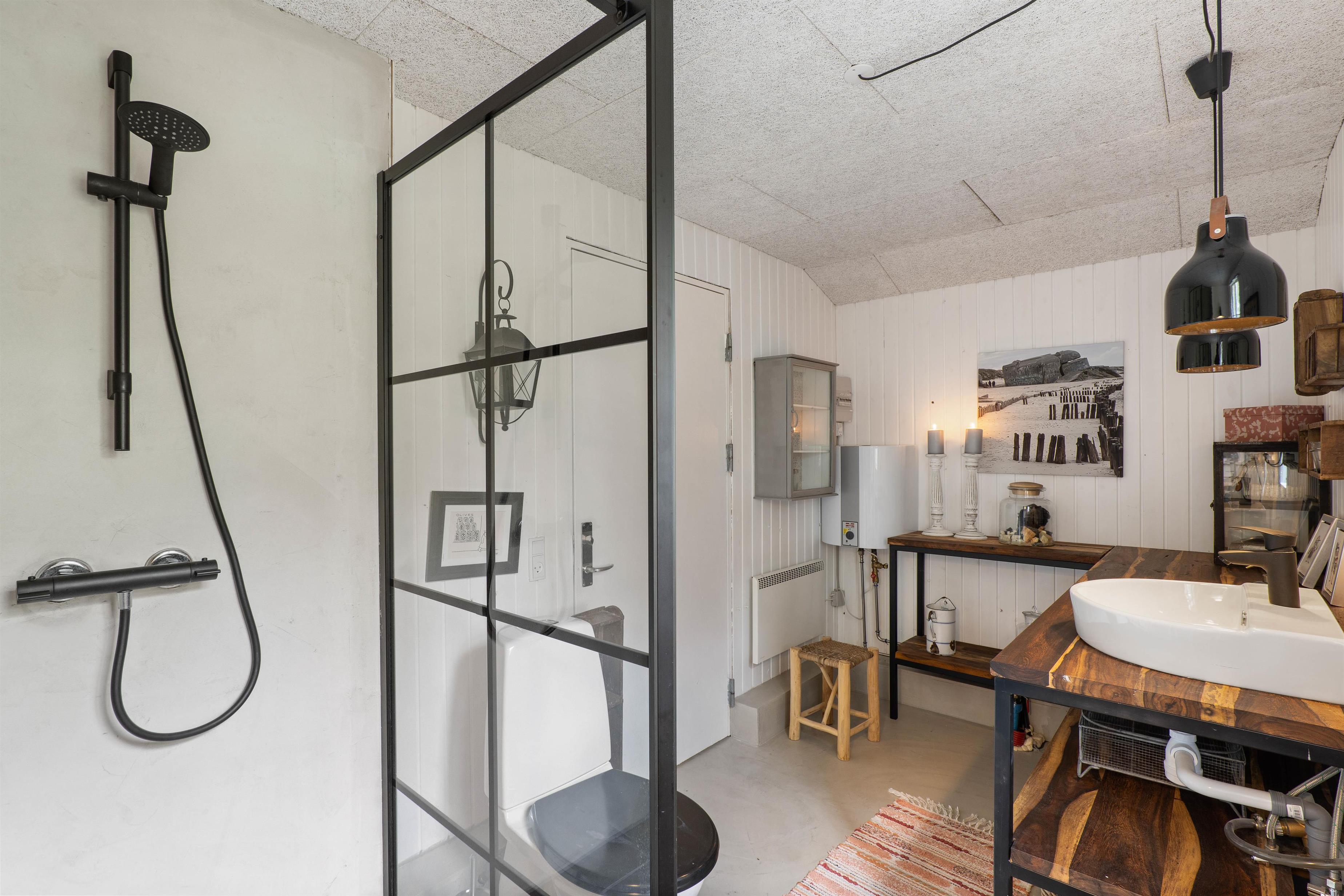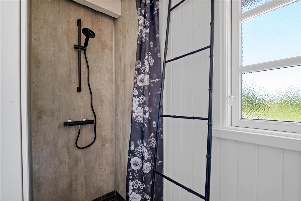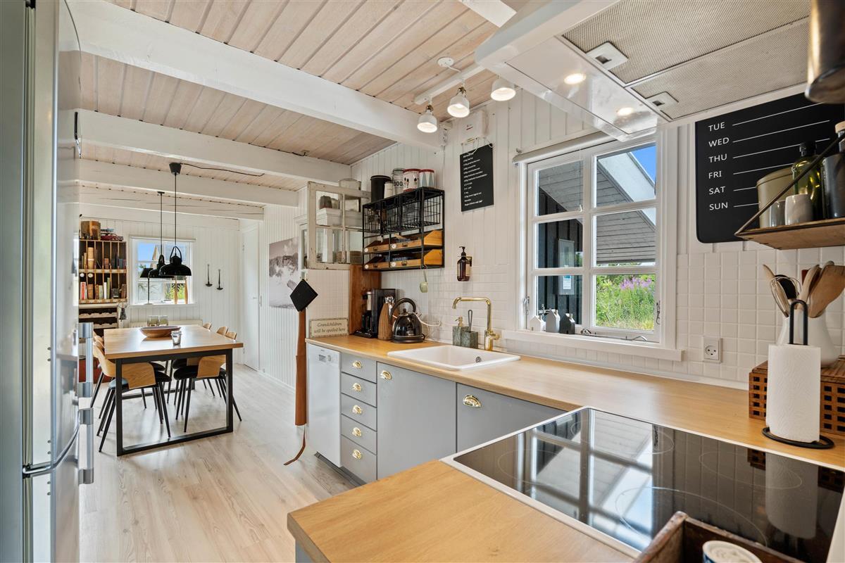 Last renovated in 2022, this summer house is bright and equipped with many beautiful details and tasteful furnishings. The combined kitchen-living area features large south-facing windows providing wonderful natural light. Both the dining table and sofa offer views of the crackling fireplace and the beautiful natural surroundings.