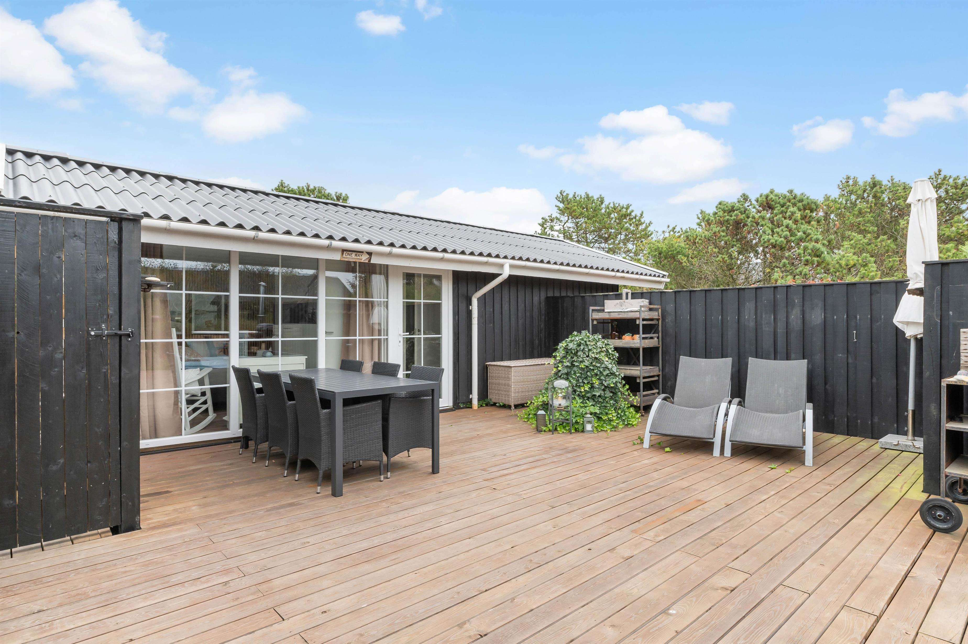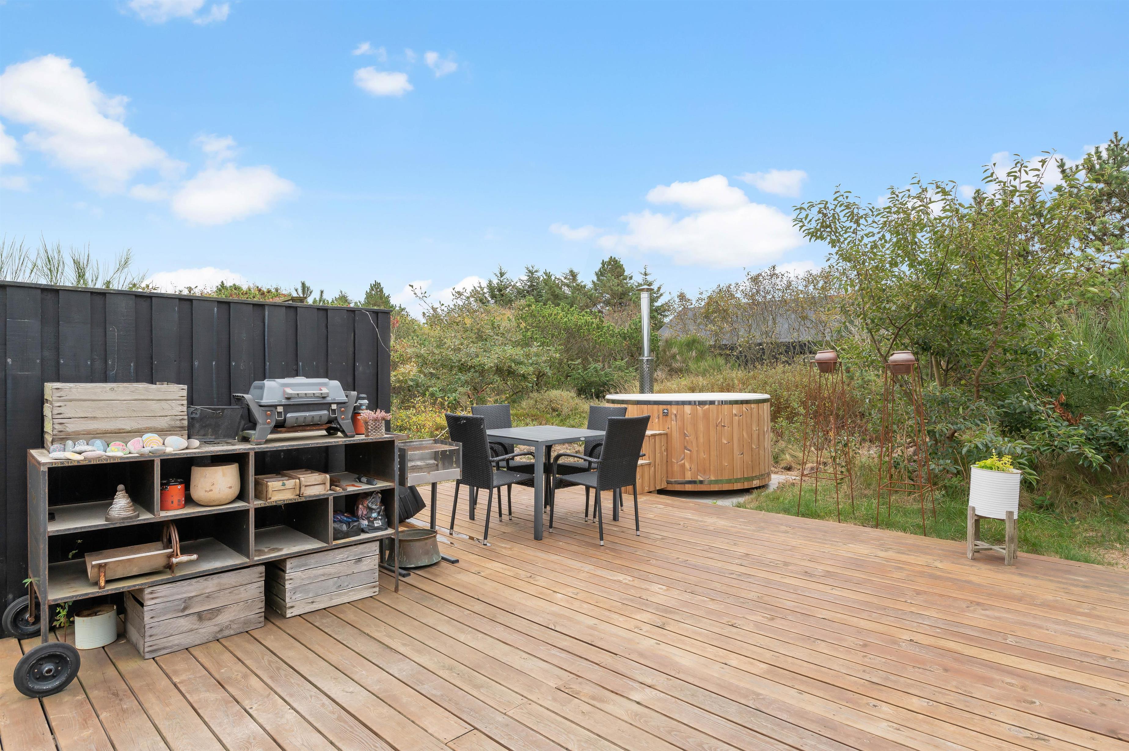 The southeast-facing terrace is completely private, screened by tall pine and conifer trees. It's perfect for lovely evenings around the barbecue. The terrace is well-furnished with garden furniture, sun loungers and a hot tub. The northwest side offers an ideal spot to enjoy an evening glass of wine.
