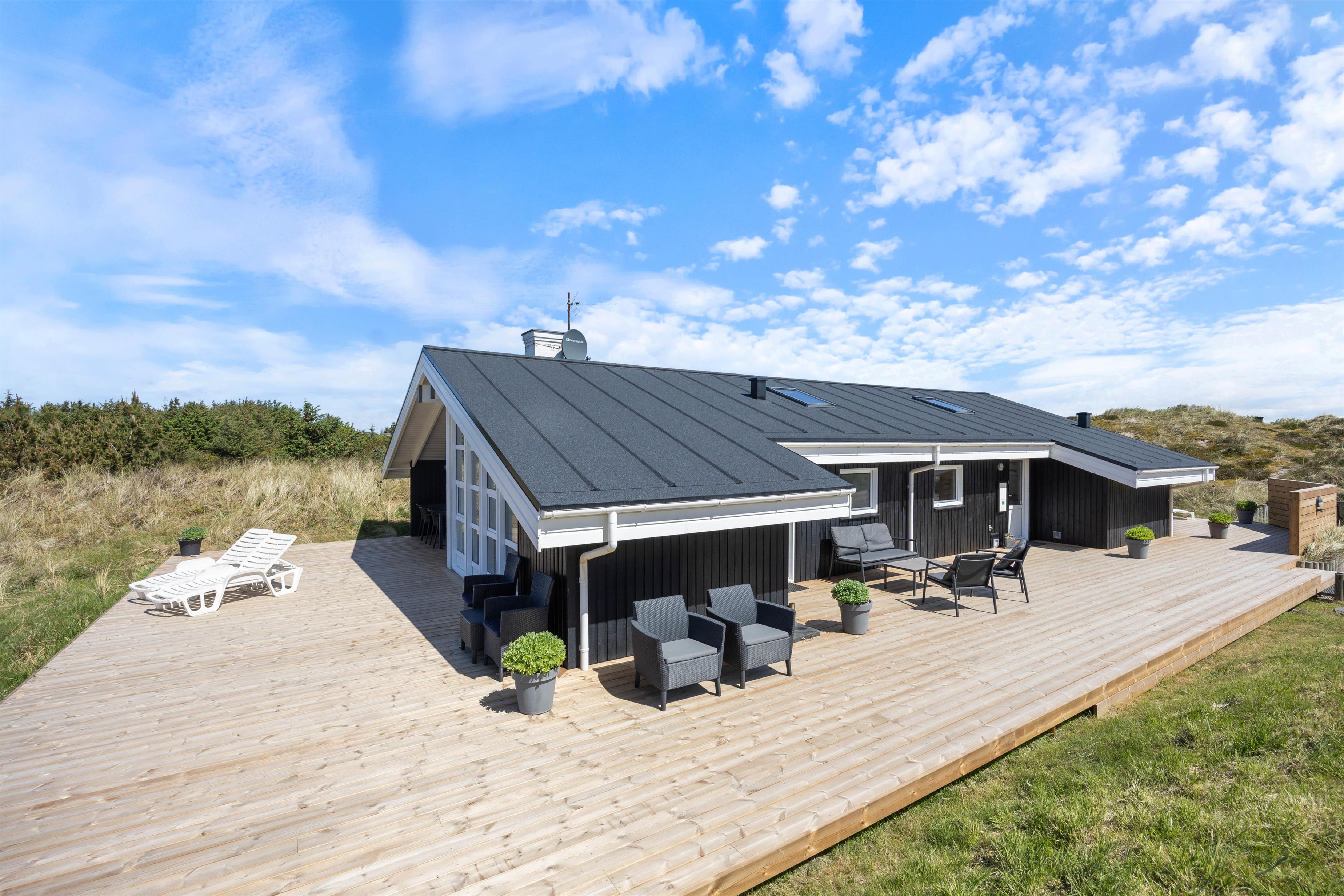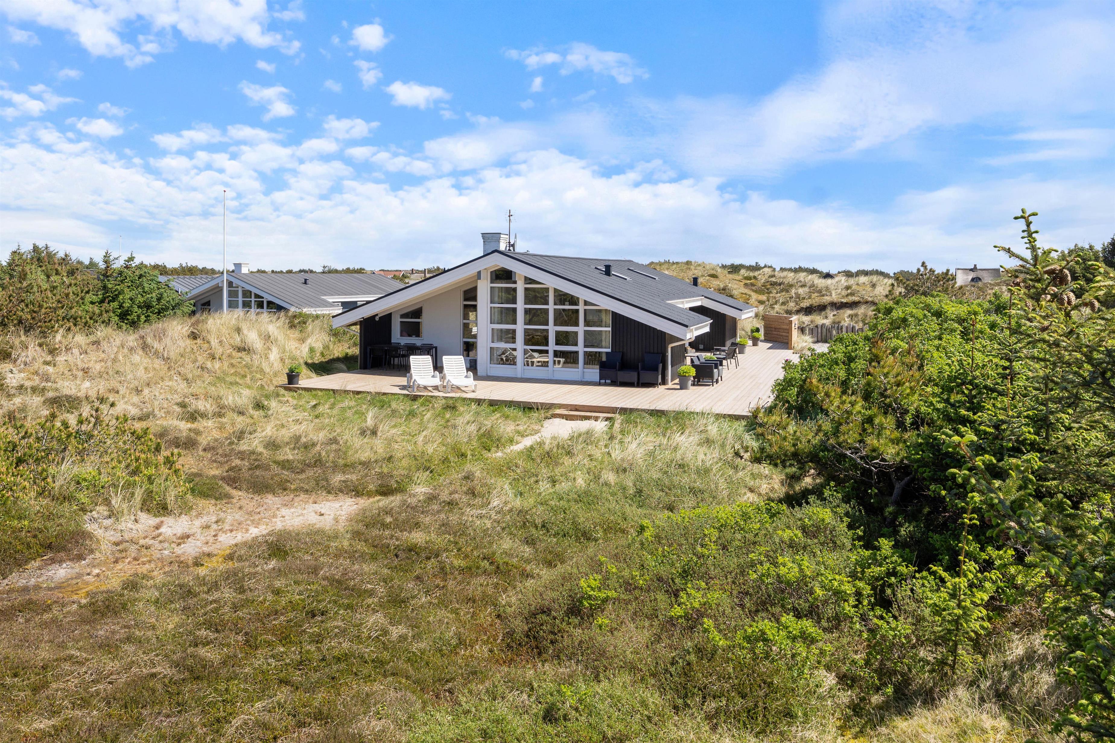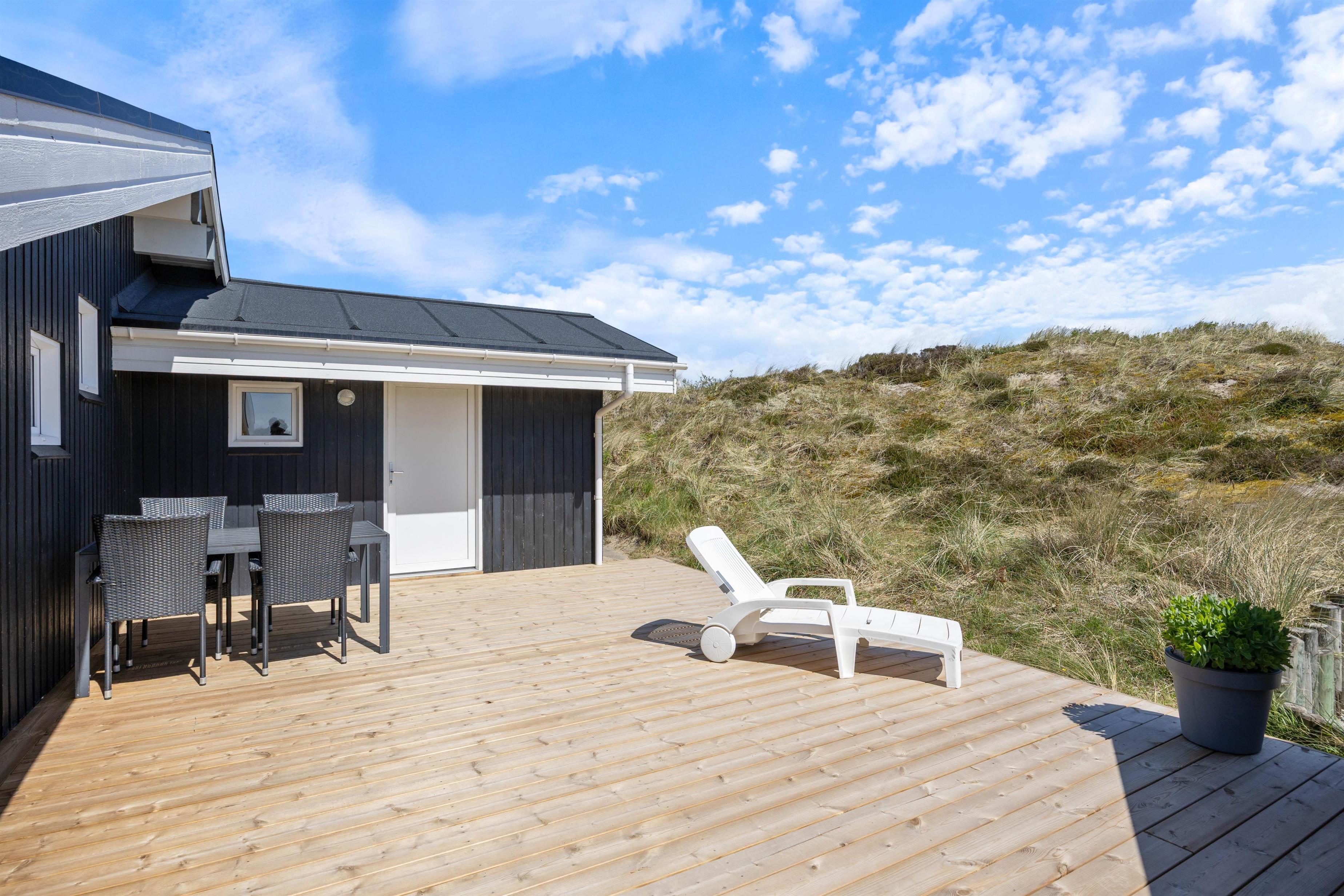 The holiday home sits on a 2,000-square-metre natural plot and features a beautiful wooden terrace wrapping around the holiday home. While you recharge in the sun loungers, children can enjoy the sandbox and swing. There's also a barbecue for enjoyable outdoor dining. You're surrounded by beautiful dune landscape and just 300 metres from the wild North Sea with its stunning, wide sandy beach.