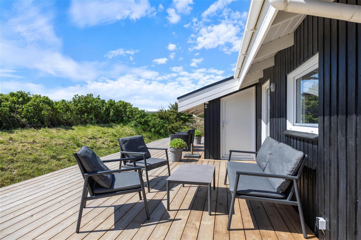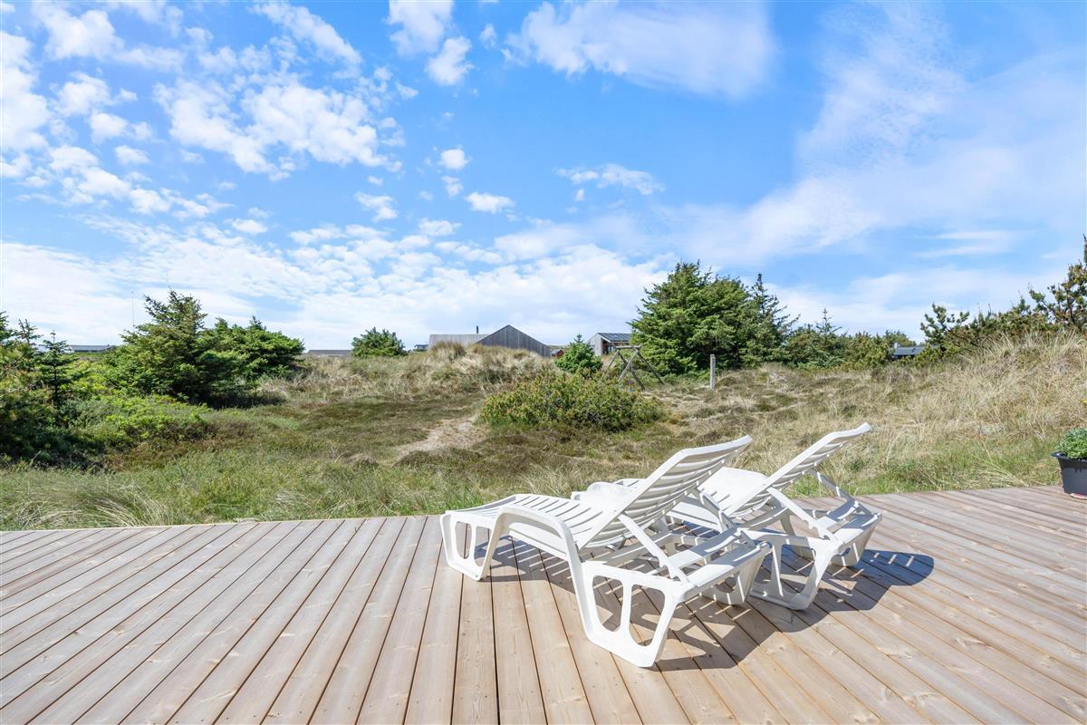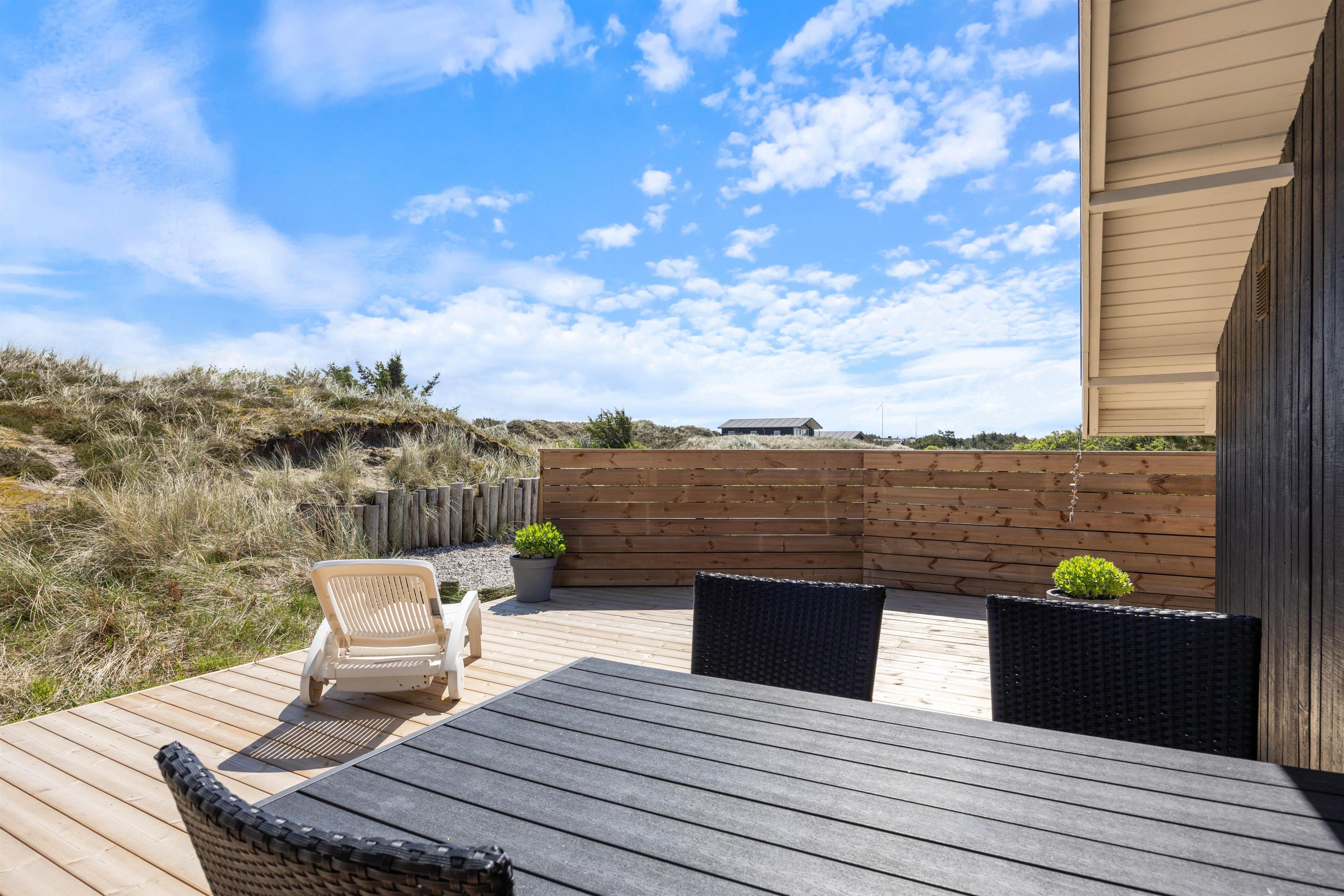 The holiday home sits on a 2,000-square-metre natural plot and features a beautiful wooden terrace wrapping around the holiday home. While you recharge in the sun loungers, children can enjoy the sandbox and swing. There's also a barbecue for enjoyable outdoor dining. You're surrounded by beautiful dune landscape and just 300 metres from the wild North Sea with its stunning, wide sandy beach.