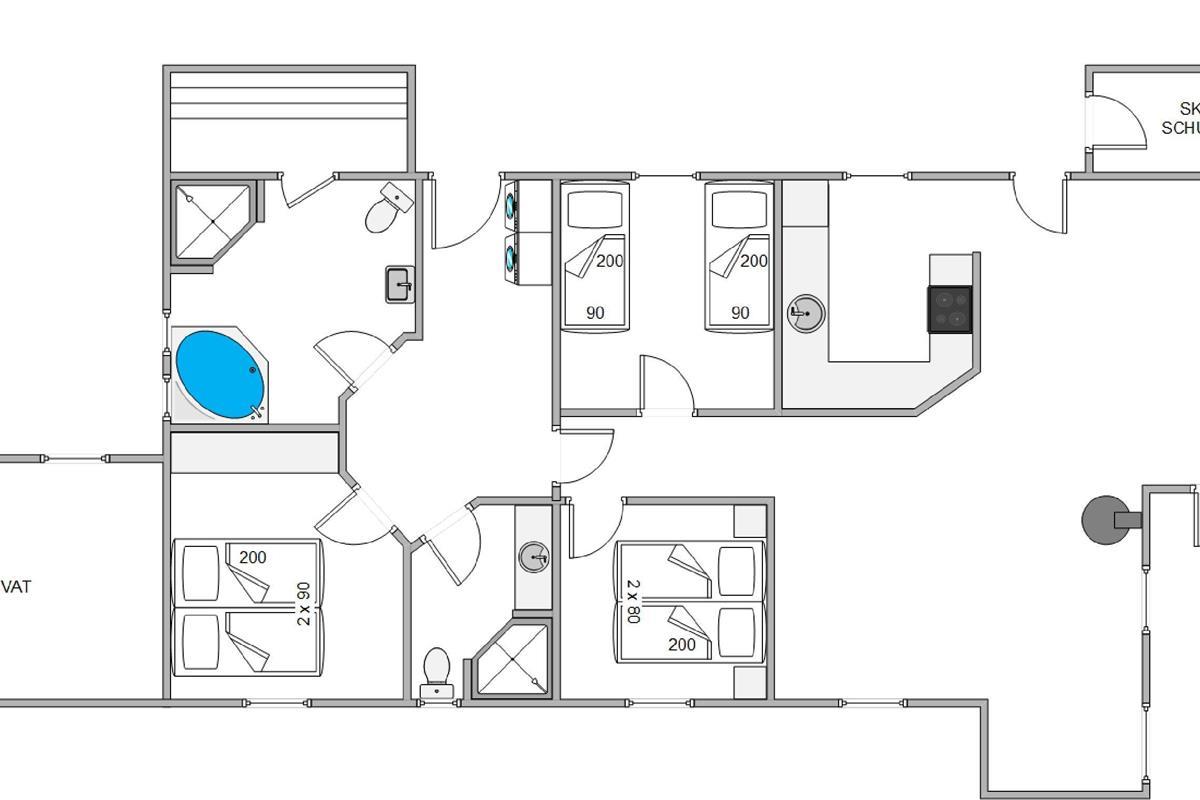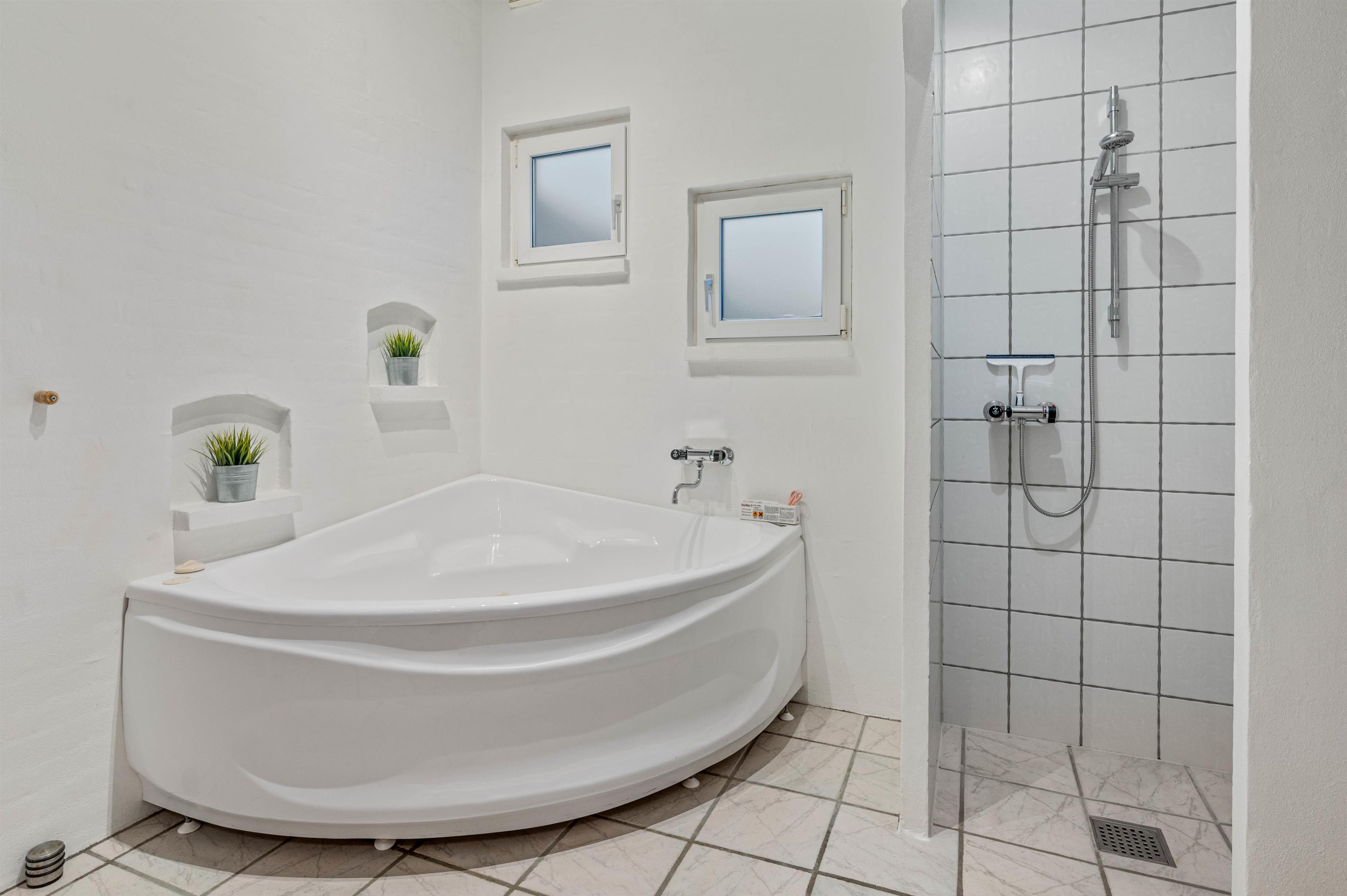 The spacious, bright living area welcomes you with plenty of space and attractive furnishings. End your holiday evenings relaxing on the sofas in front of the television or retreat to the cosy alcove with a view. The provided Chromecast allows you to use your streaming services whilst on holiday. On cooler days, it's particularly pleasant to light the wood-burning stove and listen to the crackling fire as warmth spreads through the room. The dining table is perfect for shared meals and fun games nights. The kitchen is open-plan, connected to the living area and well-equipped, with a dishwasher making cleanup easier. There are 3 bedrooms, 2 with double beds and one with twin beds, all inviting a peaceful night's sleep. Both bathrooms feature showers, toilets and underfloor heating, making daily life with up to 6 people much more convenient and avoiding long waiting times. The holiday home's highlights include the hot tub and sauna, perfect places to unwind and leave everyday stress behind. If you prefer to travel light, you'll appreciate the washing machine and tumble dryer. The modern, energy-efficient air-to-air heat pump ensures comfortable temperatures year-round.