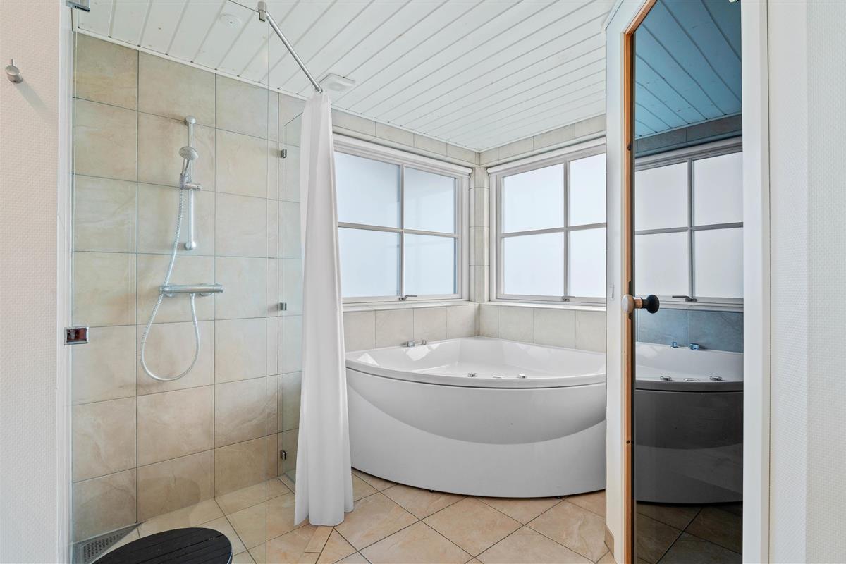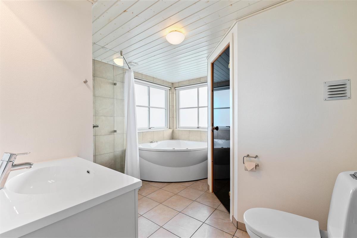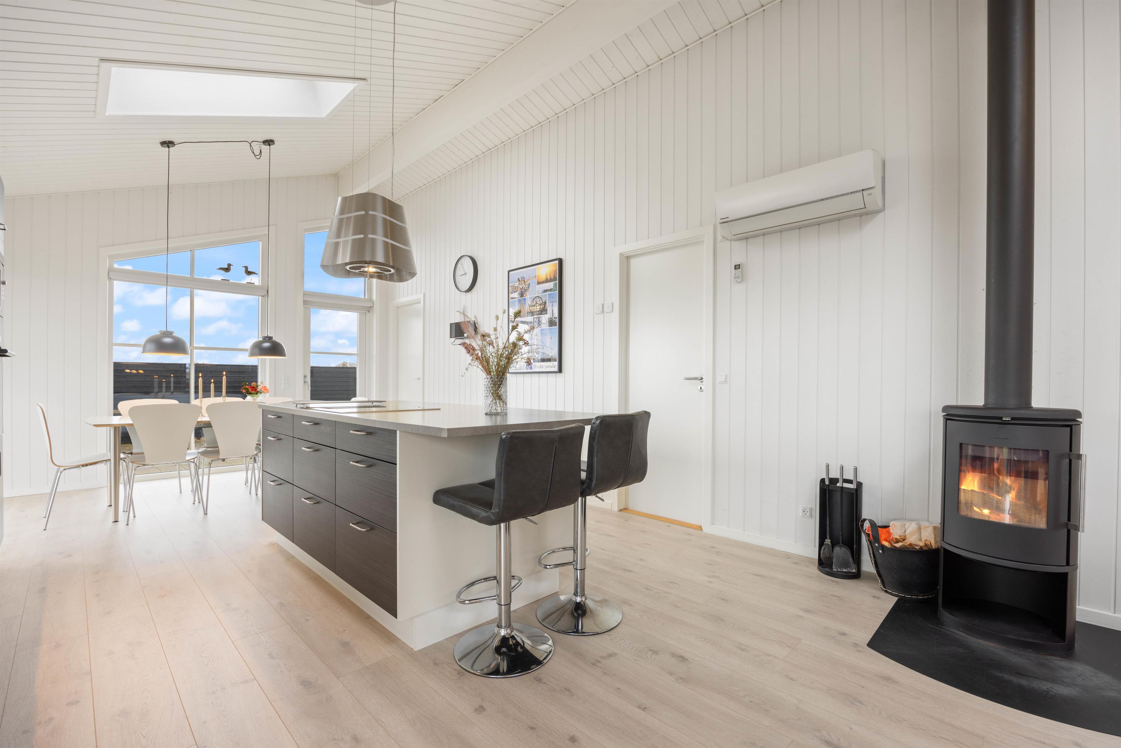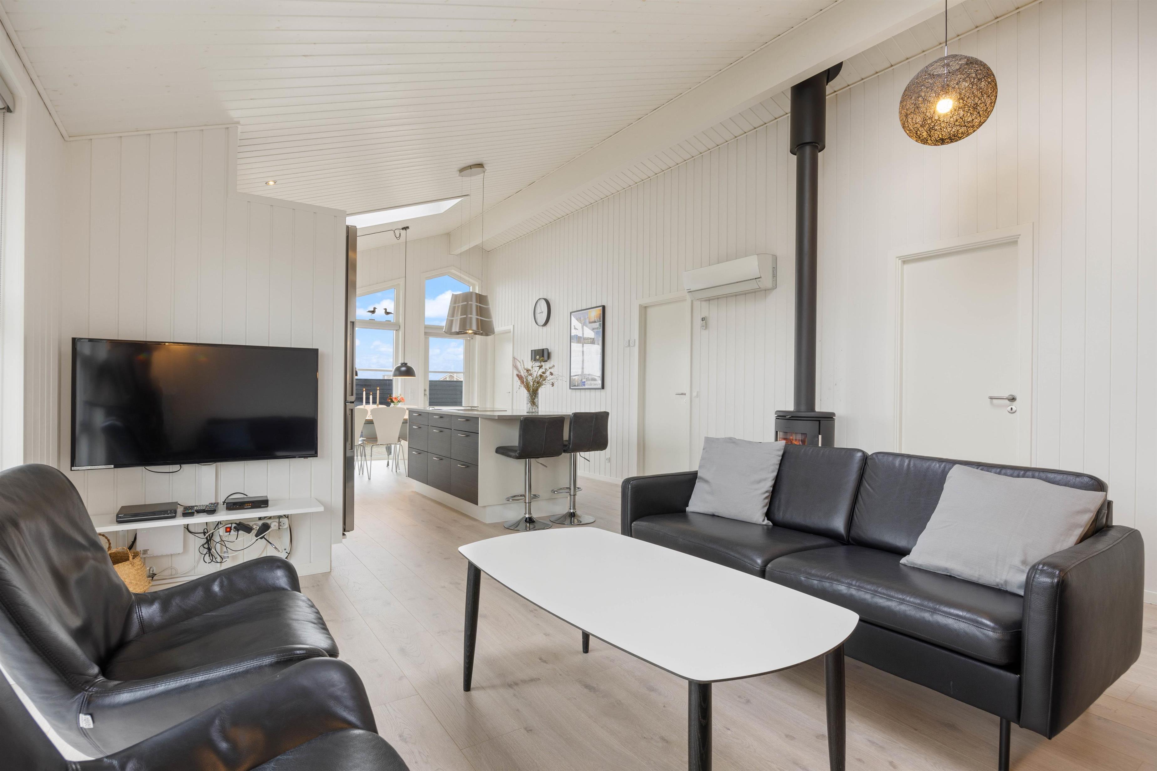 The kitchen is situated in the western part of the house, between the dining and living areas. It comes equipped with a 225-litre freezer, microwave and dishwasher. The living room features practical leather furniture, a wood-burning stove, large flat-screen TV, free Wi-Fi internet and an energy-efficient heat pump. One dog is welcome in the holiday home.