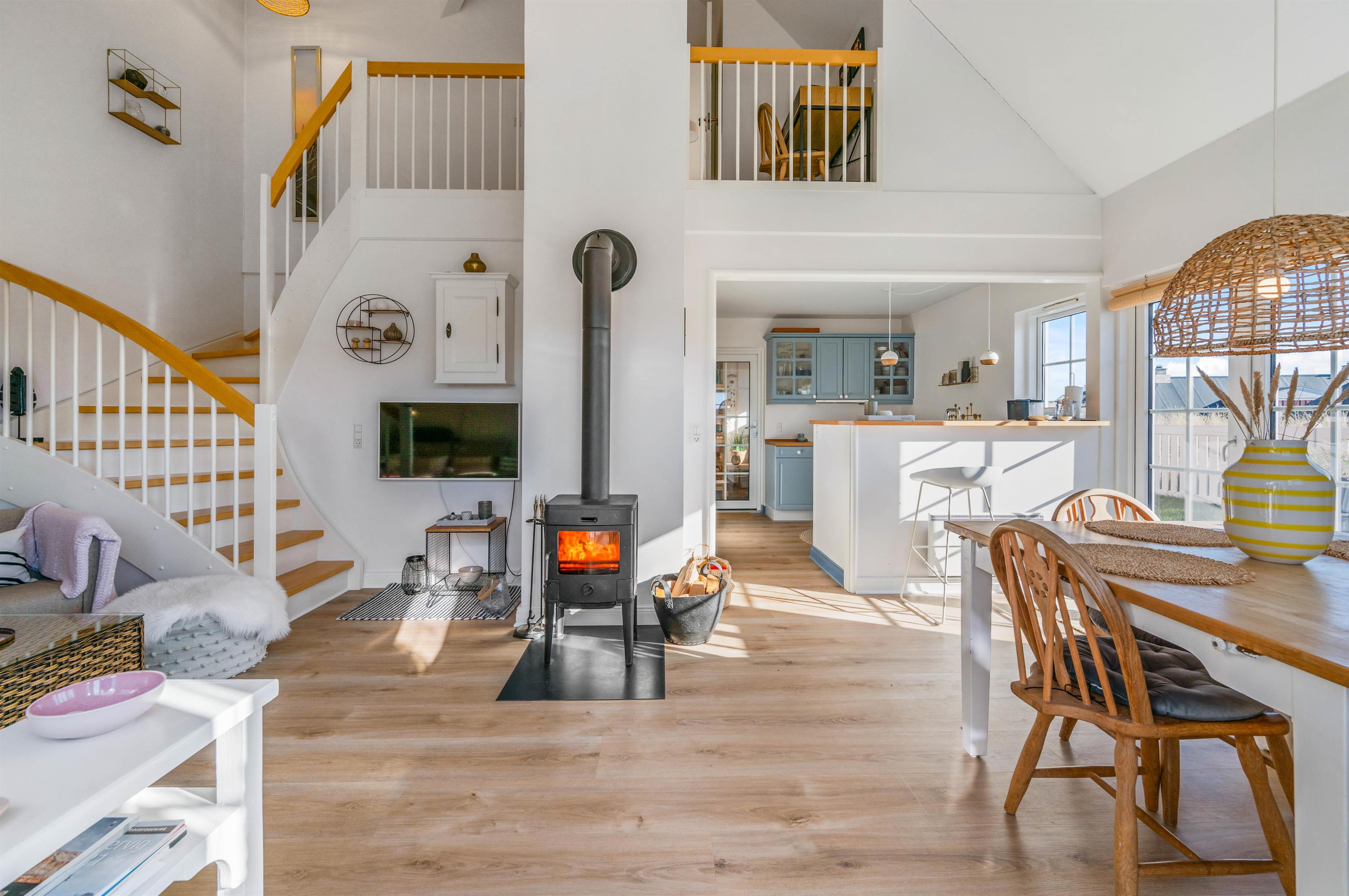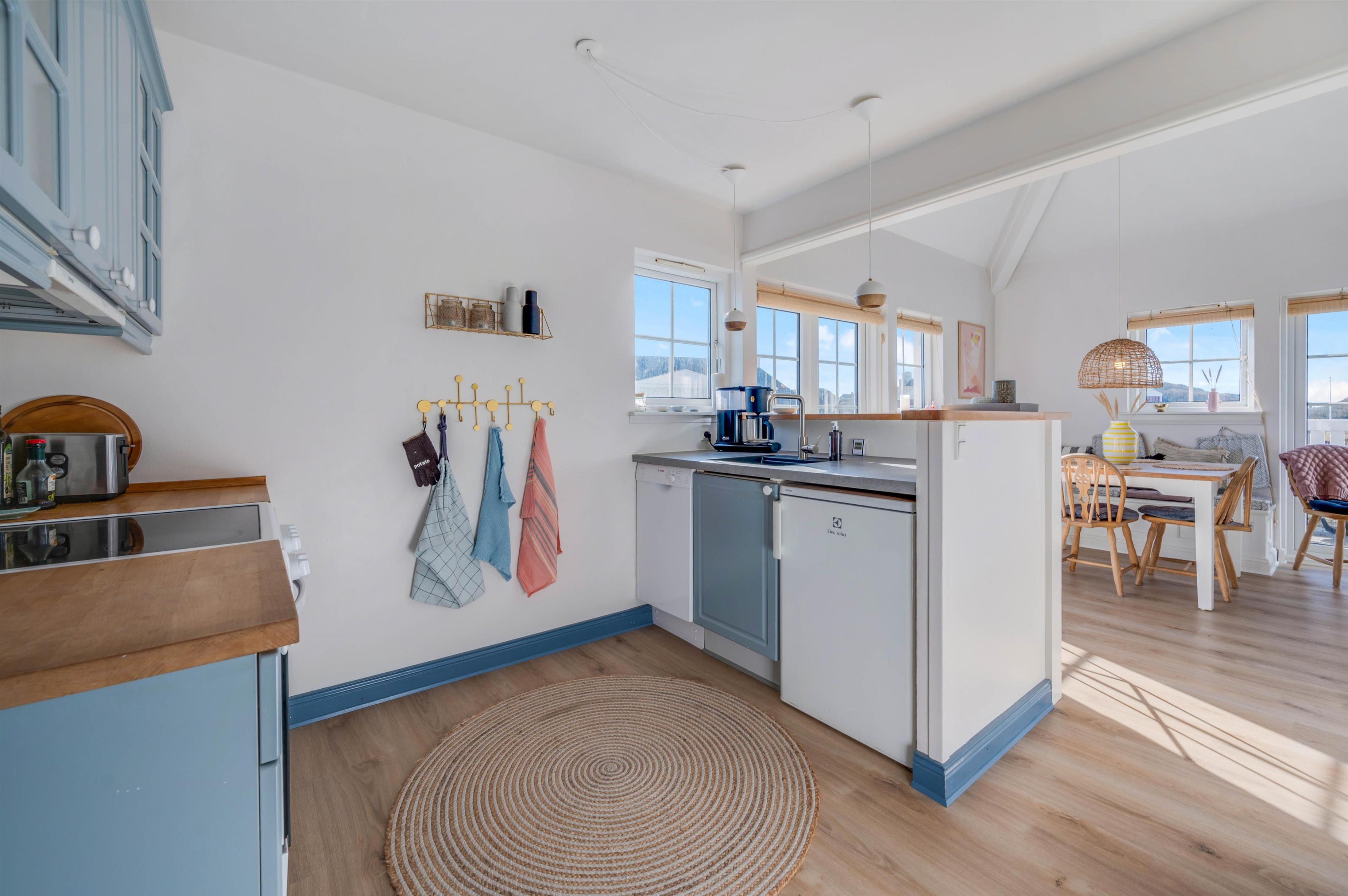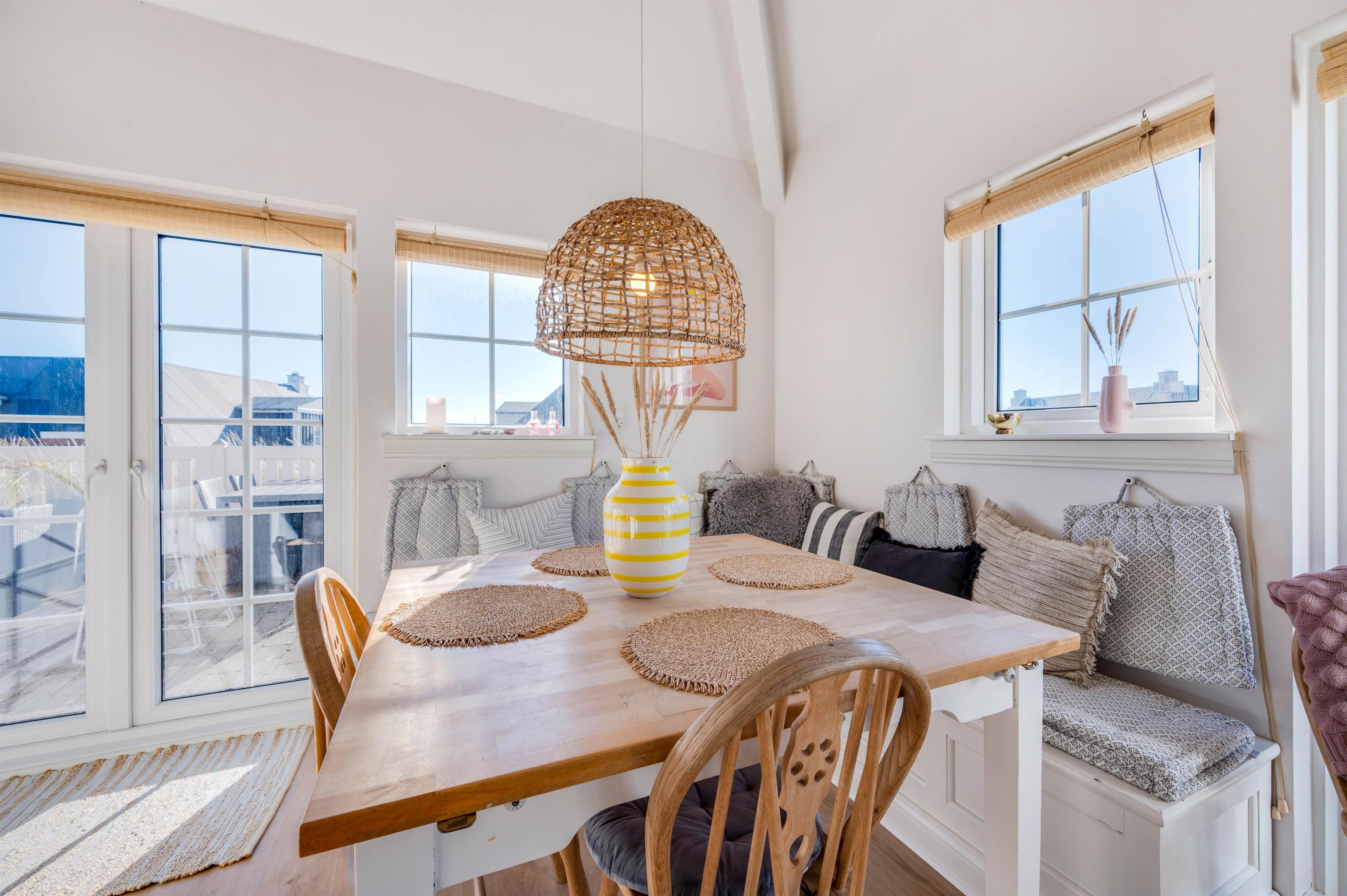 Upon entering your holiday apartment at Badevej 20, you'll notice the thoughtful interior design and decoration. The tasteful furnishings create a cohesive theme throughout the apartment. You'll feel at home straight away. The 90-square-metre apartment is spread across two floors. The living area with open-plan kitchen and bathroom with separate WC are on the ground floor. The two bedrooms, each with double beds, are located upstairs.
