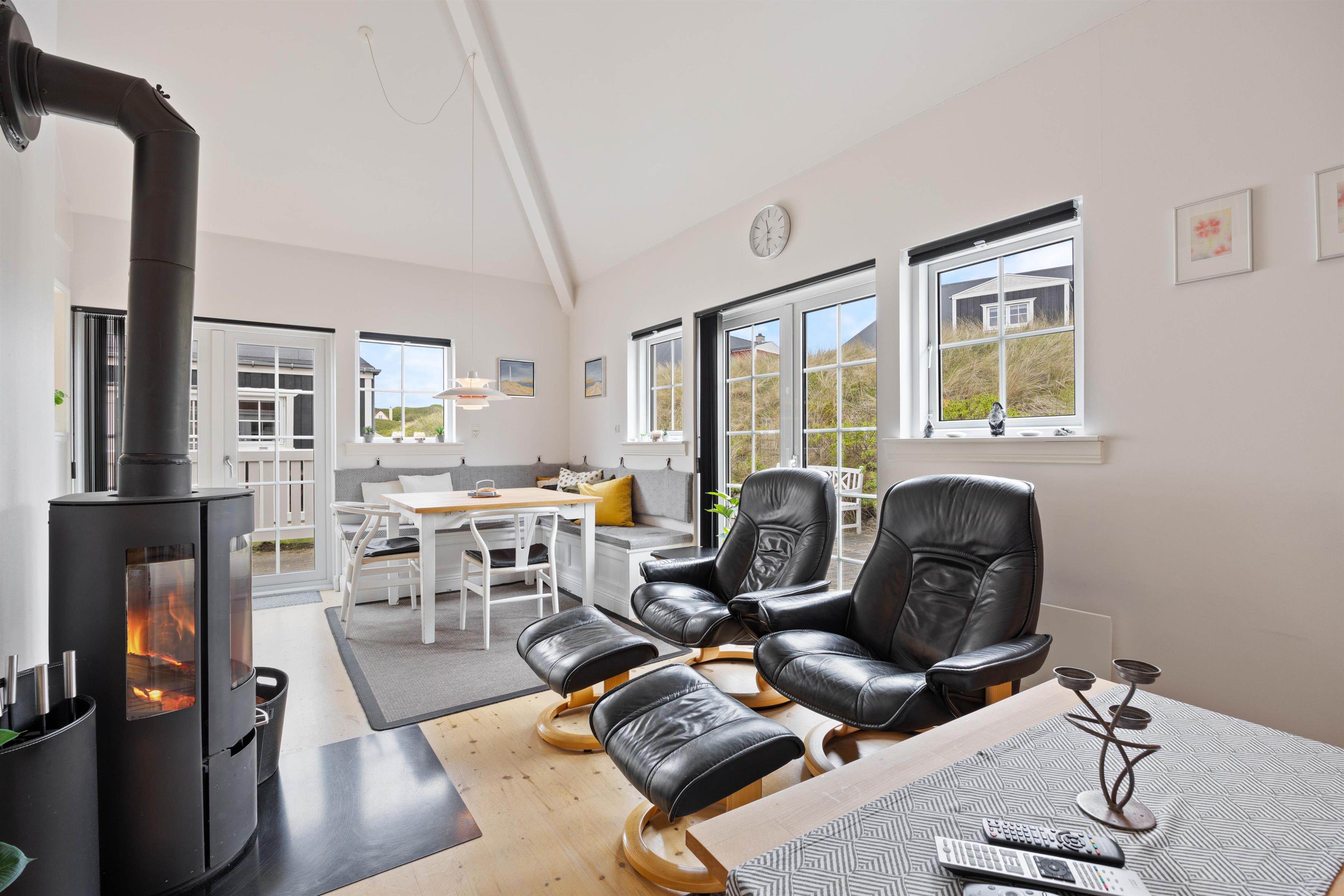 The ground floor living and dining area features a sofa, two large leather armchairs with footstools - perfect for enjoying an evening in front of the Smart TV (equipped with Chromecast). Light the fireplace during cold weather for extra cosiness. The energy-efficient heat pump ensures comfortable temperatures all year round.