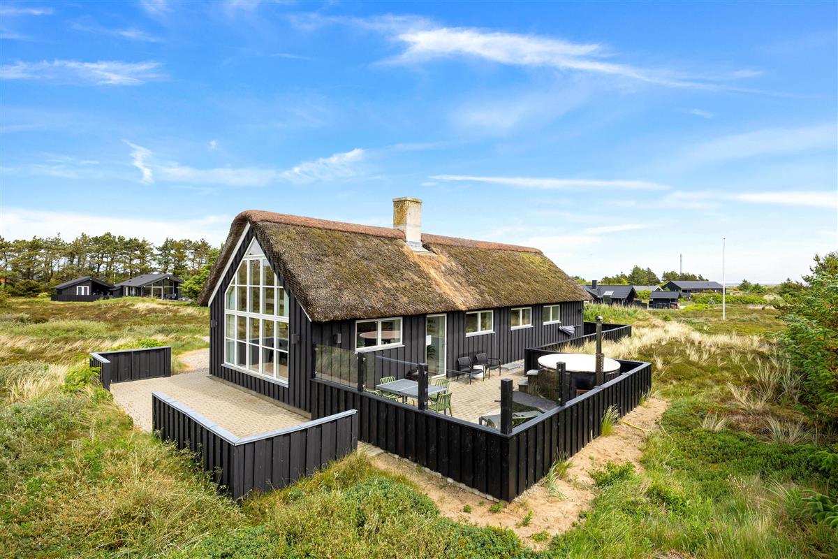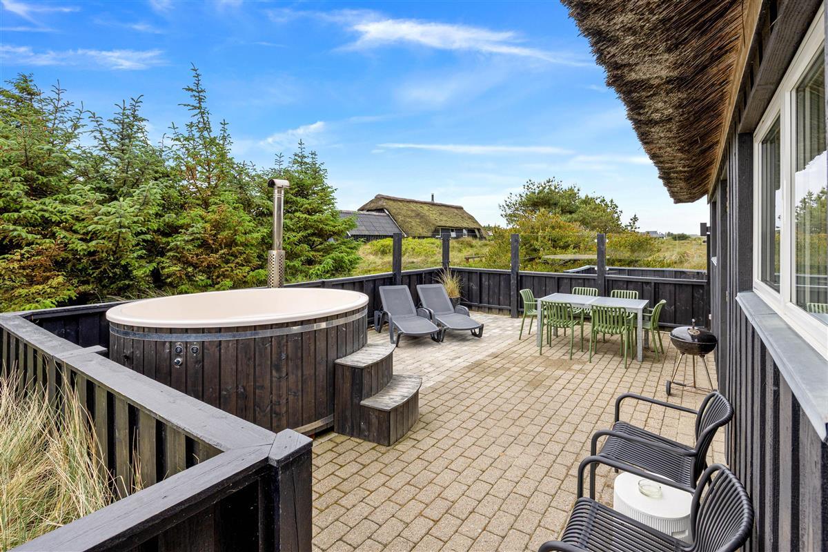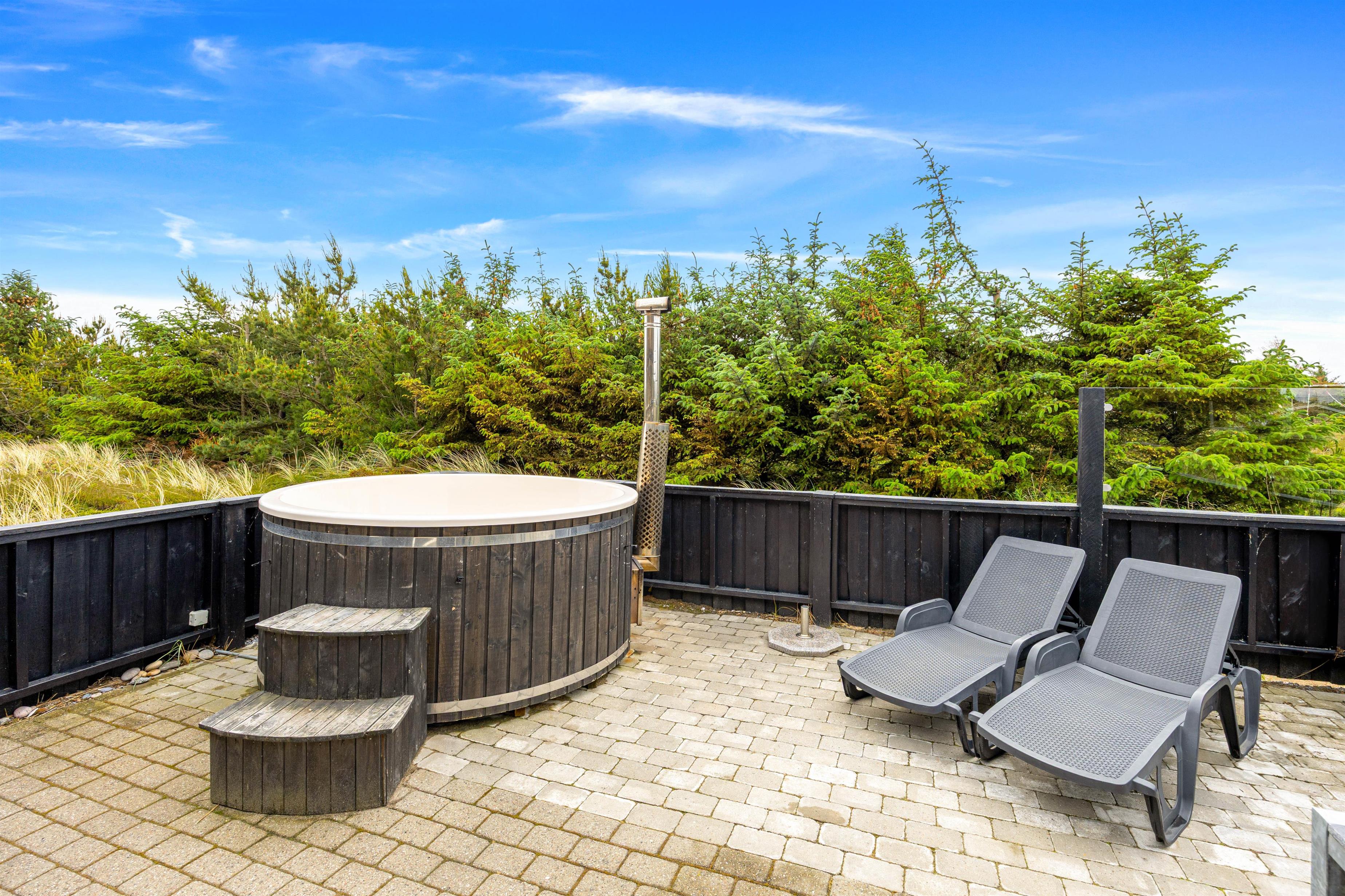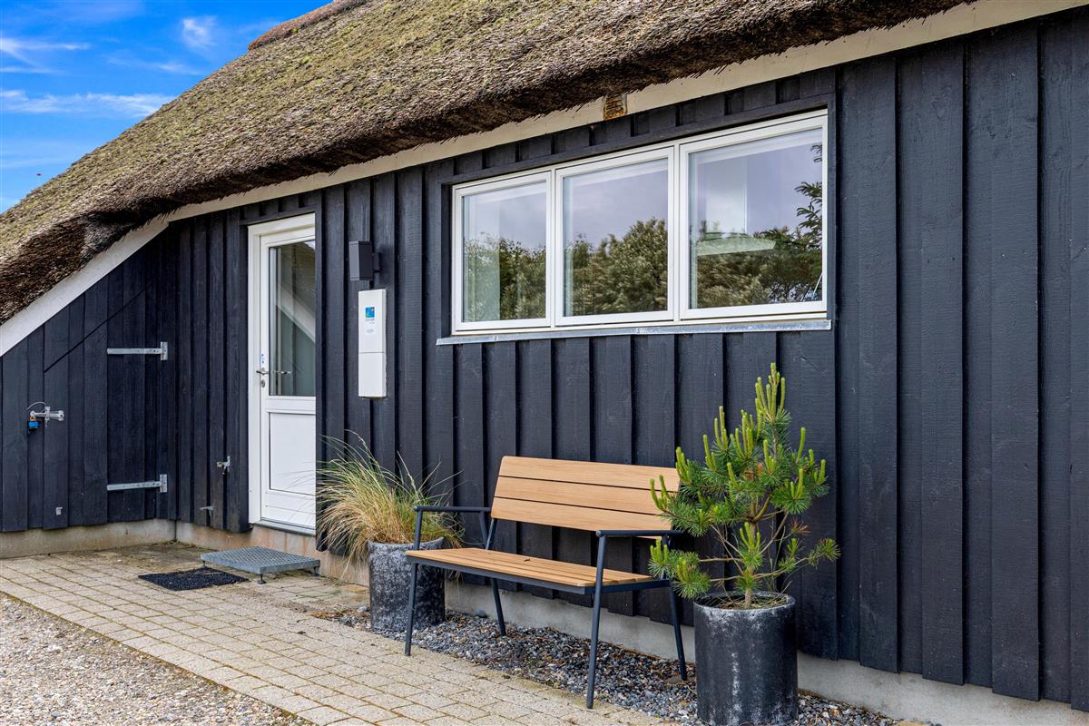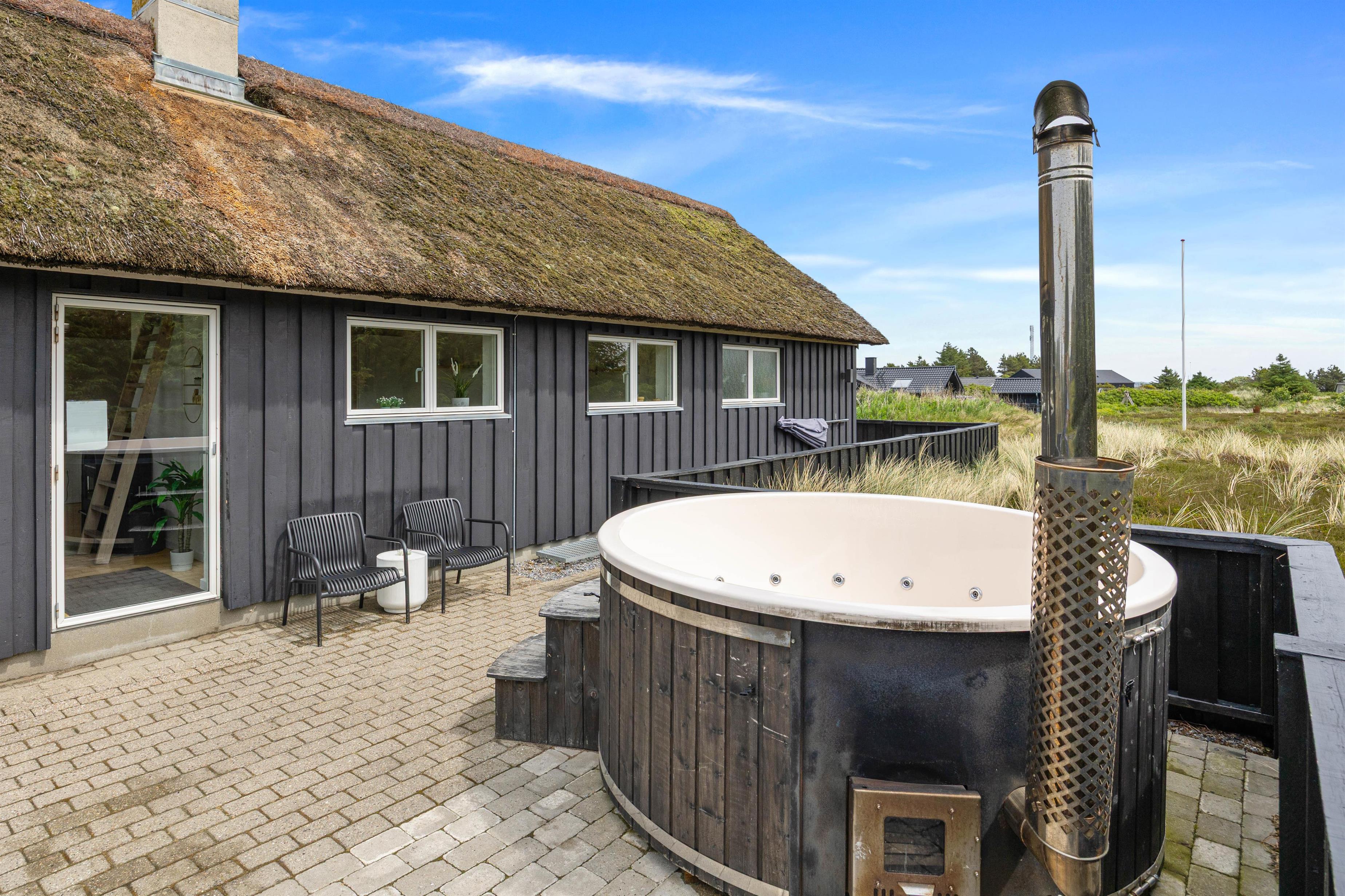 The 2,463-square-metre plot is situated in the beautiful natural dunes of Søndervig. After a long day in the fresh air, you can put your feet up in the sauna or whirlpool to recharge. For those who prefer outdoor relaxation, the hot tub allows you to enjoy wonderfully warm water while breathing in the fresh North Sea air. The hot tub features LED lighting and a massage system with 12 air jets - certainly a special highlight for ultimate relaxation.