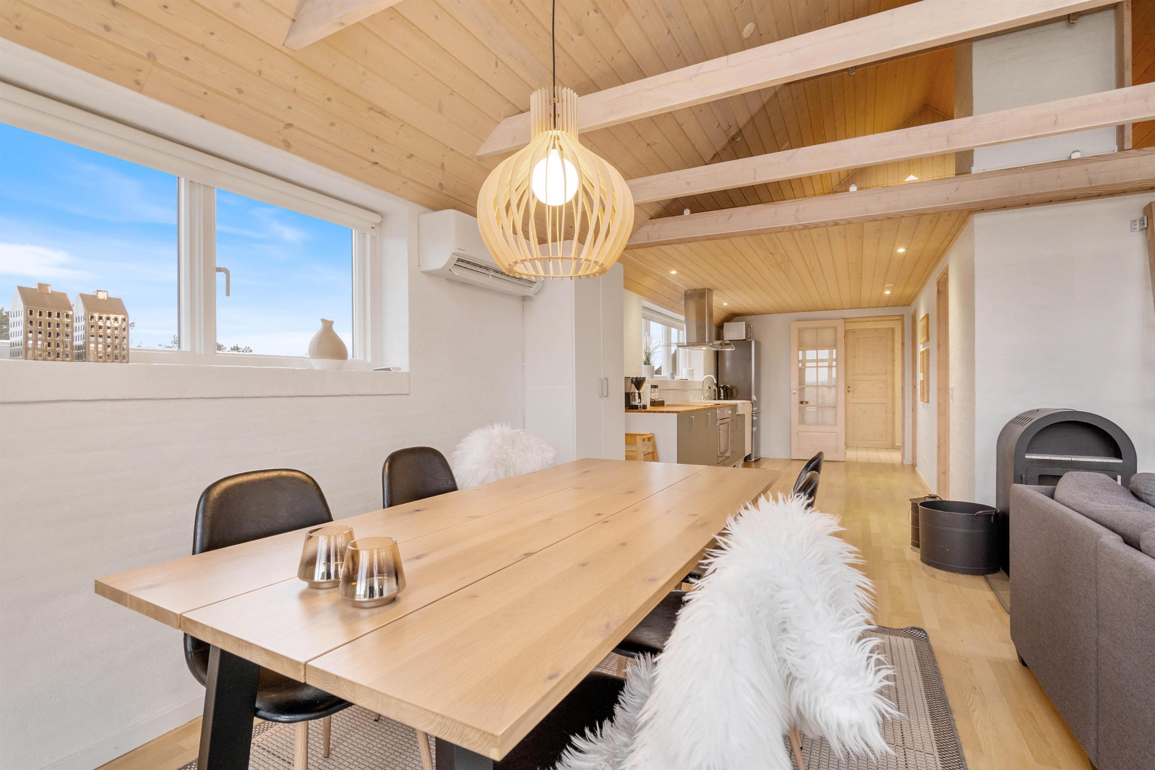 This modern holiday home, accommodating up to 6 people and 1 dog, provides everything needed for a relaxing holiday. Located at Frans Julius Vej 21 in the southern part of Søndervig, just 700 metres from the beach, the holiday home features a wood-burning stove and efficient heat pump. Warm up in the sauna and whirlpool, or enjoy the outdoor hot tub under the open sky - a wonderful experience even during the cooler months.
