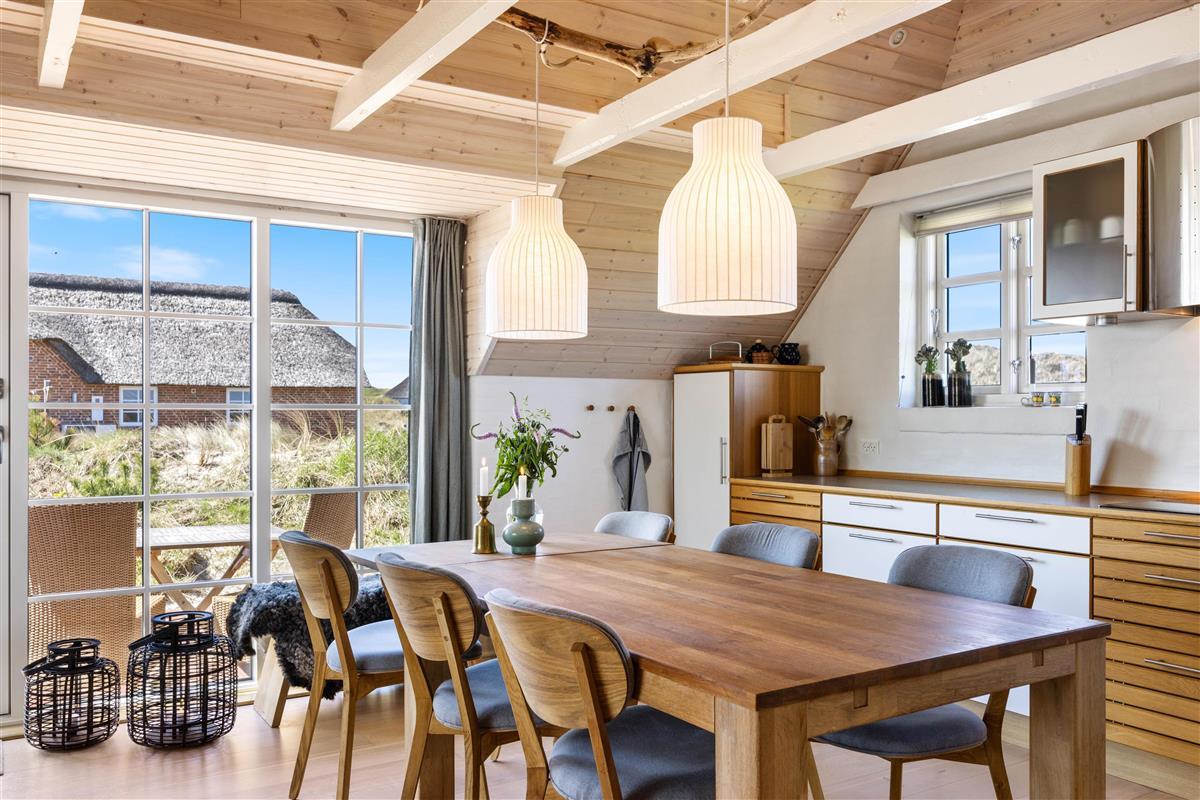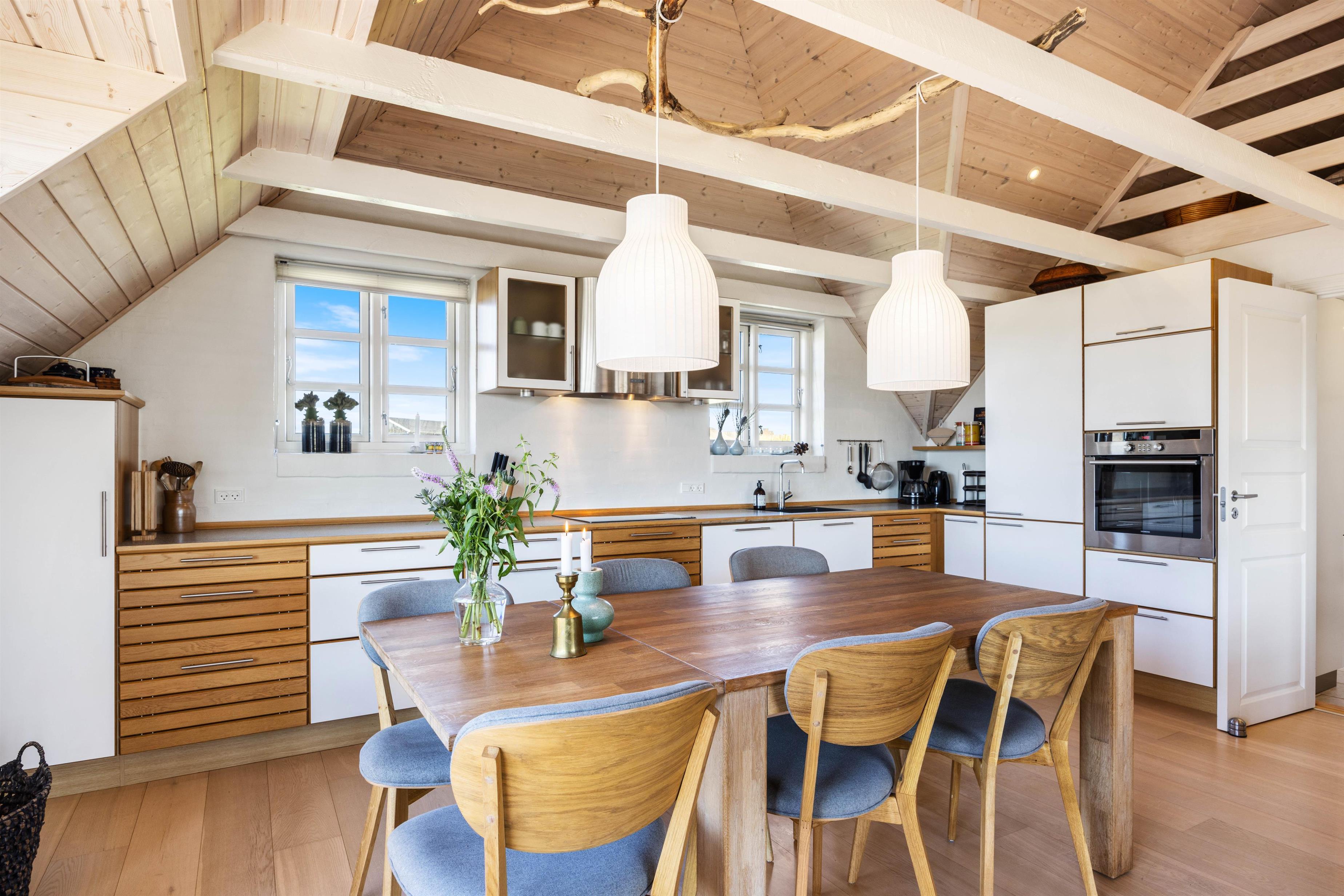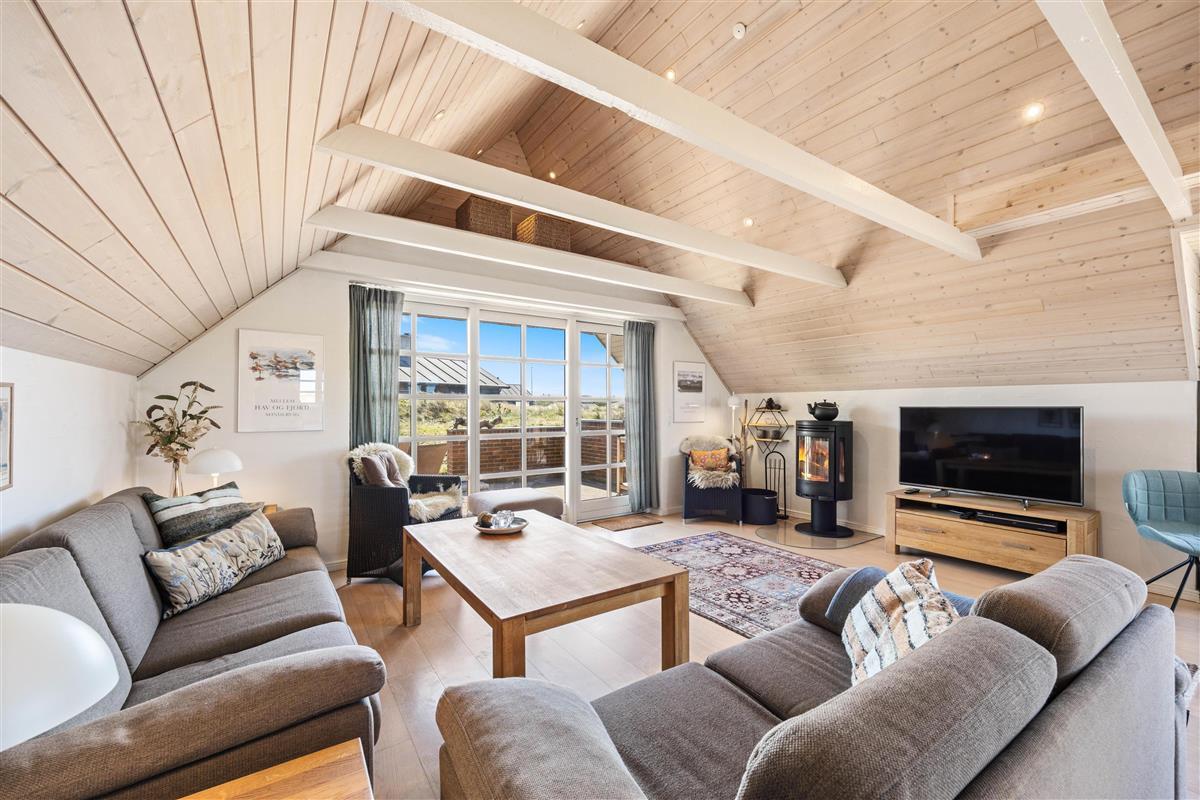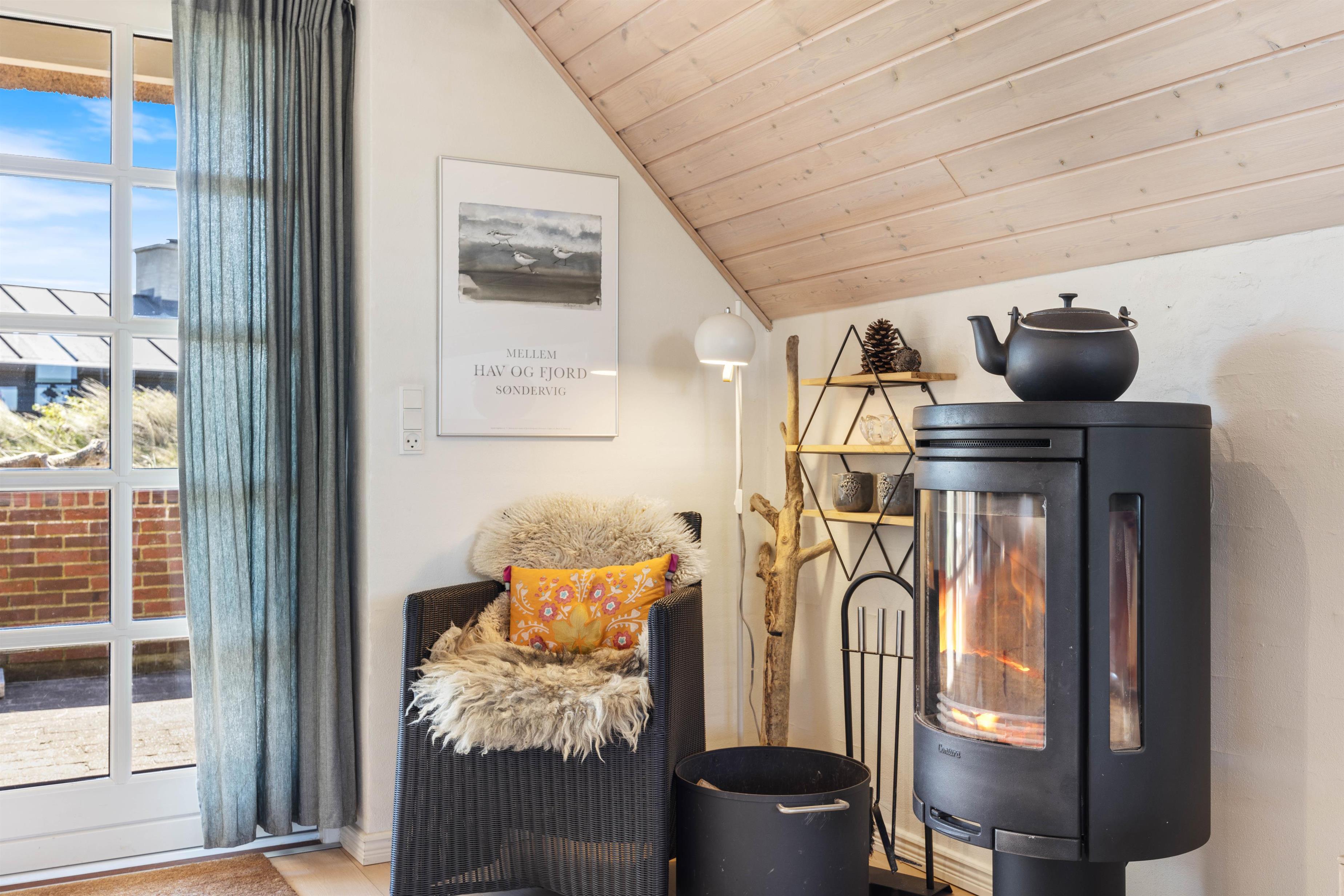 The holiday home nestles charmingly among the surrounding dunes - perfect for enjoying nature from the terrace. Inside, you'll be welcomed by high ceilings, light colours and modern furniture. The atmosphere is relaxed and pleasant, with thoughtful attention to detail adding a tasteful touch to the décor. The classic wood-burning stove provides warmth throughout the year, while the surrounding dunes offer natural shelter.